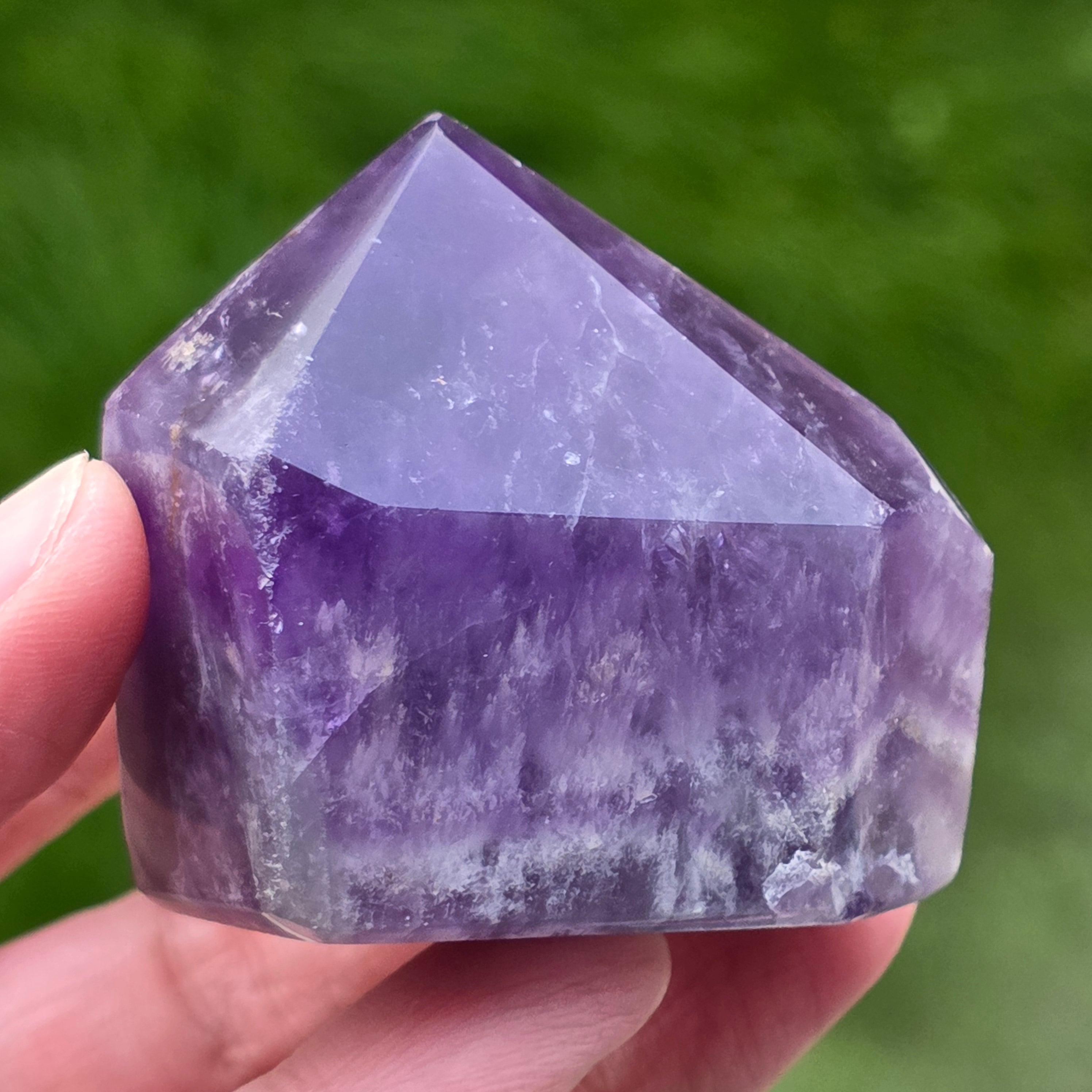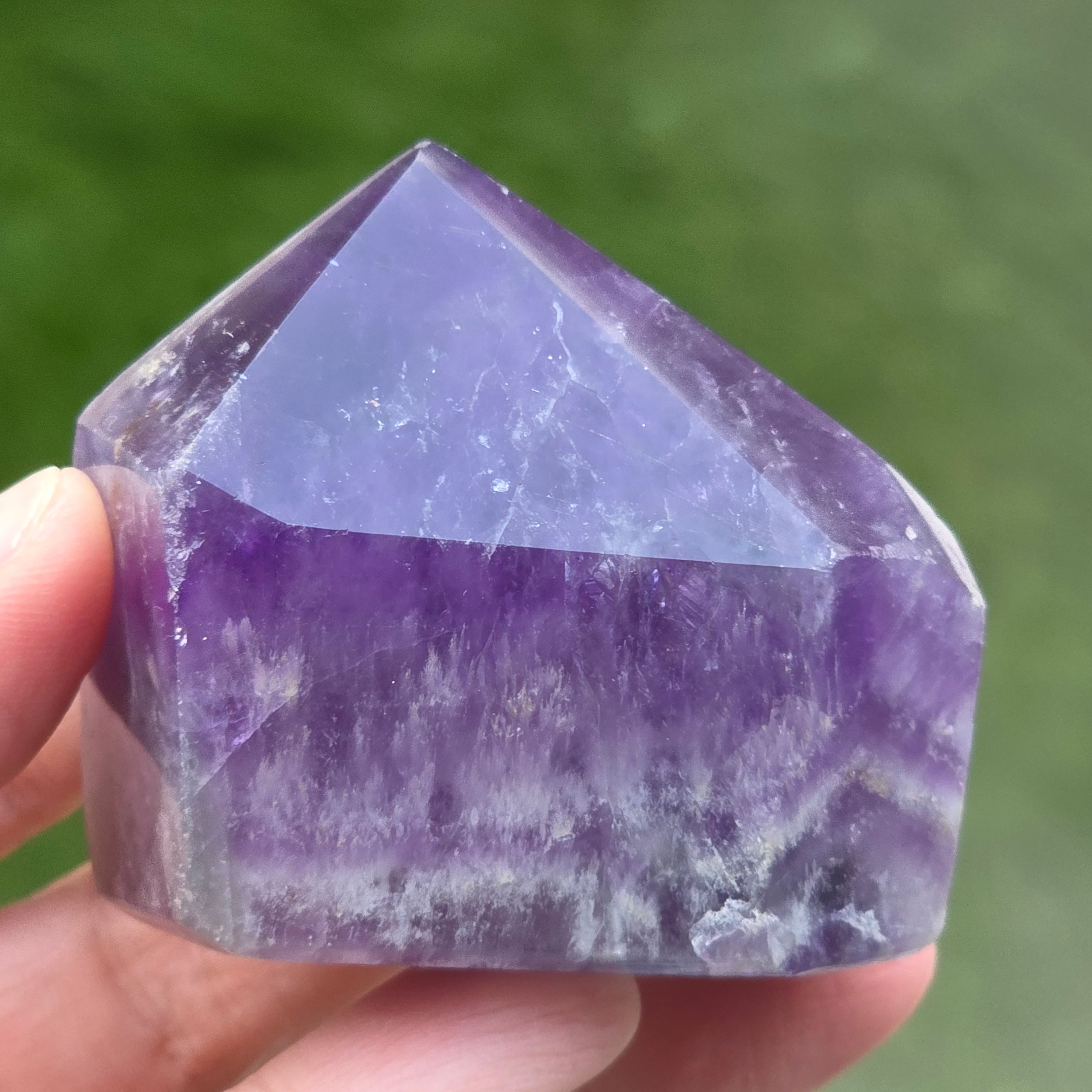 Chevron ametyst je známy pre svoje spojenie s čakrami koruny a tretieho oka, zvyšuje intuíciu a schopnosť rozhodovania.