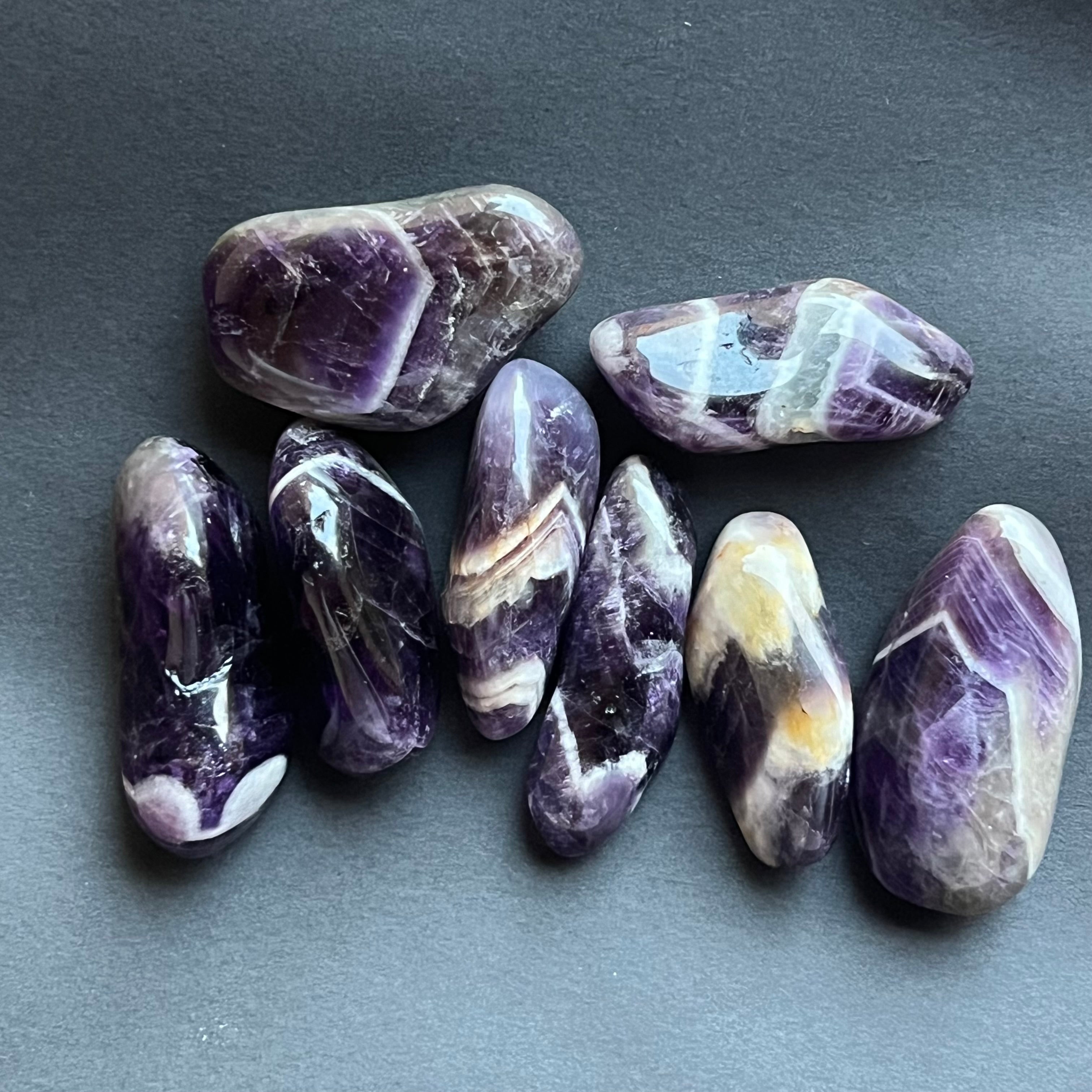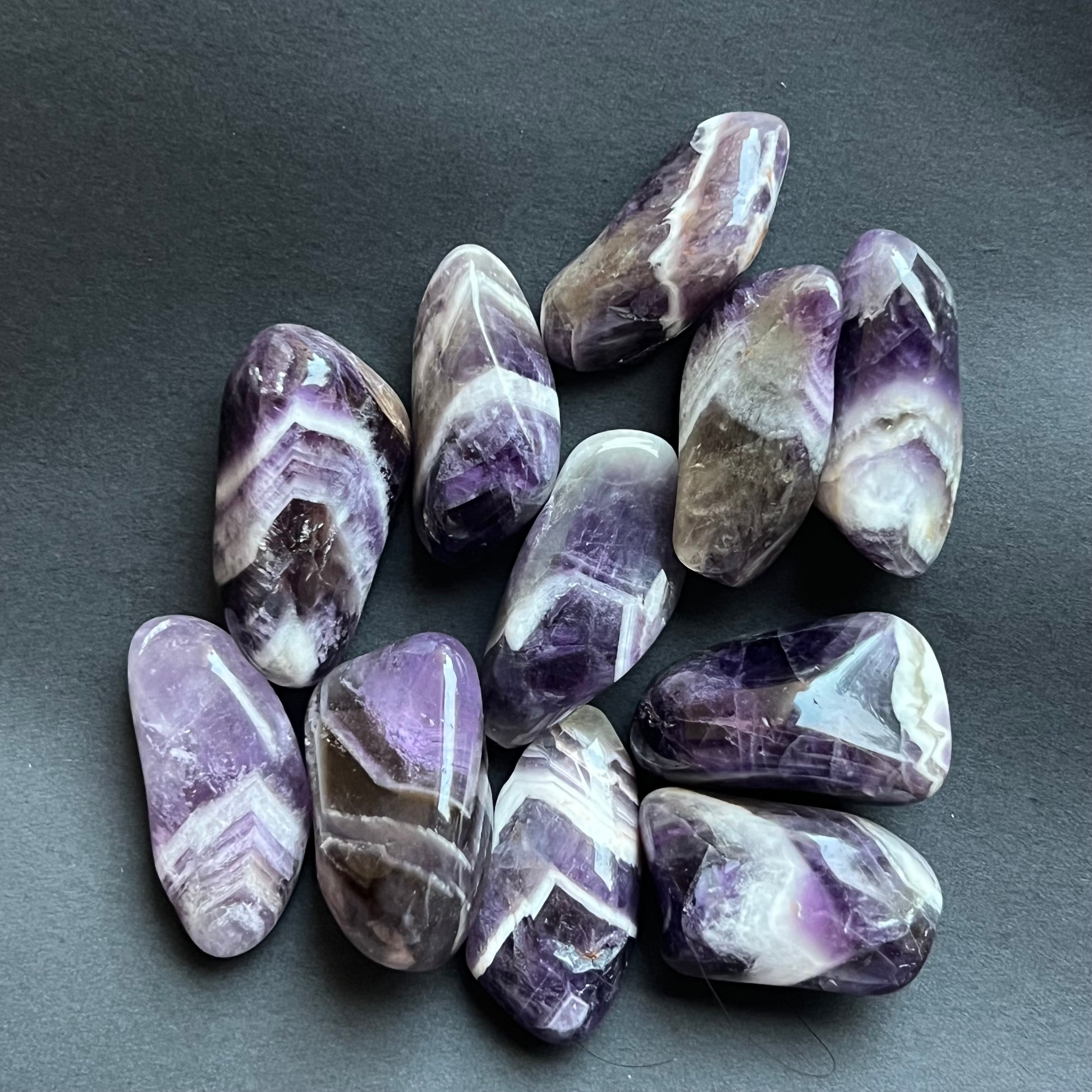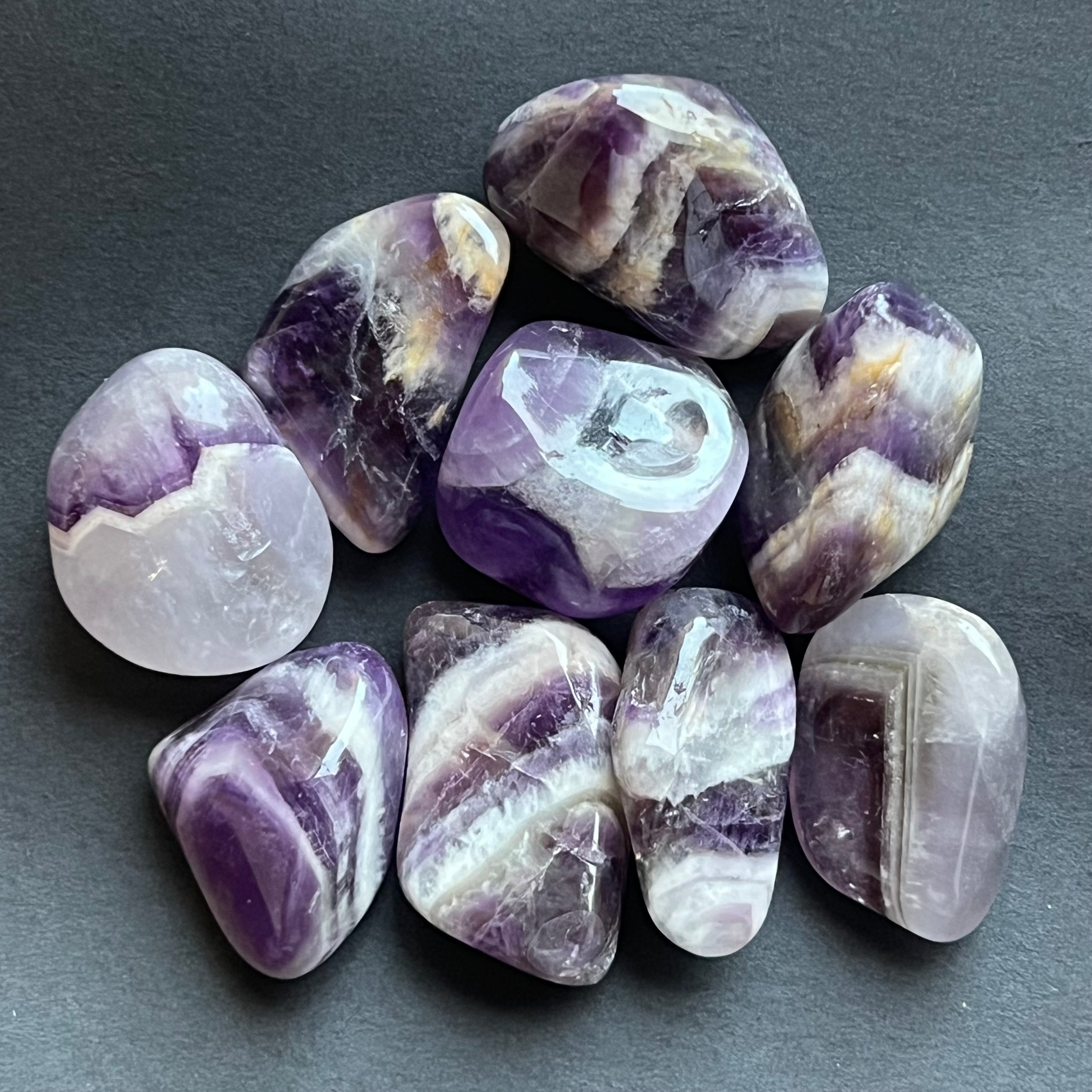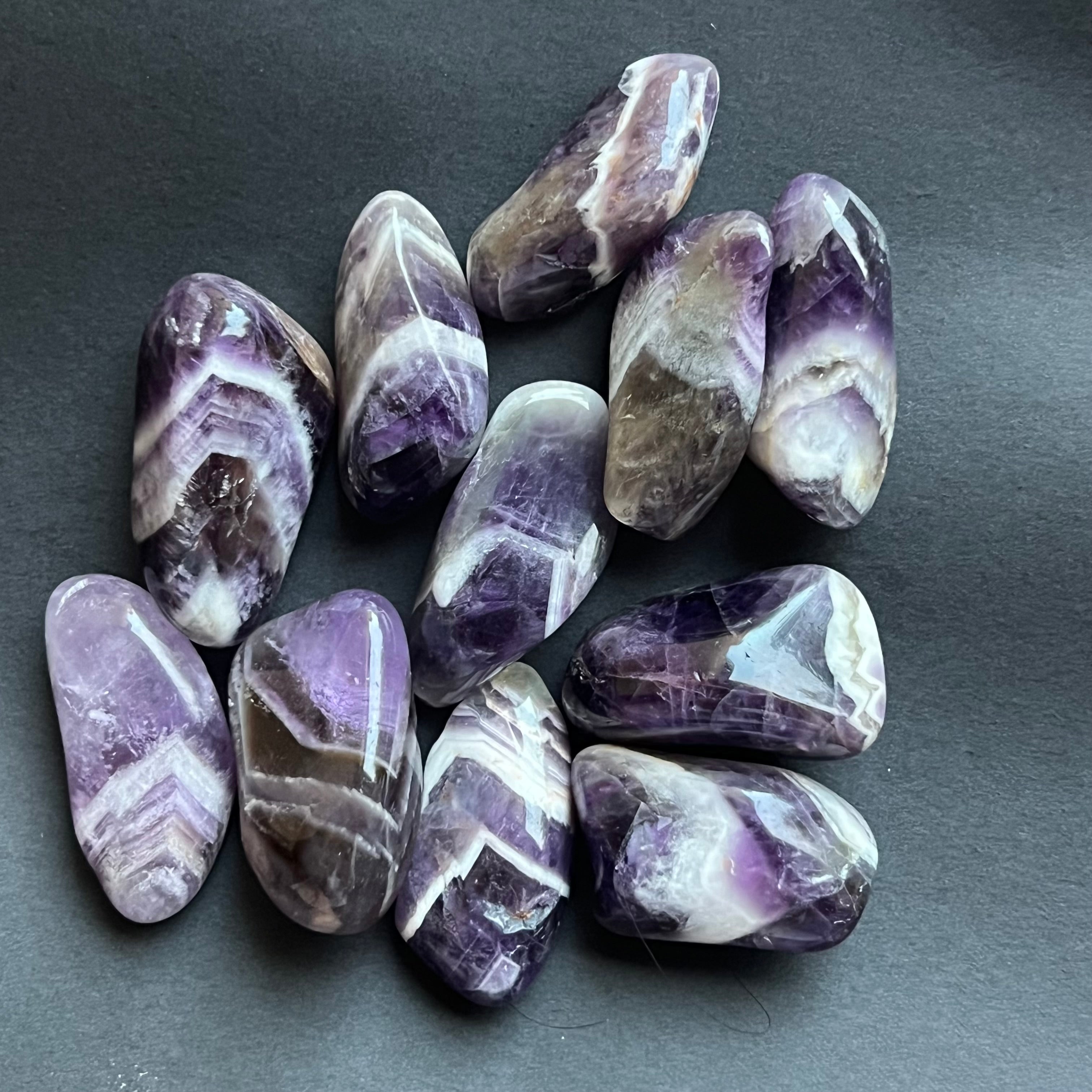 Chevron ametyst je známy svojím spojením s čakrou koruny a tretím okom, zvyšuje intuíciu a schopnosť rozhodovania.