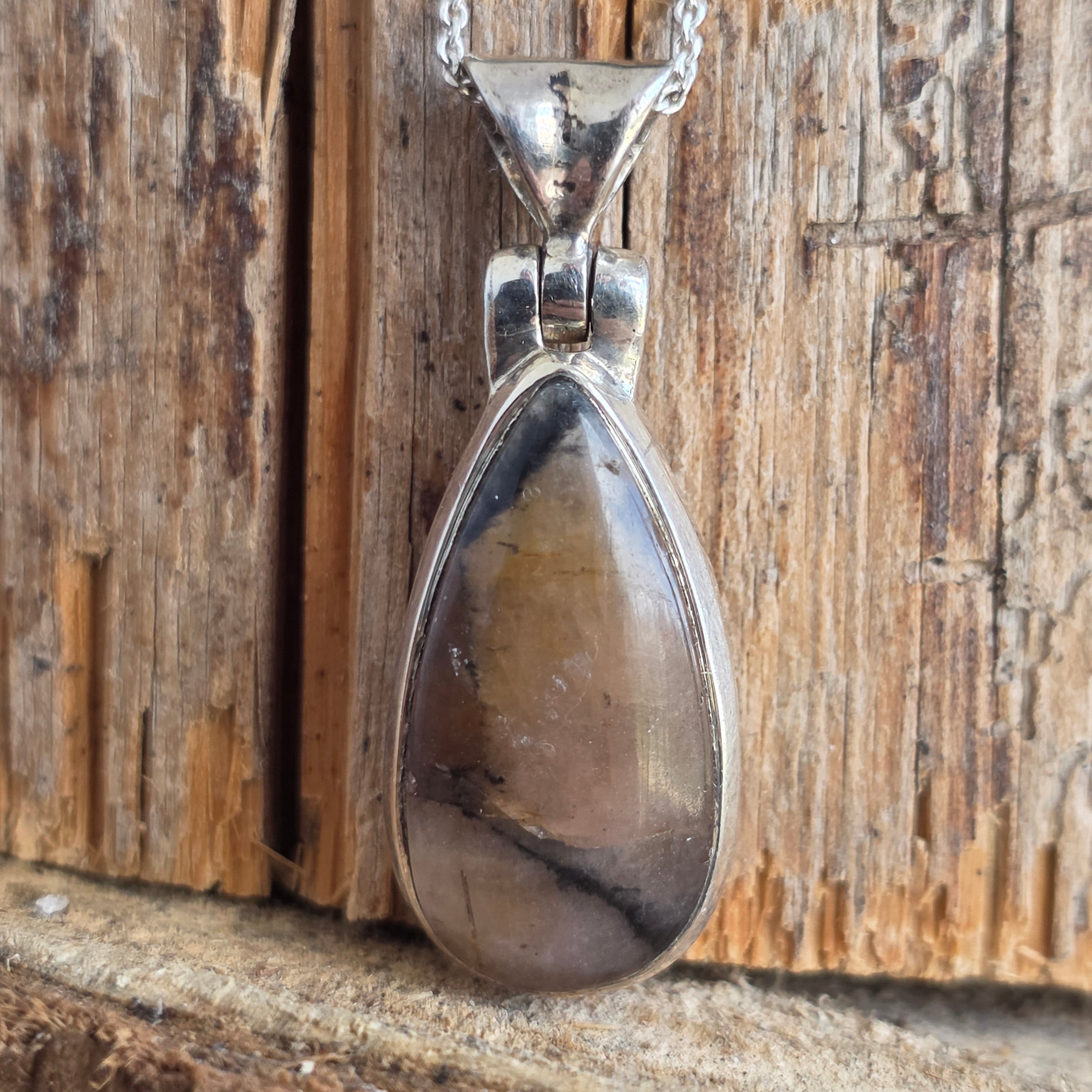 Tento 925 strieborný chiastolitový prívesok vyniká svojim výrazným prírodným vzorom so špecifickým krížovým tvarom viditeľným vo vnútri kameňa. Jeho jedinečný vzhľad z neho robí kúsok so silnou osobnosťou.
