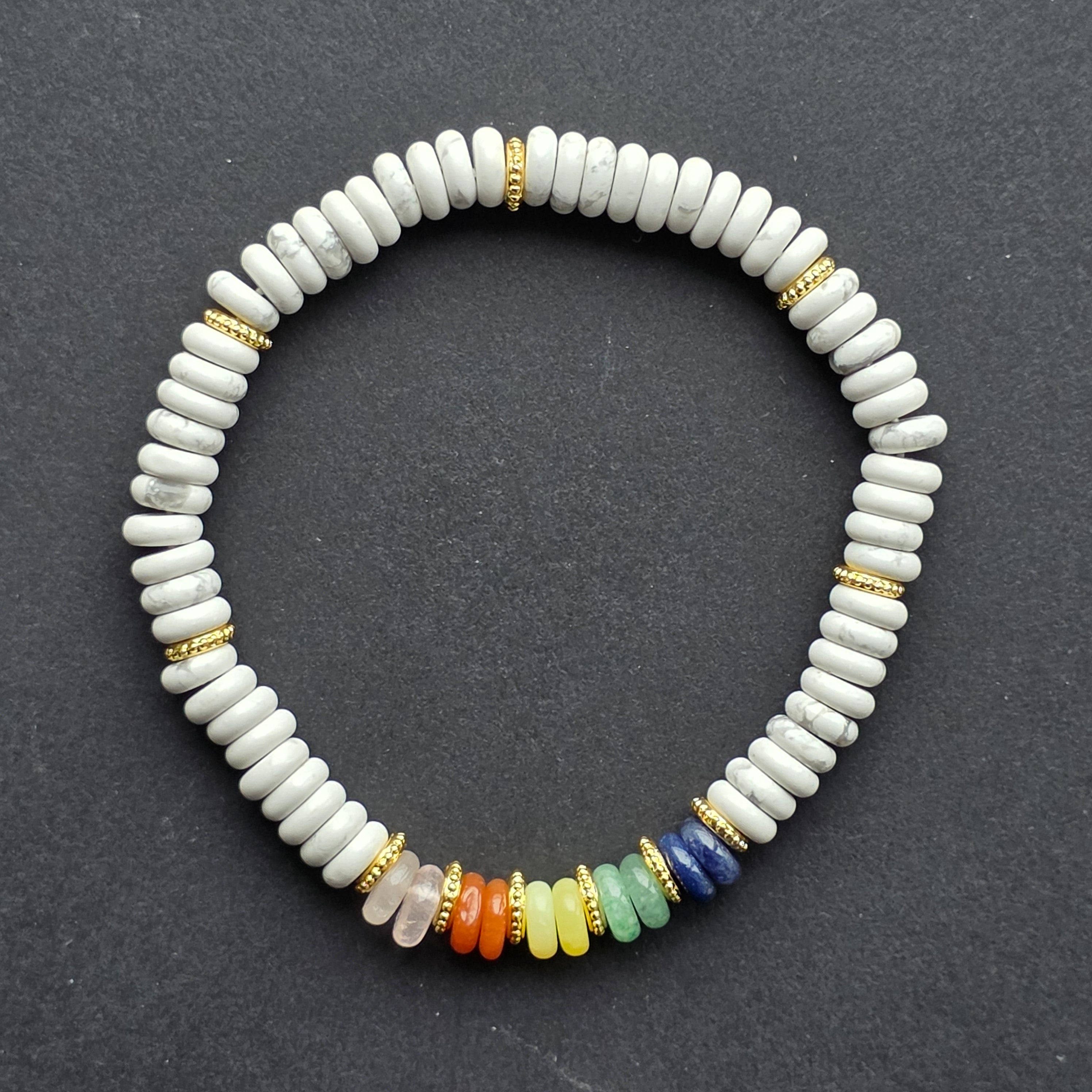 Náramok je vyrobený z prírodného bieleho howlitu, minerálu známeho jemnými líniami a pokojným, minimalistickým vzhľadom. Jemné disky vytvárajú textúru, ktorá je príjemná na dotyk, a mramorované biele odtiene ponúkajú čistú a neutrálnu eleganciu — ľahko laditeľnú s akýmkoľvek outfitom.