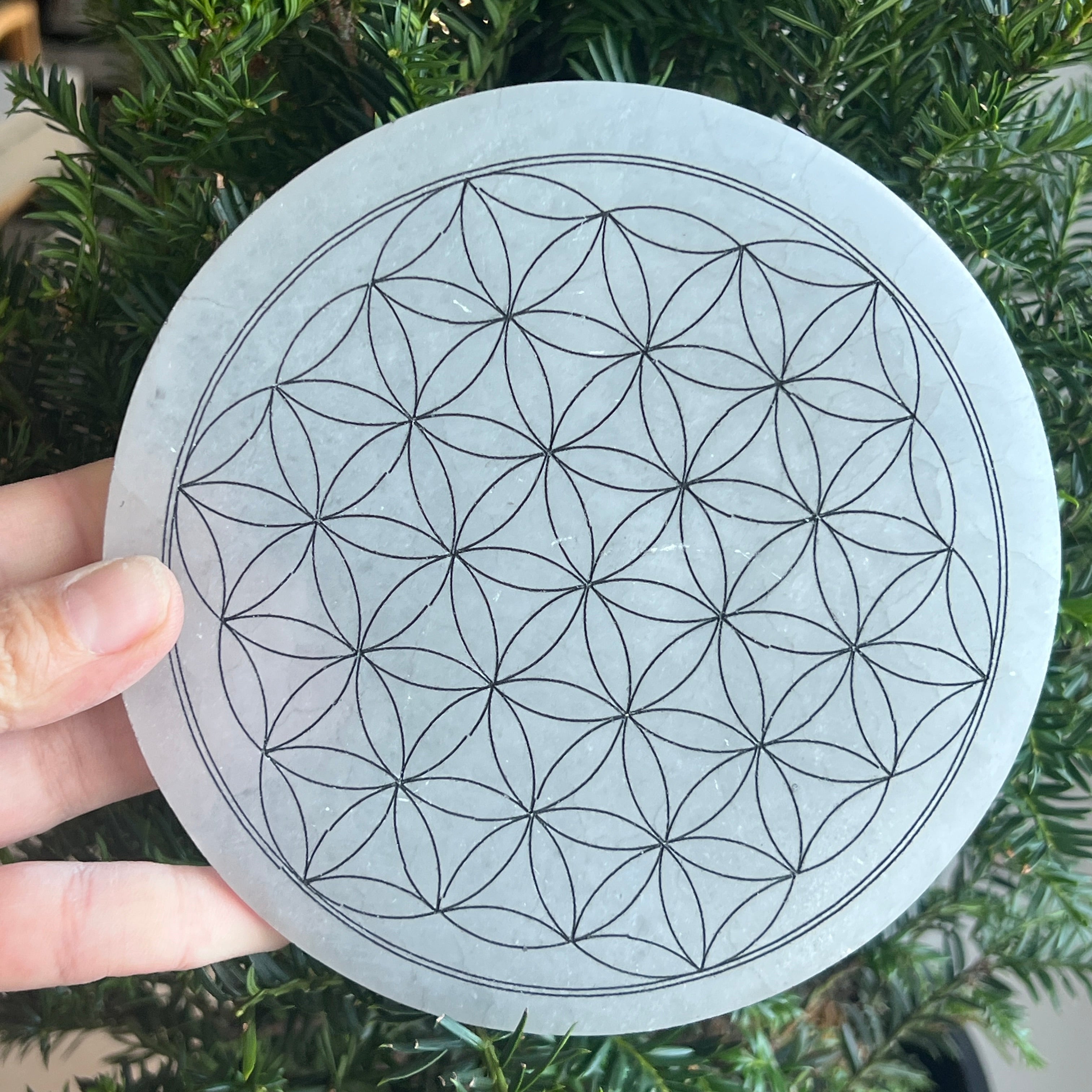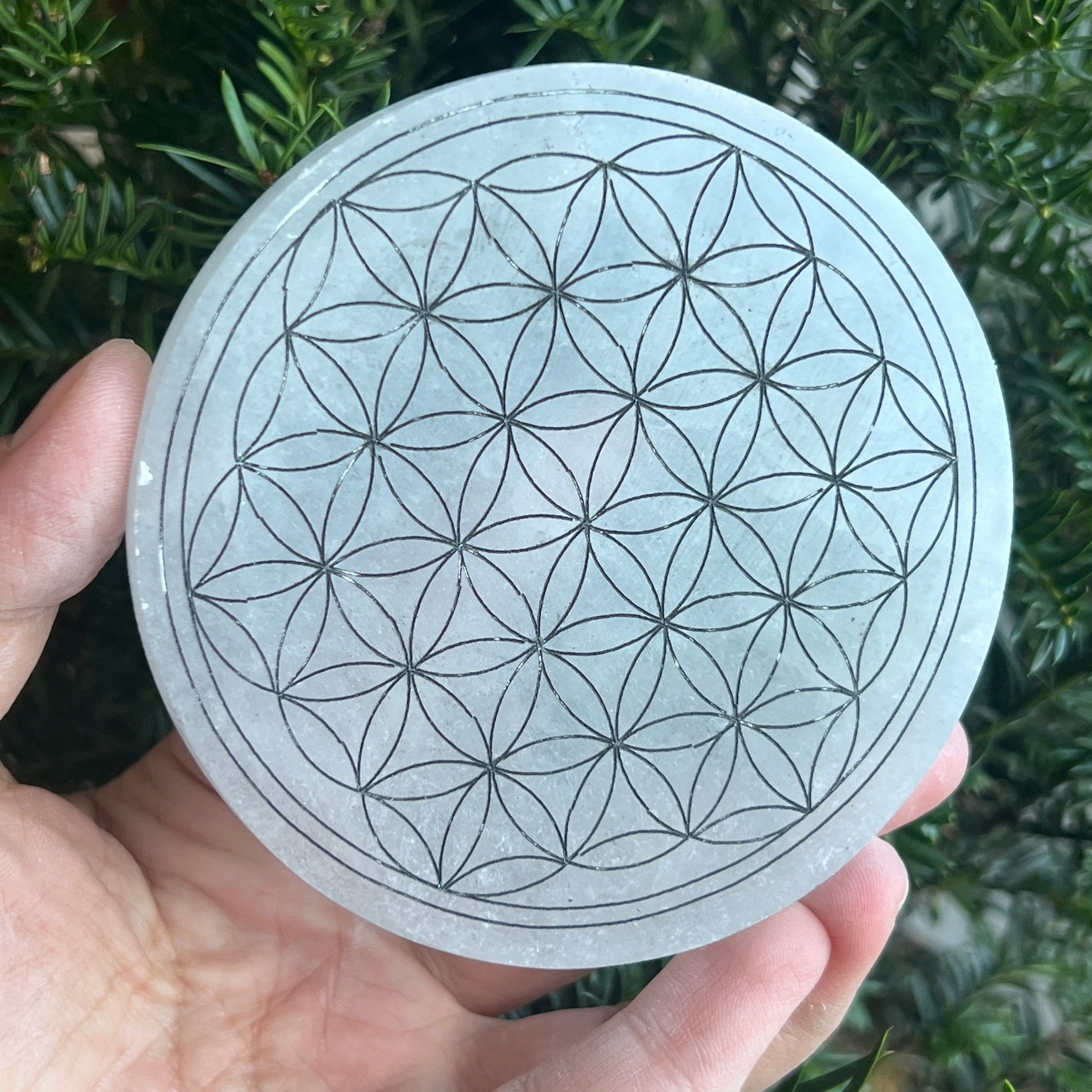 Vyber si Disk zo selenitu s Kvetom života / Flower of Life aby si priniesol do svojho života čistú energiu, harmóniu a ochranu. Jedinečný kúsok, ktorý spája svätú geometriu s jemným svetlom prírodného minerálu. 🤍✨