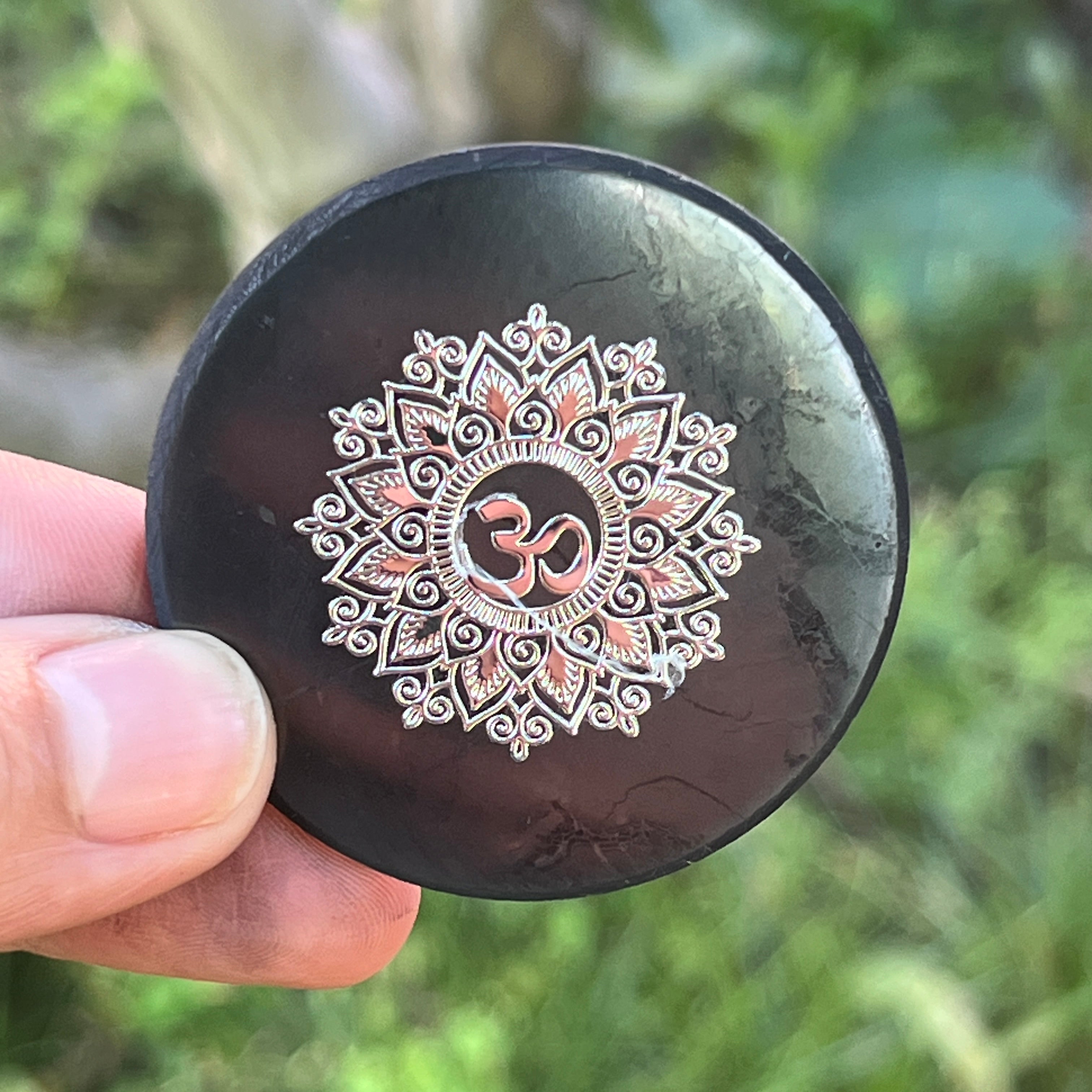 Disk zo šungitovej mandaly striebornej