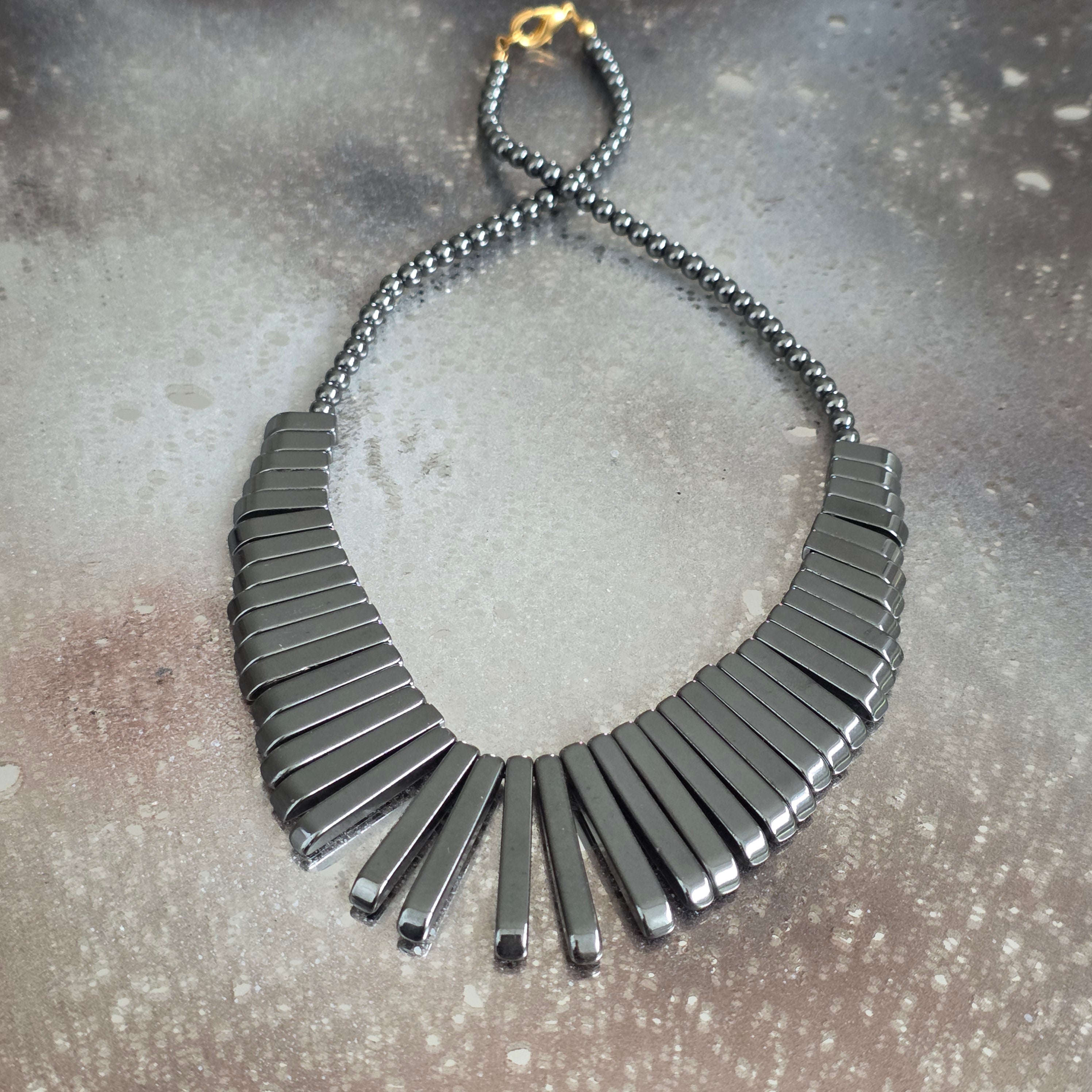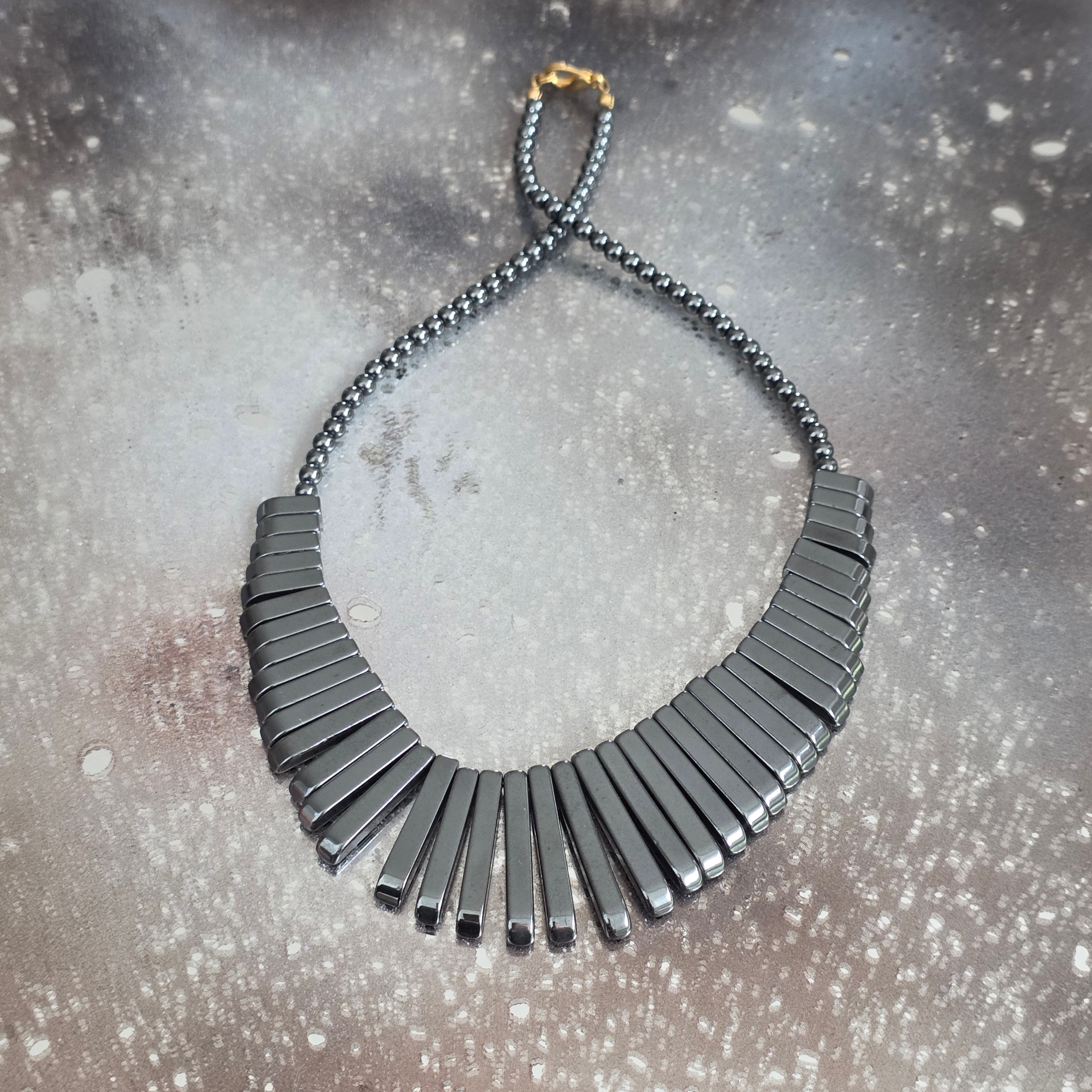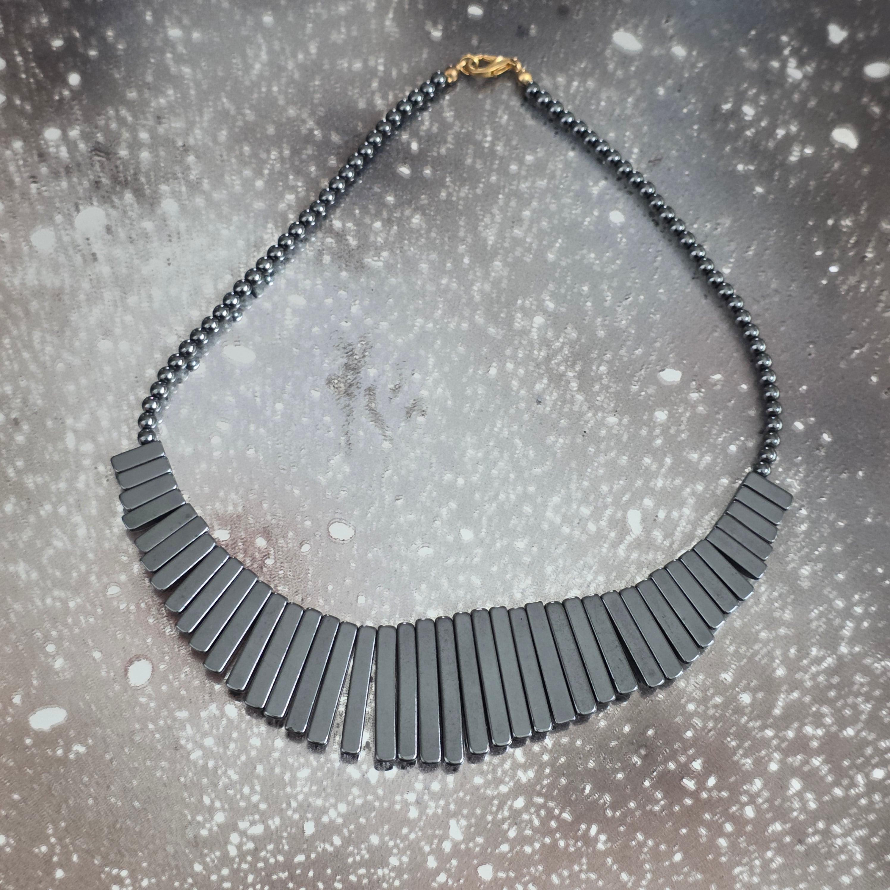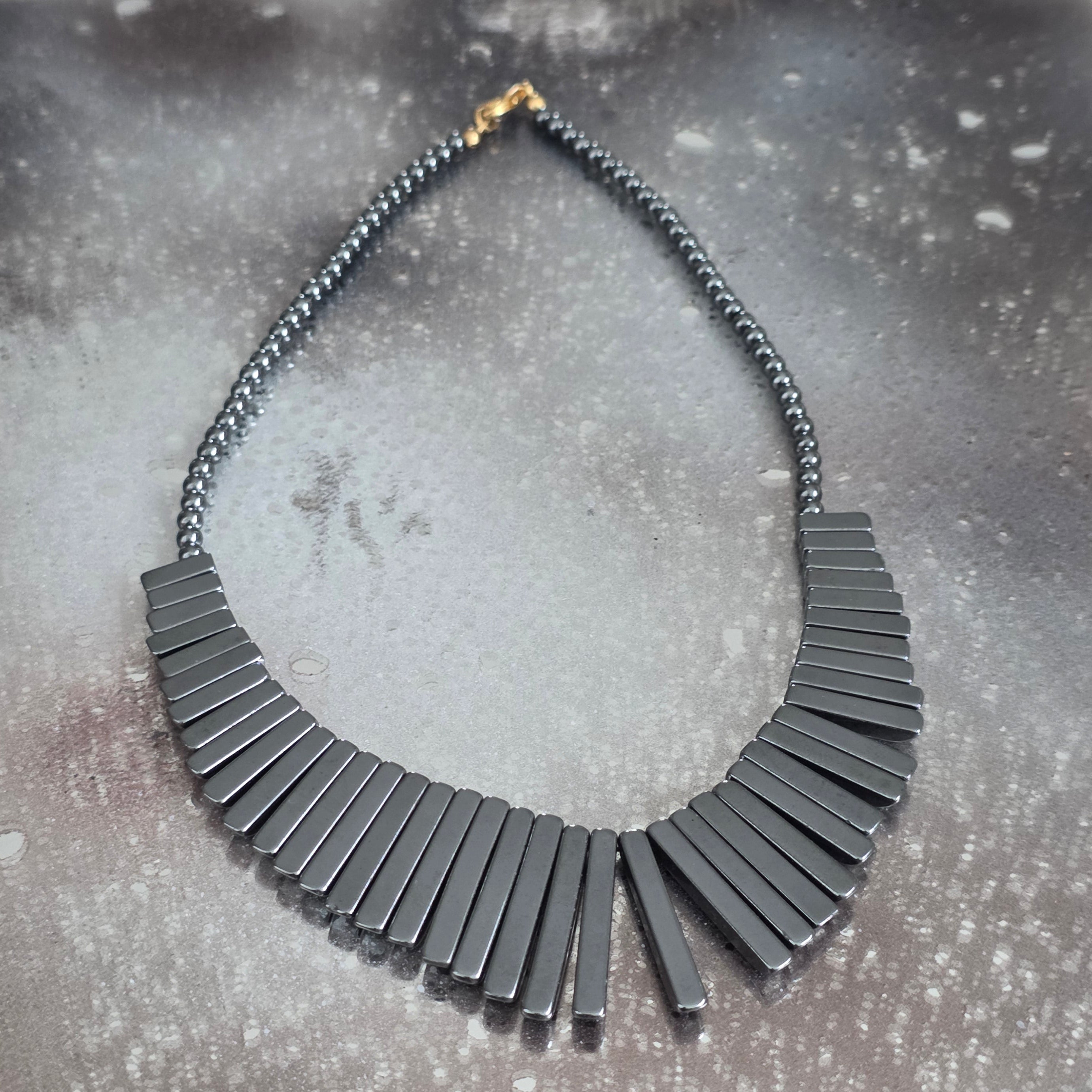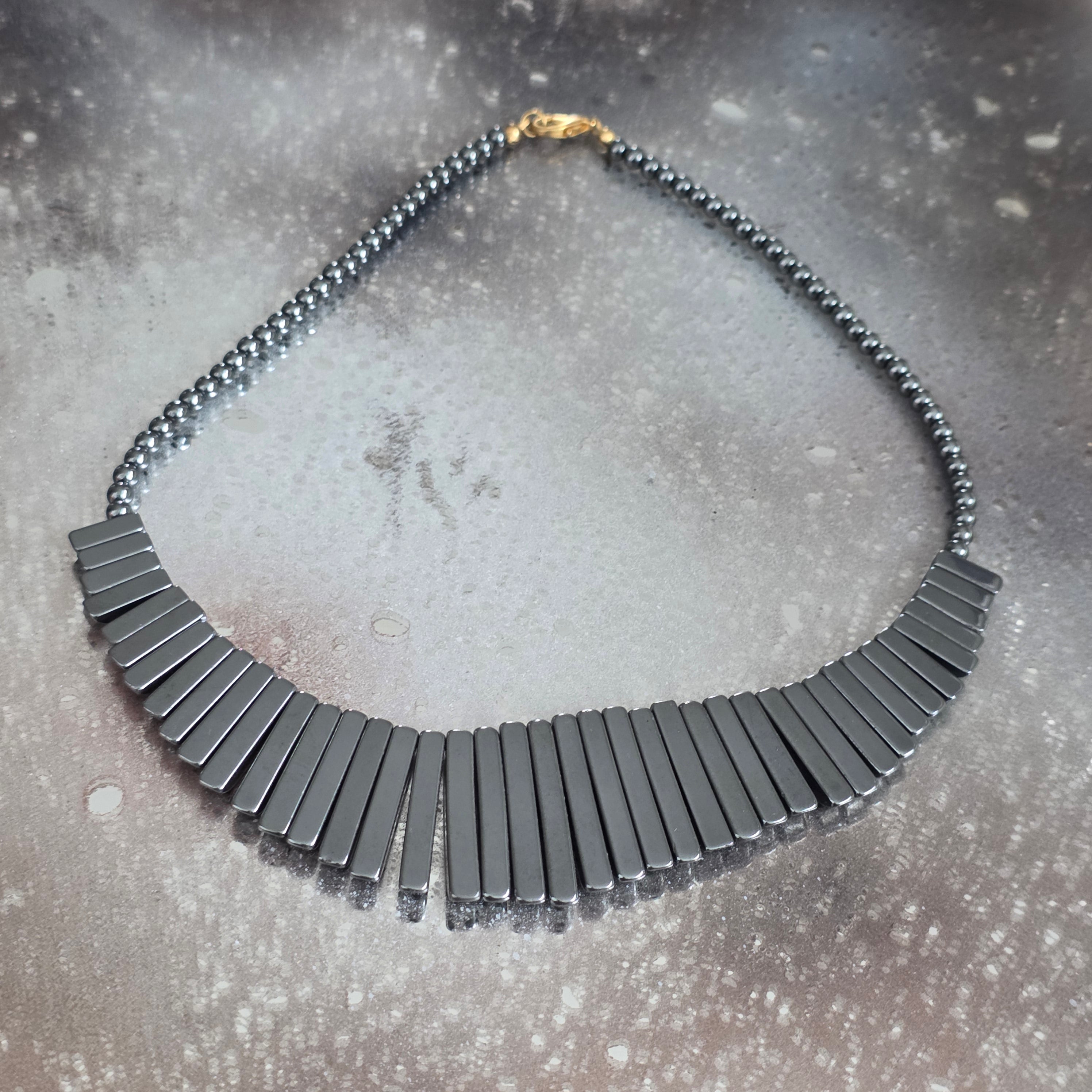 Tento egyptský náhrdelník z prírodného hematitu nesie odtlačok časov, keď šperky neboli len jednoduchými ozdobami – boli talizmany ochrany, sily a duchovného spojenia. Egyptský dizajn, so svojím impozantným a kráľovským vzhľadom, dodáva náhrdelníku osobitú prítomnosť, premieňajúc ho na kus, ktorý sa nielen nosí, ale aj prežíva.