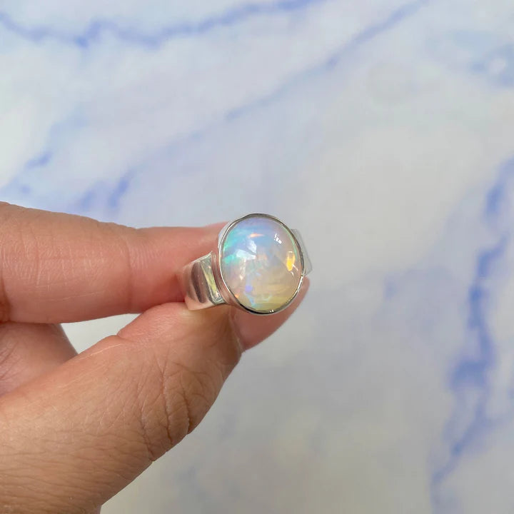 Elegantný a rafinovaný prsteň, vyrobený z striebra 925, s prírodným kameňom etiopský opál, známy pre svoje irizačné odlesky v odtieňoch zelenej, červenej a modrej. Minimalistický dizajn plain wire setting umožňuje, aby kameň bol v centre pozornosti a zachytával svetlo z každého uhla.