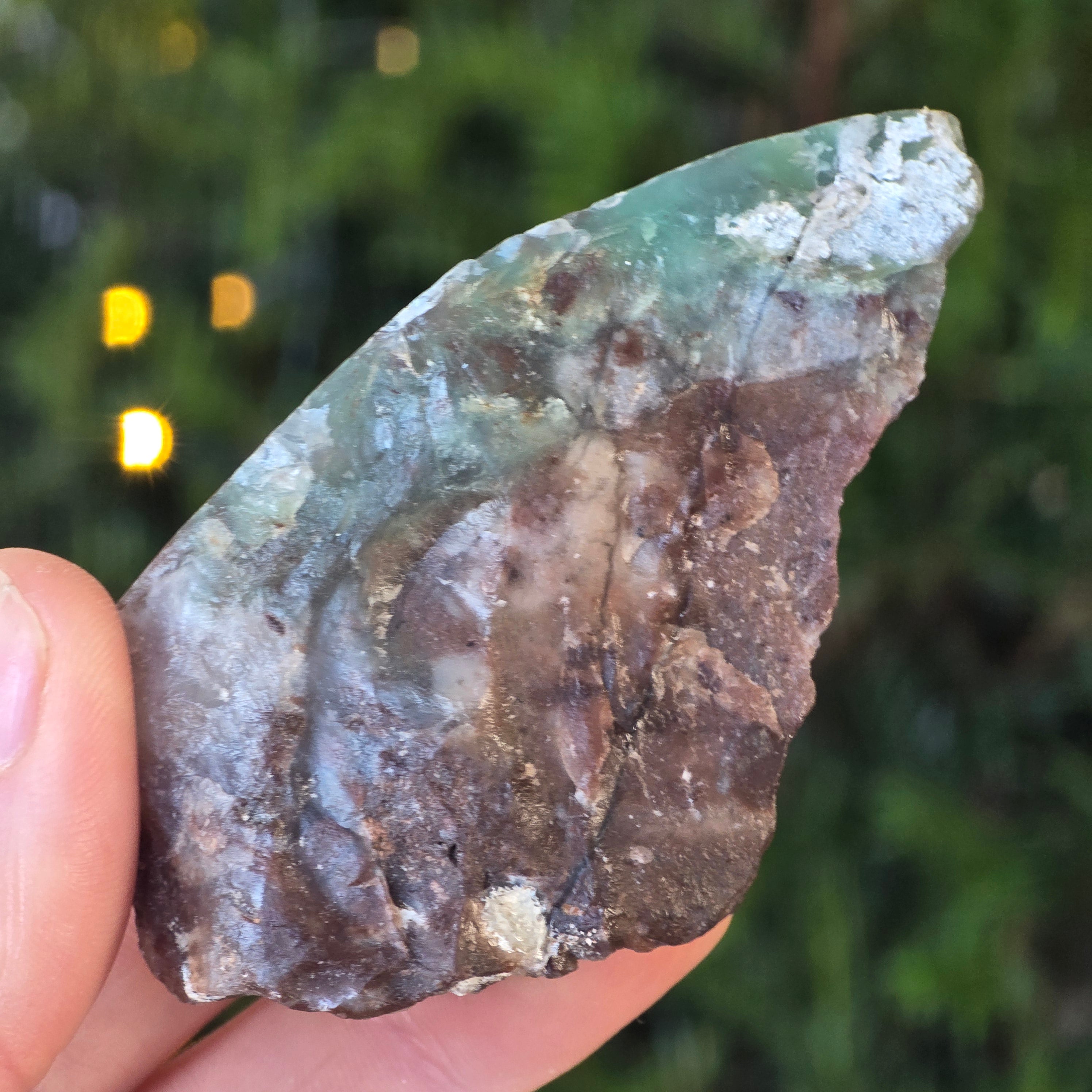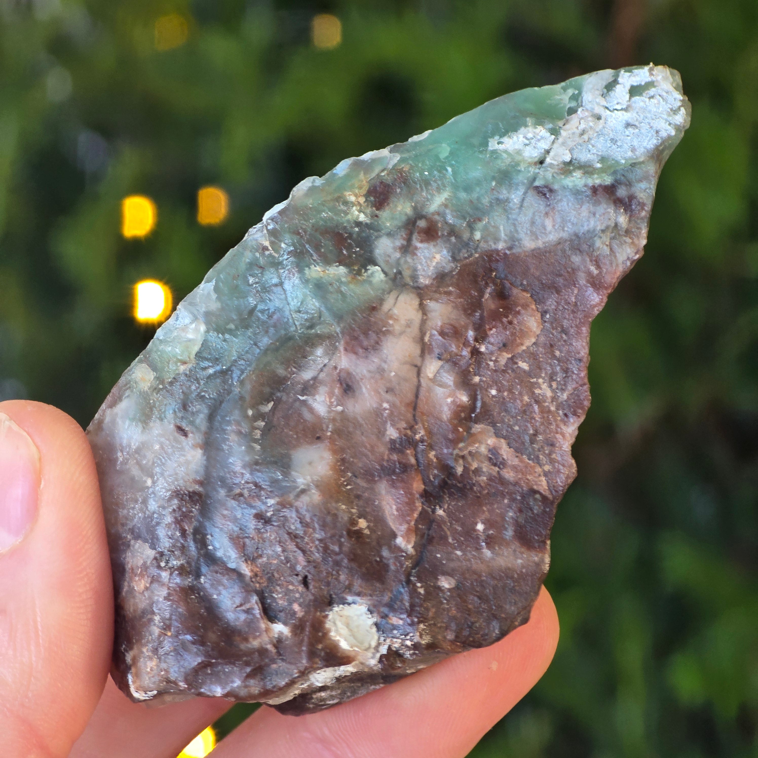 Ide o prírodnú, nezmenenú formu chrómového chalcedónu – minerálu, ktorý sa ťažko nachádza, získava sa výlučne zo Zimbabwe a je cenený pre svoju živú farbu, ktorá nepochádza z niklu (ako pri chryzoprasu), ale z chrómu, ktorý pulzuje hlboko v jeho kryštalickej štruktúre. V tejto osobitej variante vytvárajú modré a zelené vsuvky fascinujúcu hru farieb, s hladkými prechodmi medzi priehľadným a nepriehľadným, medzi hustým a vzdušným.
