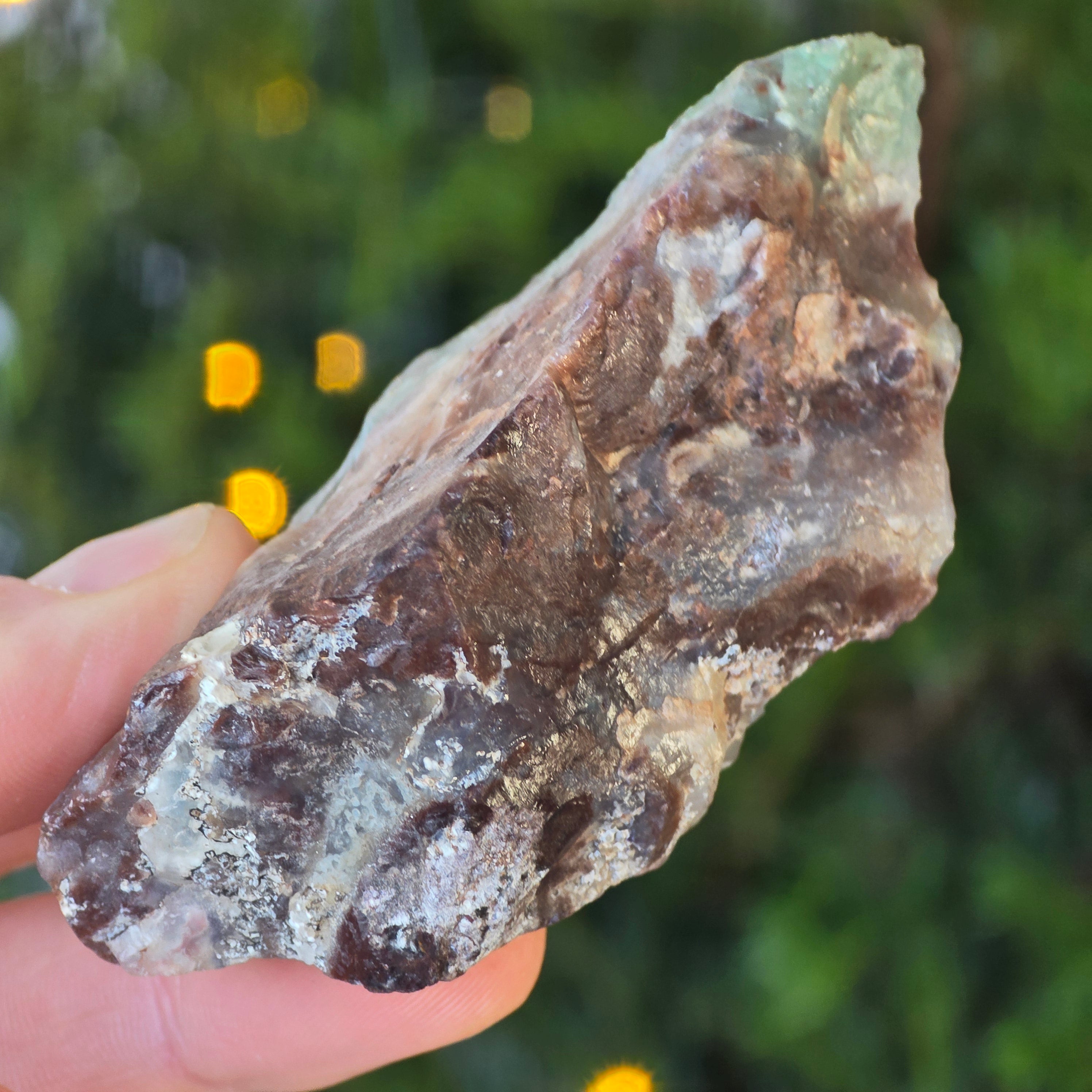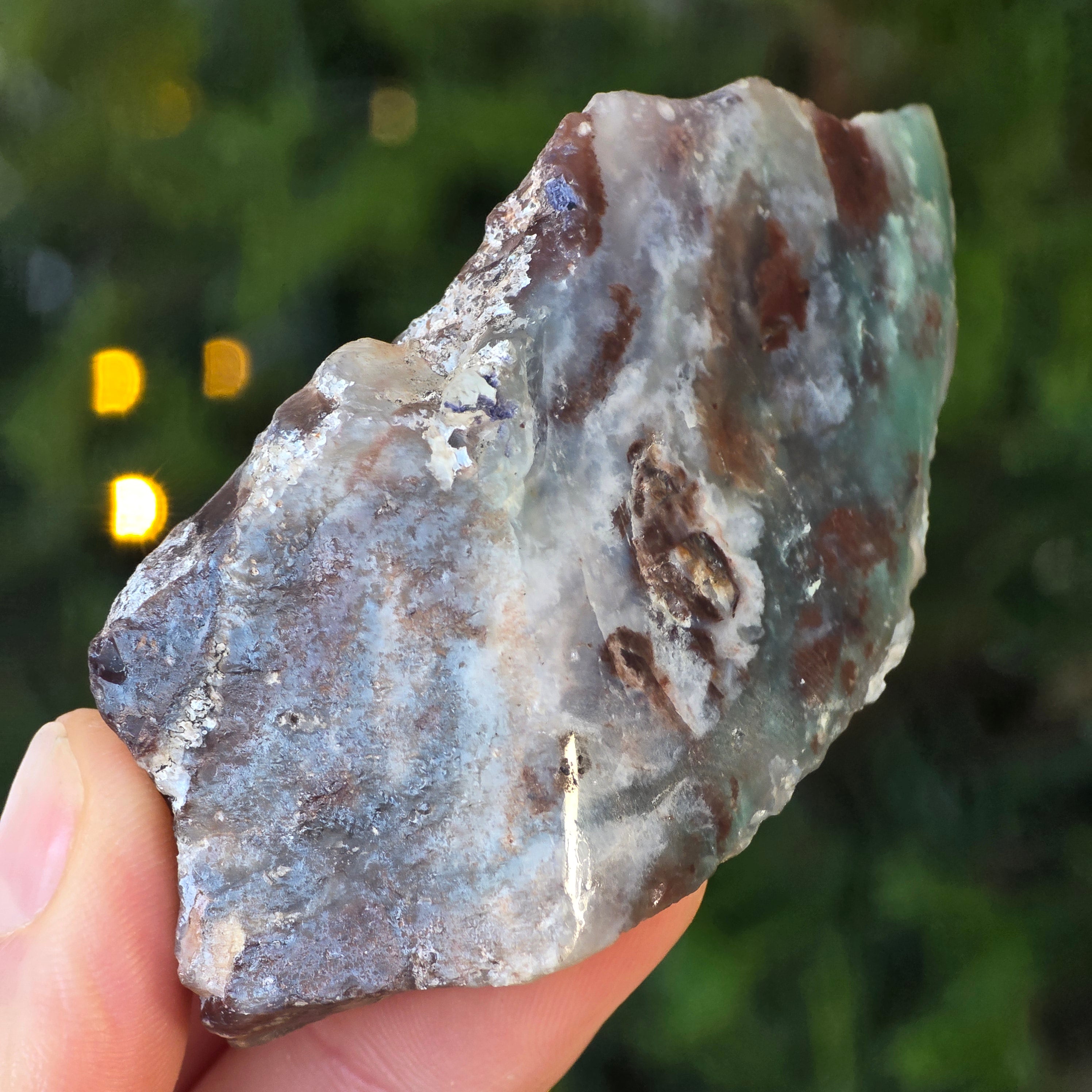 Textúra je živá – s mliečno kalcedónovými žilami, jemnými štrbinami kremeňa a hrdzavými škvrnami matrice – všetko sú svedectvá pomalého tvorenia, v zložitom geologickom prostredí plnom napätí.