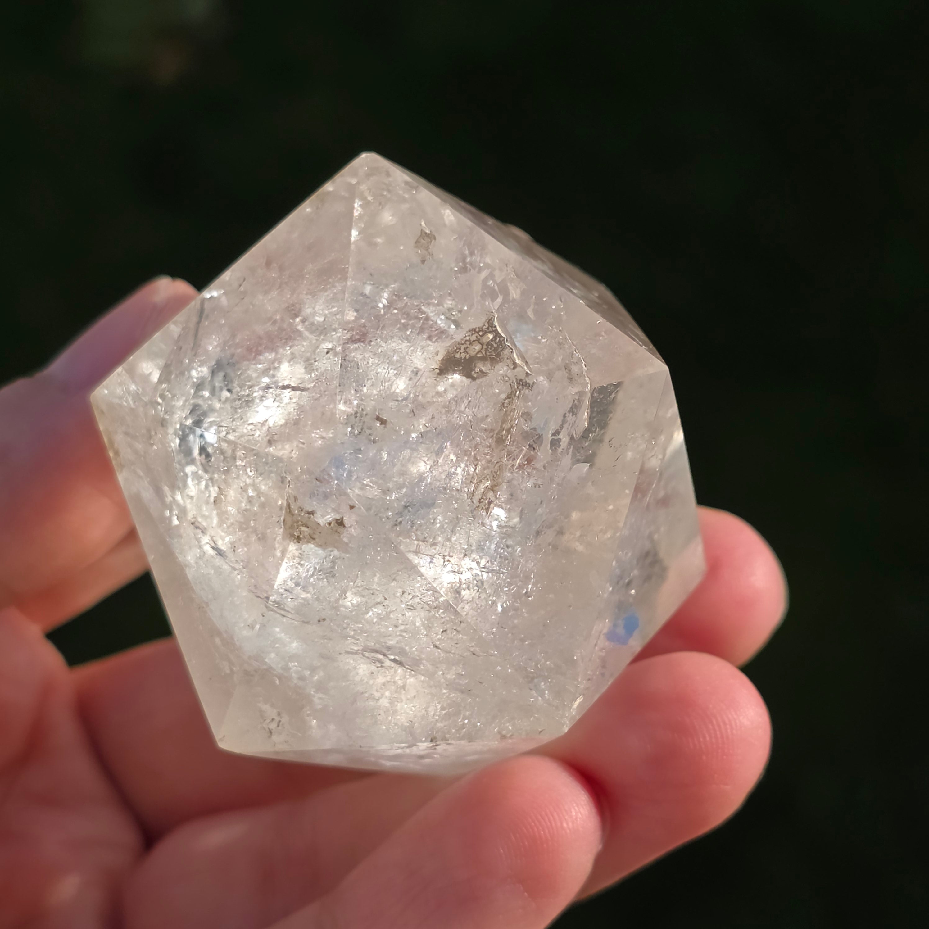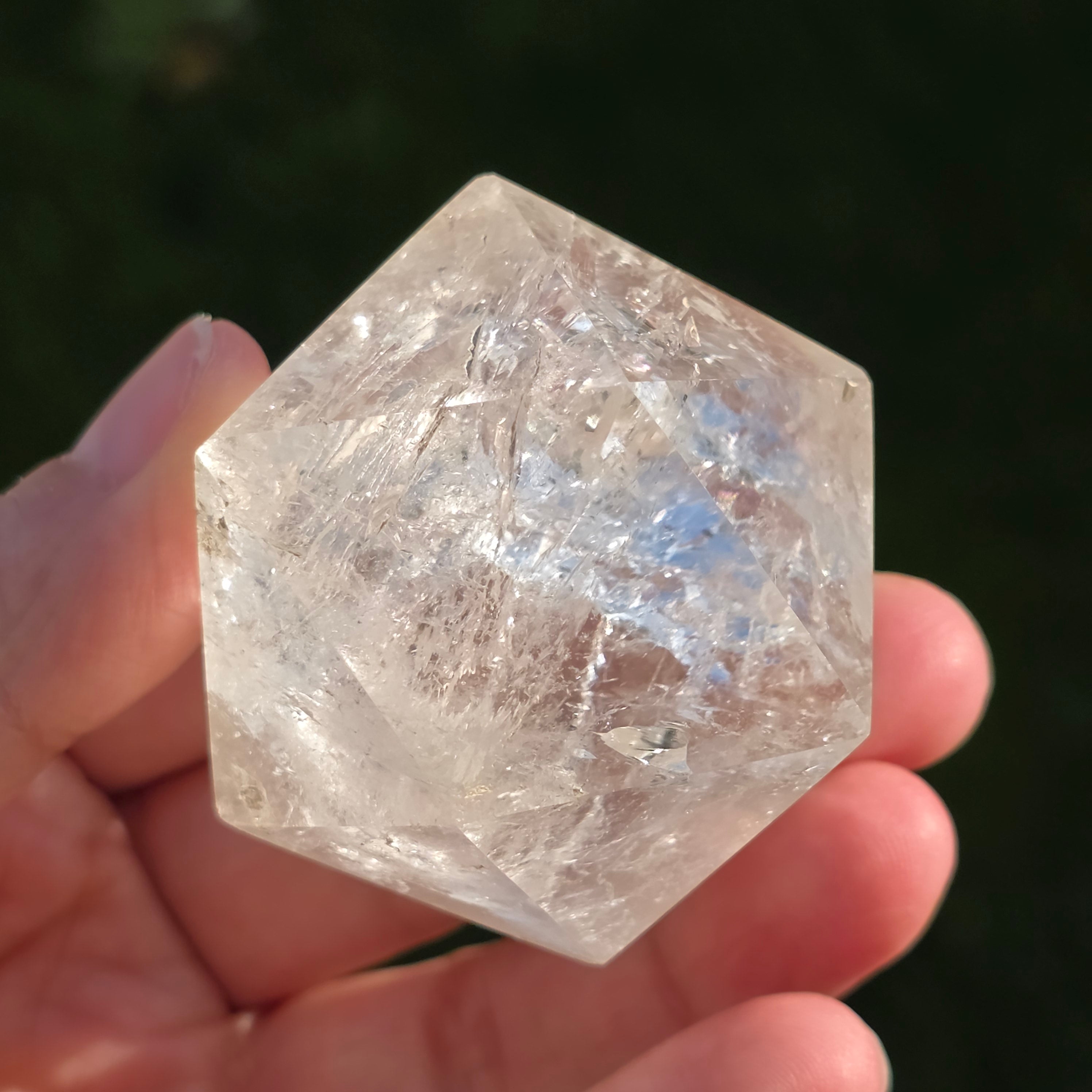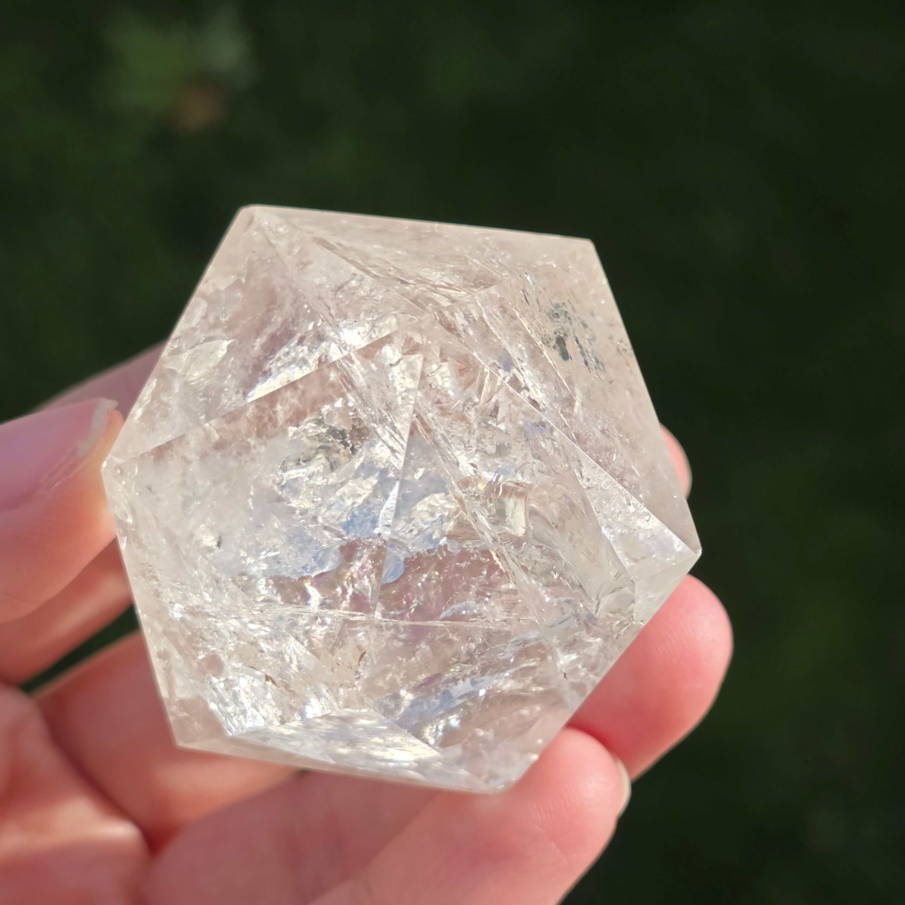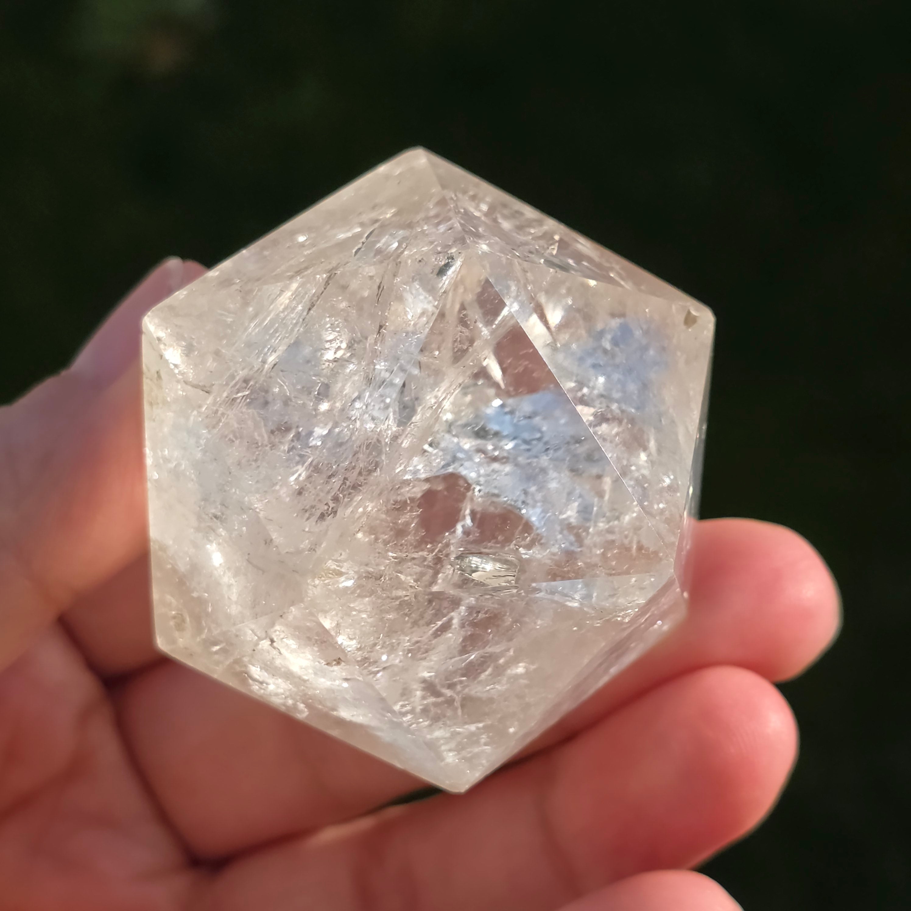 Ihličnatý kremeň bezfarebný (horský kryštál), ručne brúsený presne do tvaru platónskeho telesa s 20 rovnostrannými trojuholníkovými stenami.