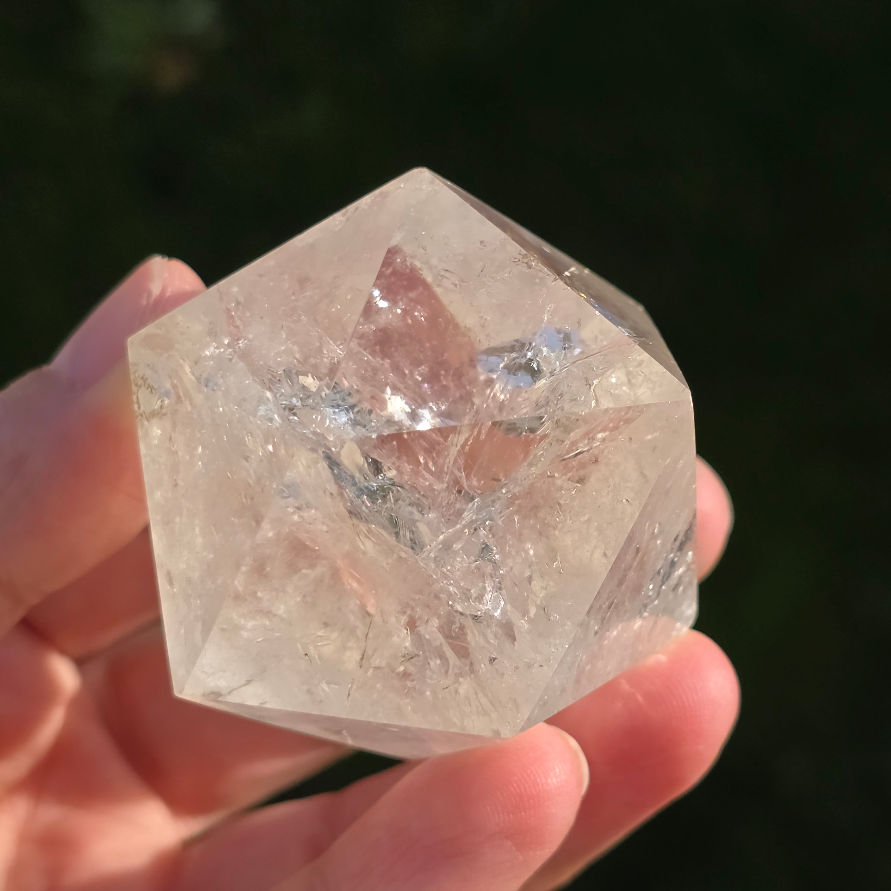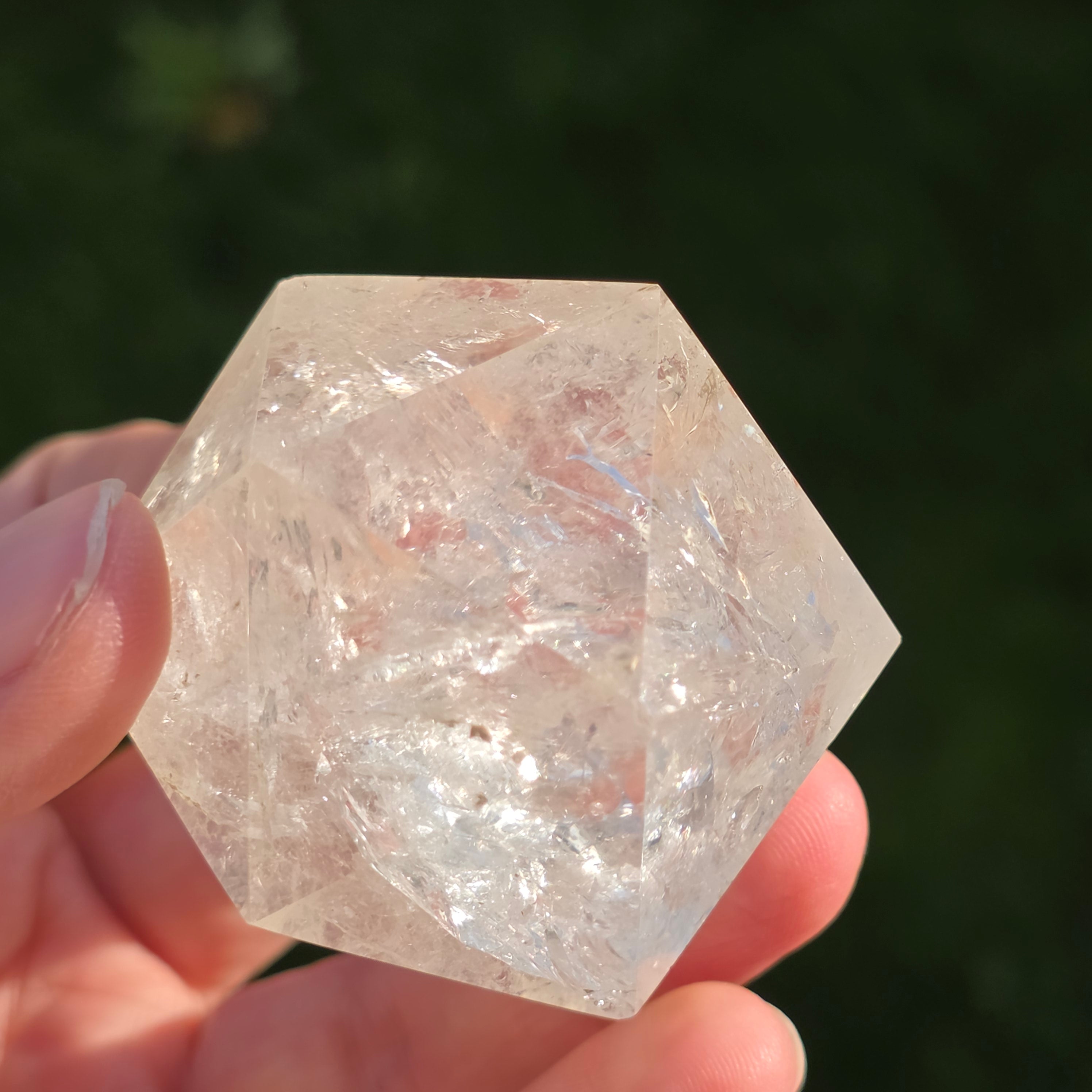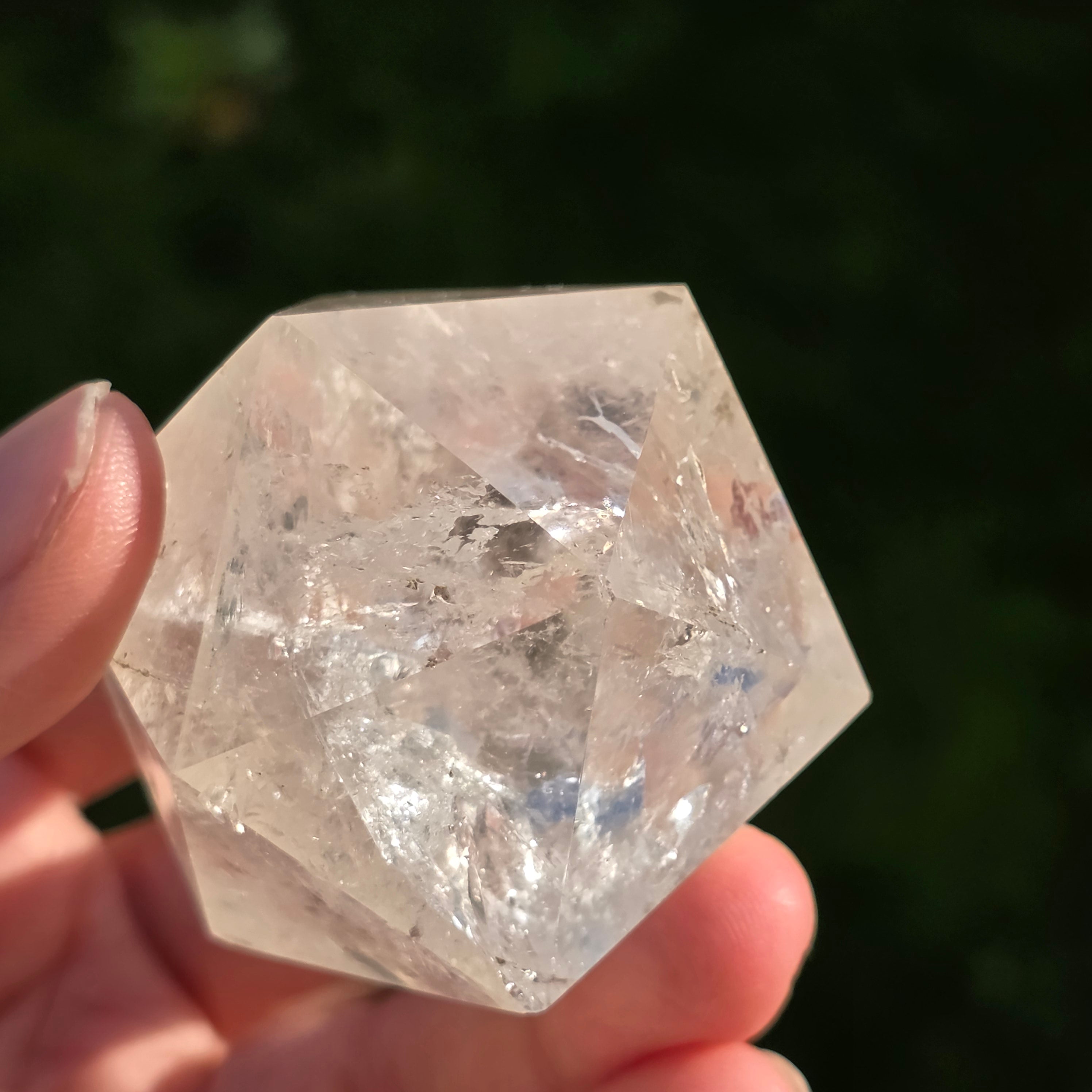 Ihličnatý kremeň bezfarebný (horský kryštál), ručne brúsený presne do tvaru platónskeho telesa s 20 rovnostrannými trojuholníkovými stenami.