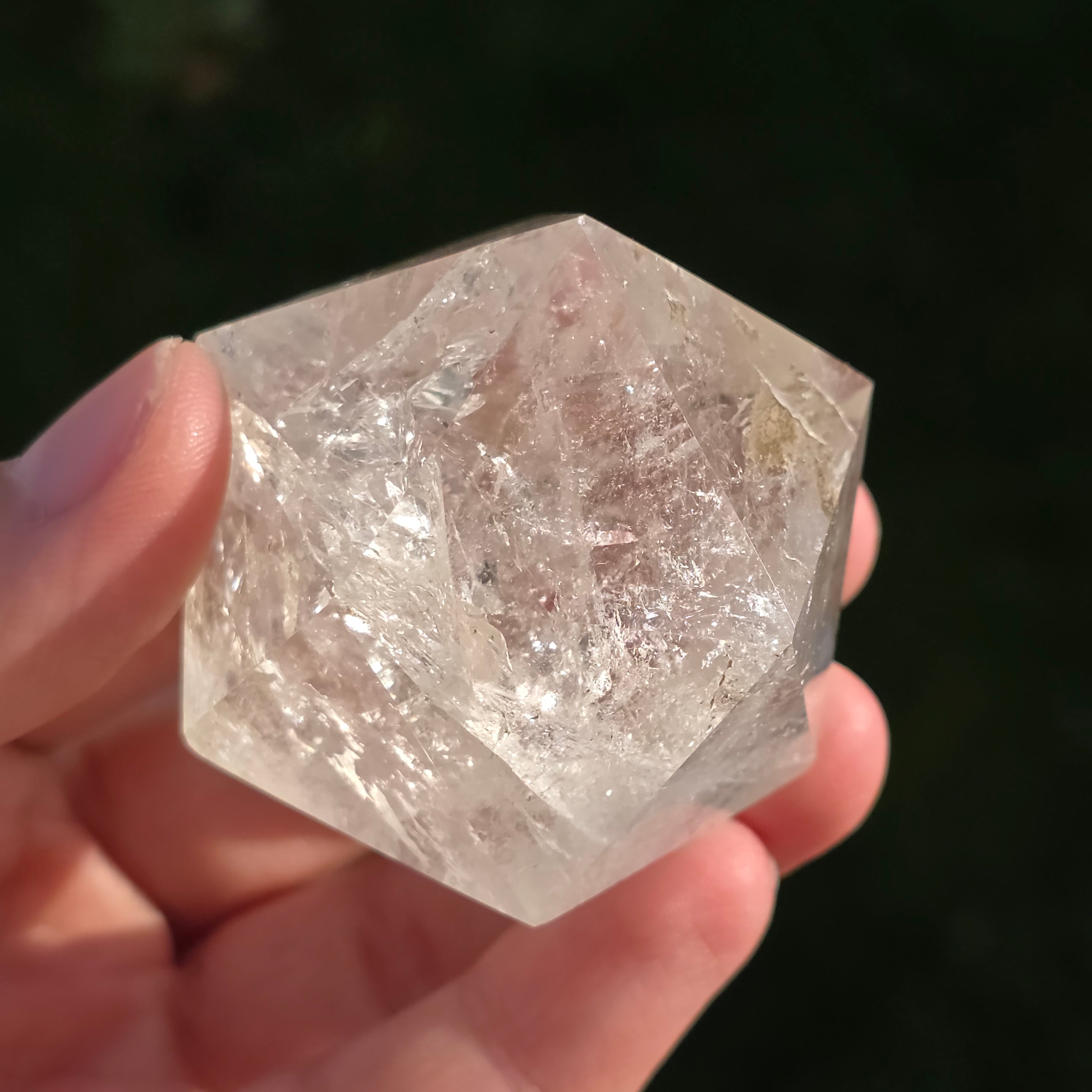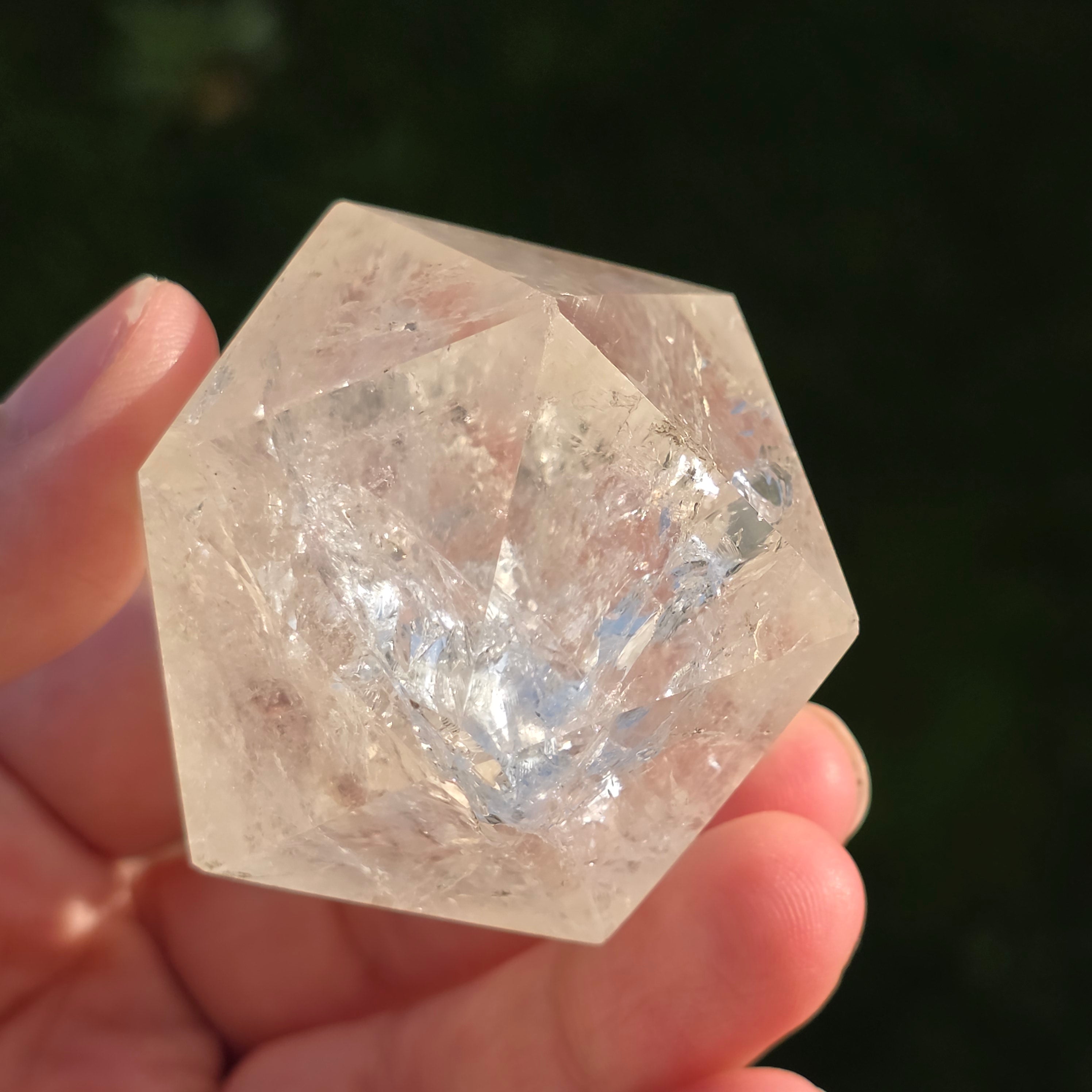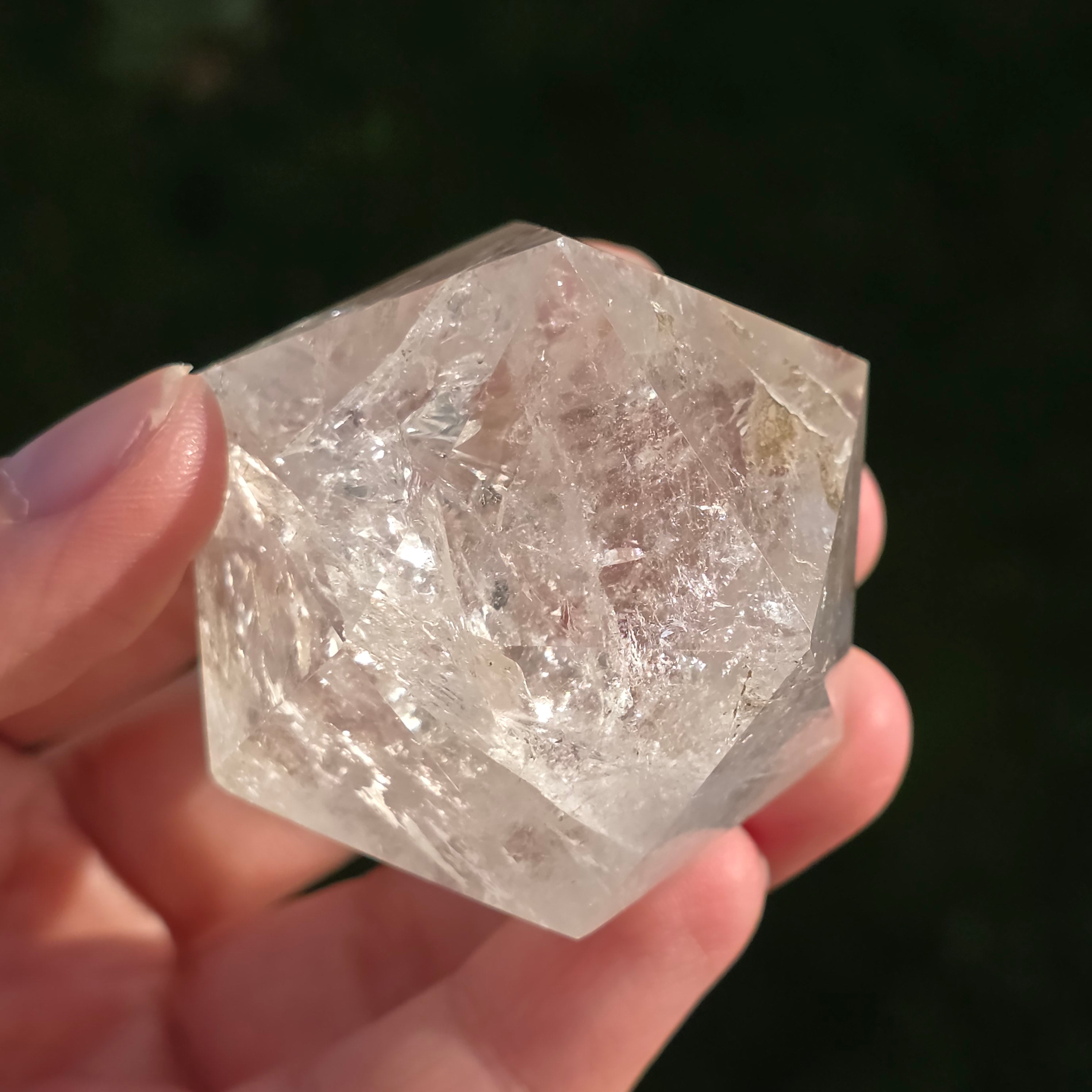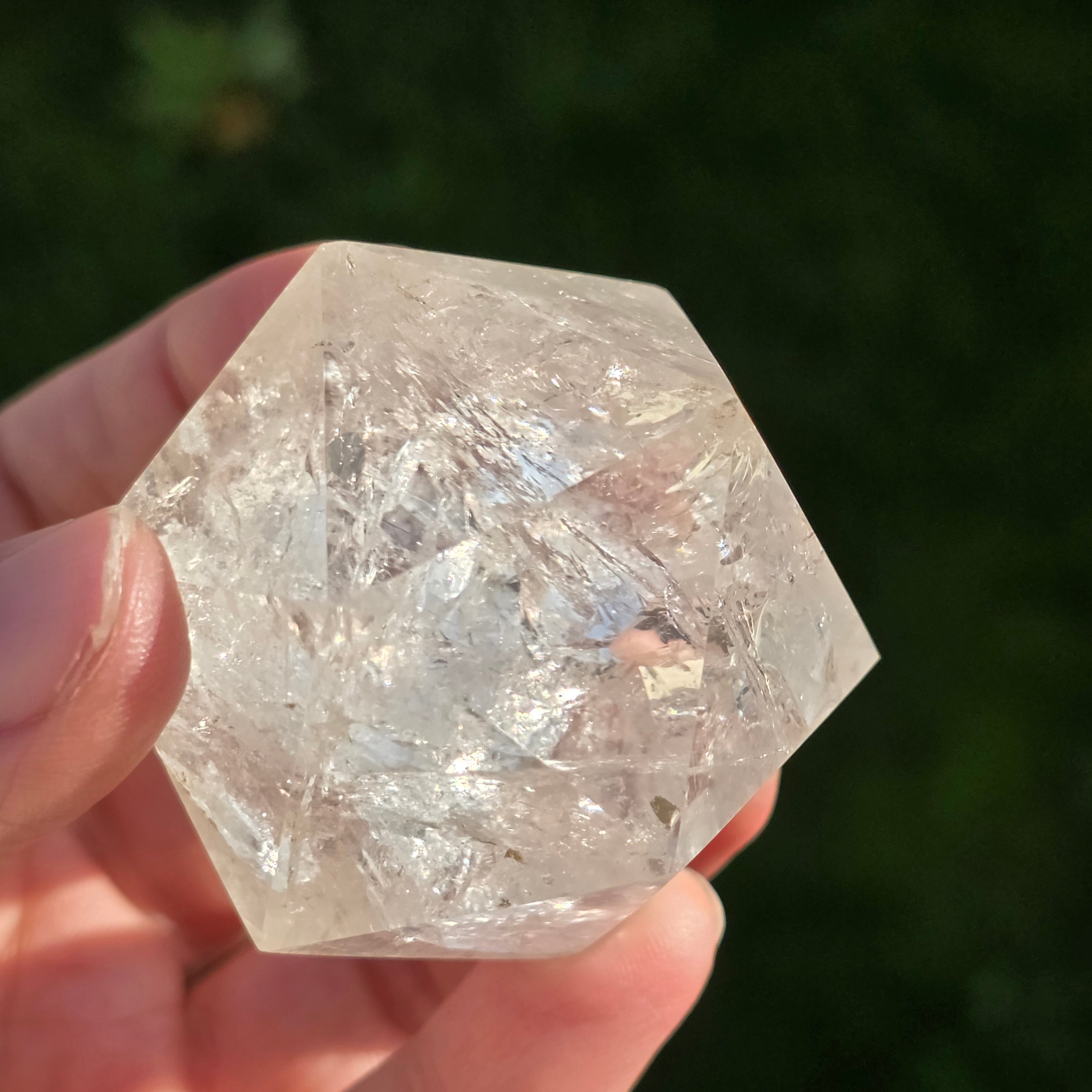 Ihličnatý kremeň bezfarebný (horský kryštál), ručne brúsený presne do tvaru platónskeho telesa s 20 rovnostrannými trojuholníkovými stenami.