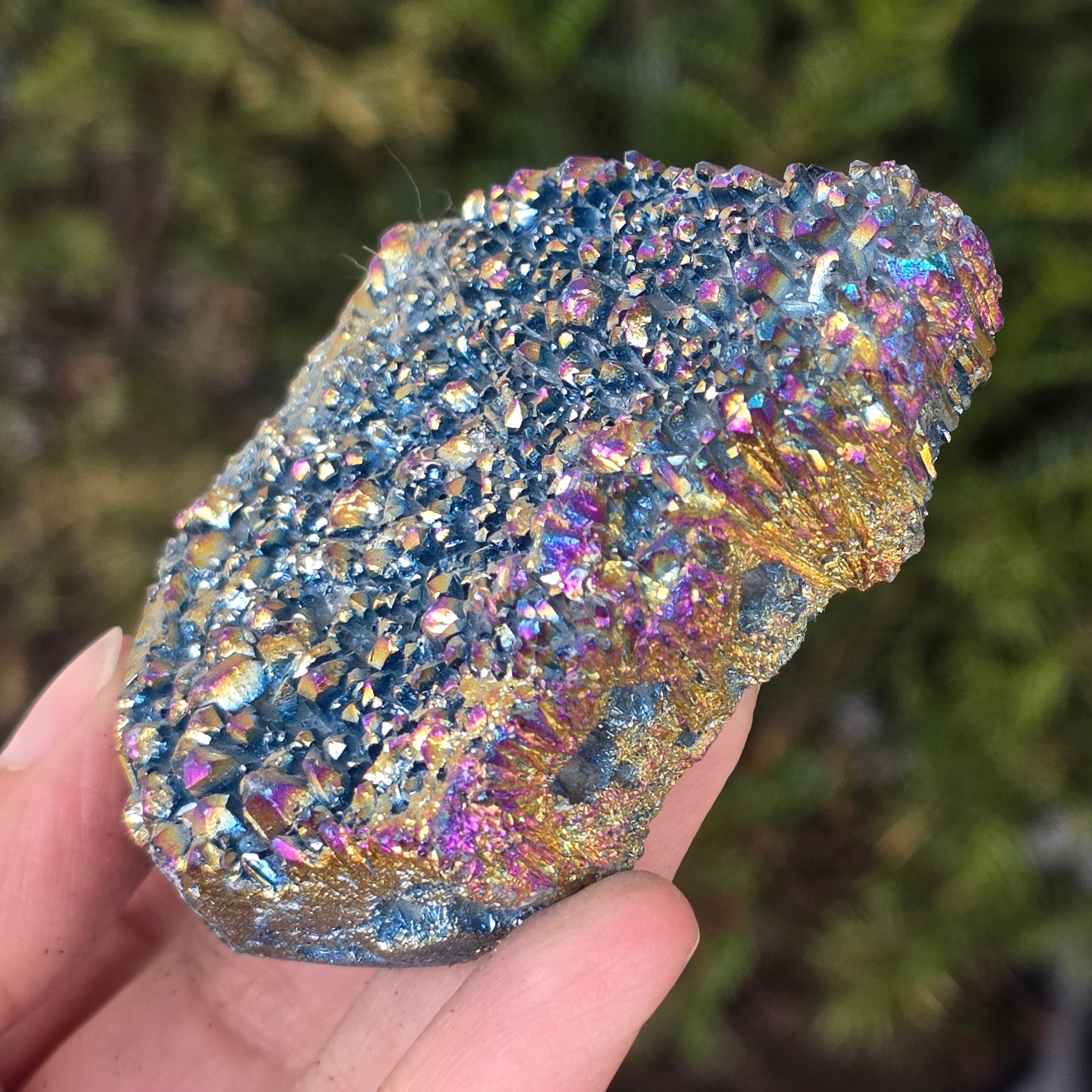 Bezfarebný kremeň Aura Titanium je prírodný kryštál priehľadného kremenca, upravený špeciálnym procesom nazývaným aura coating. V rámci tohto procesu sa na povrch kryštálu pri vysokých teplotách nanáša extrémne tenká vrstva titánu, čo vedie k ohromujúcim odrazom v irizujúcich odtieňoch.