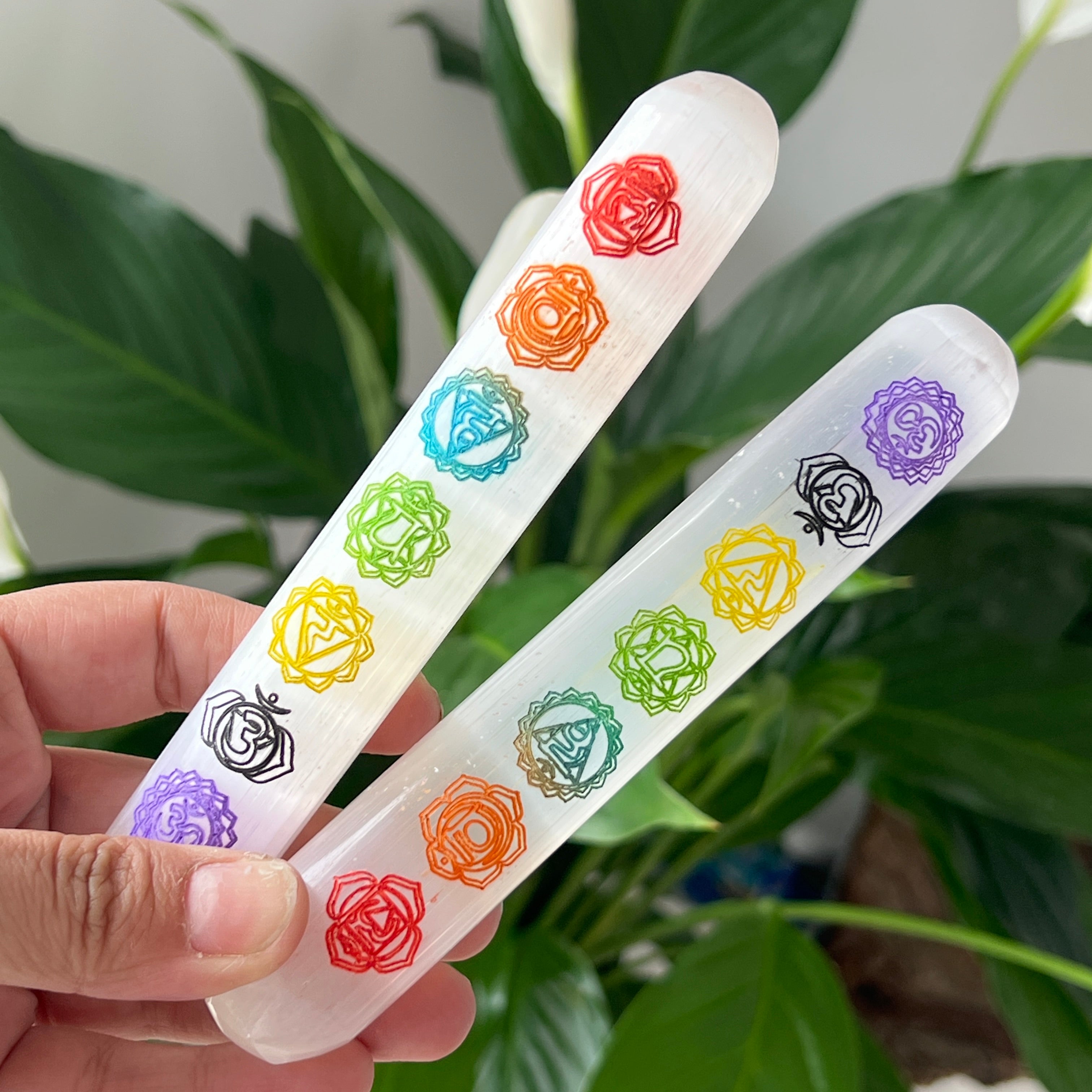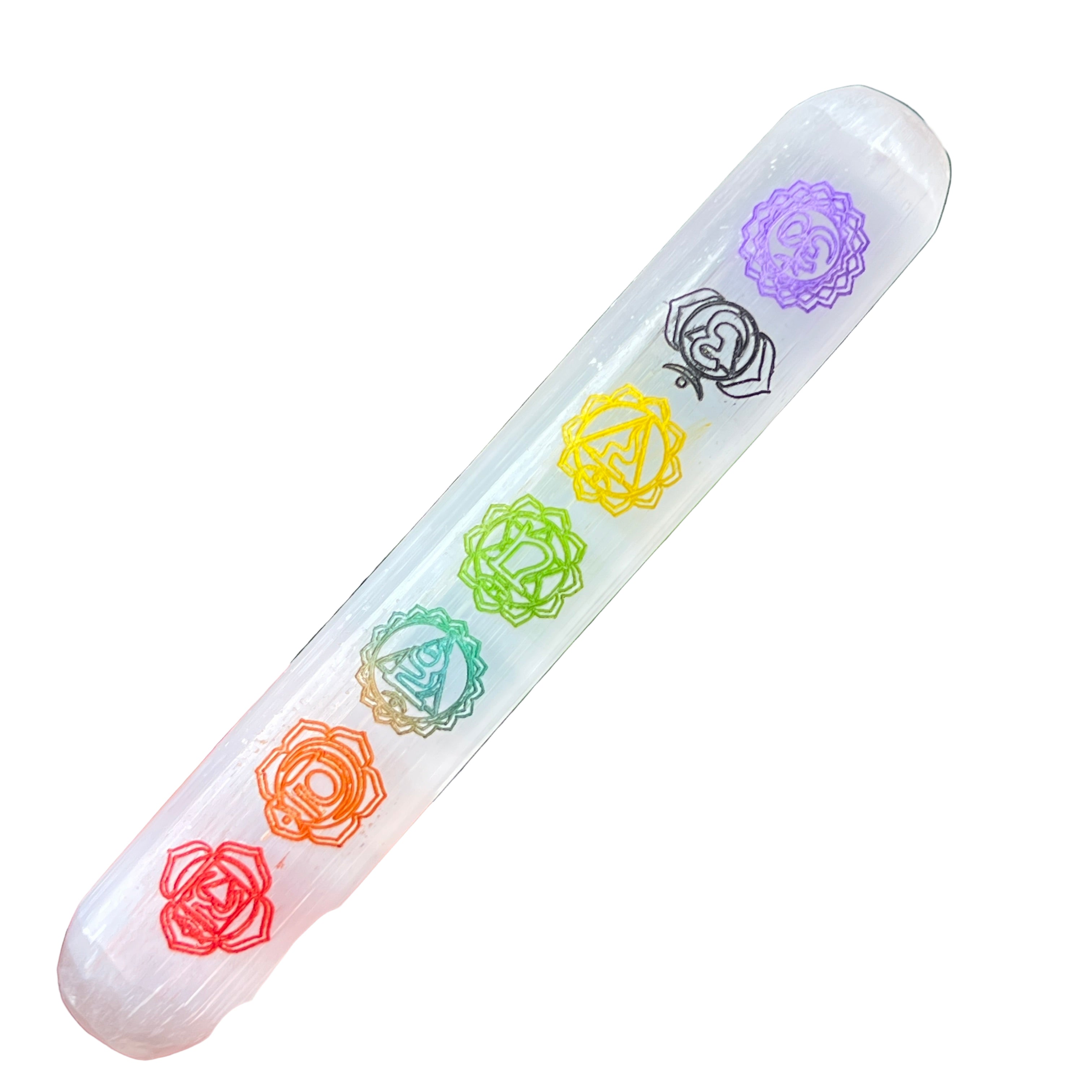 Táto masážna palička z selenitu je zdobená symbolmi 7 čakier, každý vyrytý a farebne odlíšený, aby podporovala energetickú prácu a vnútornú rovnováhu. Selenit je známy ako kameň svetla a očistya používa sa na mentálnu jasnosť, ako aj na čistenie iných kryštálov a osobného priestoru.