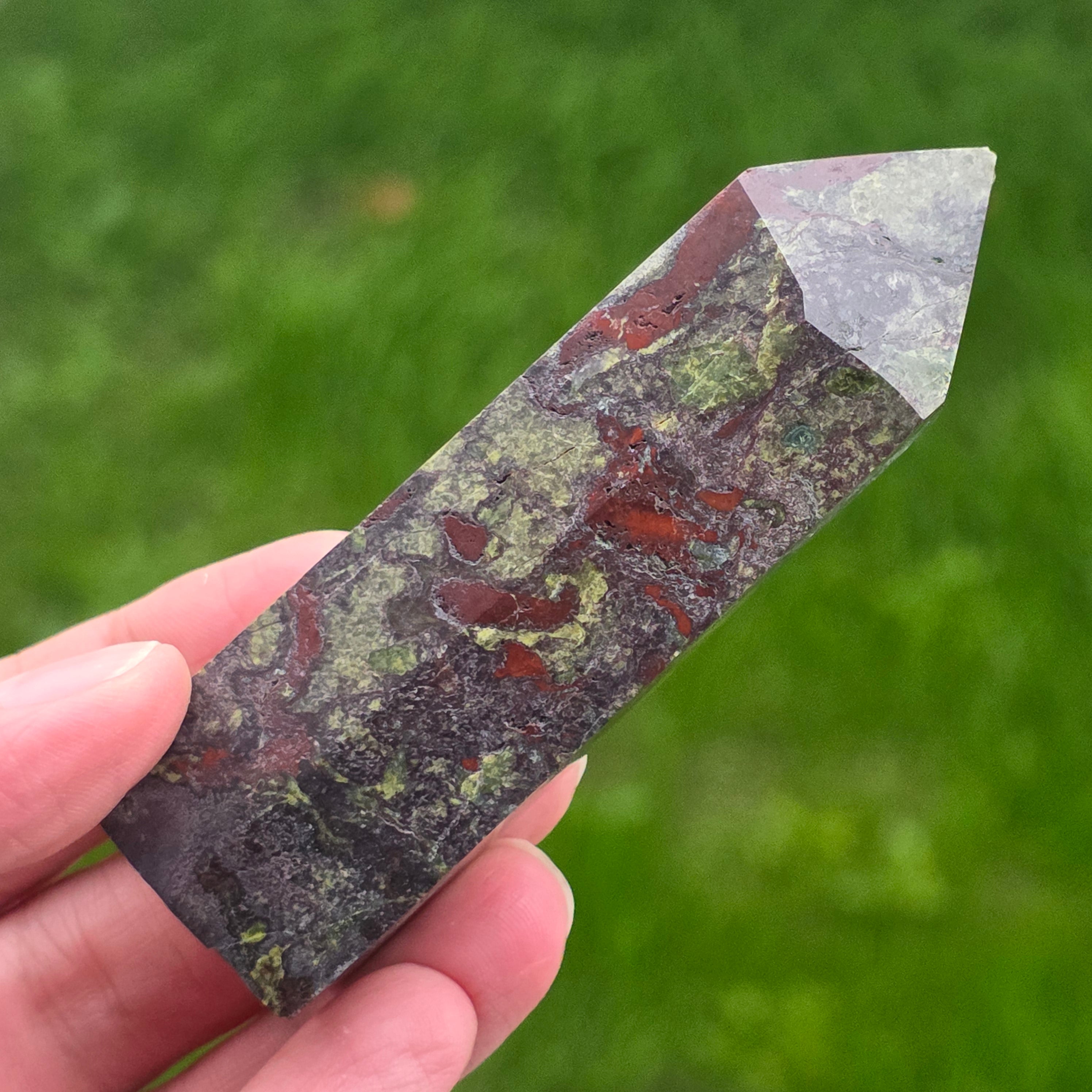 Mini obelisk dračí krv kameň (epidót & piedmontit) m5