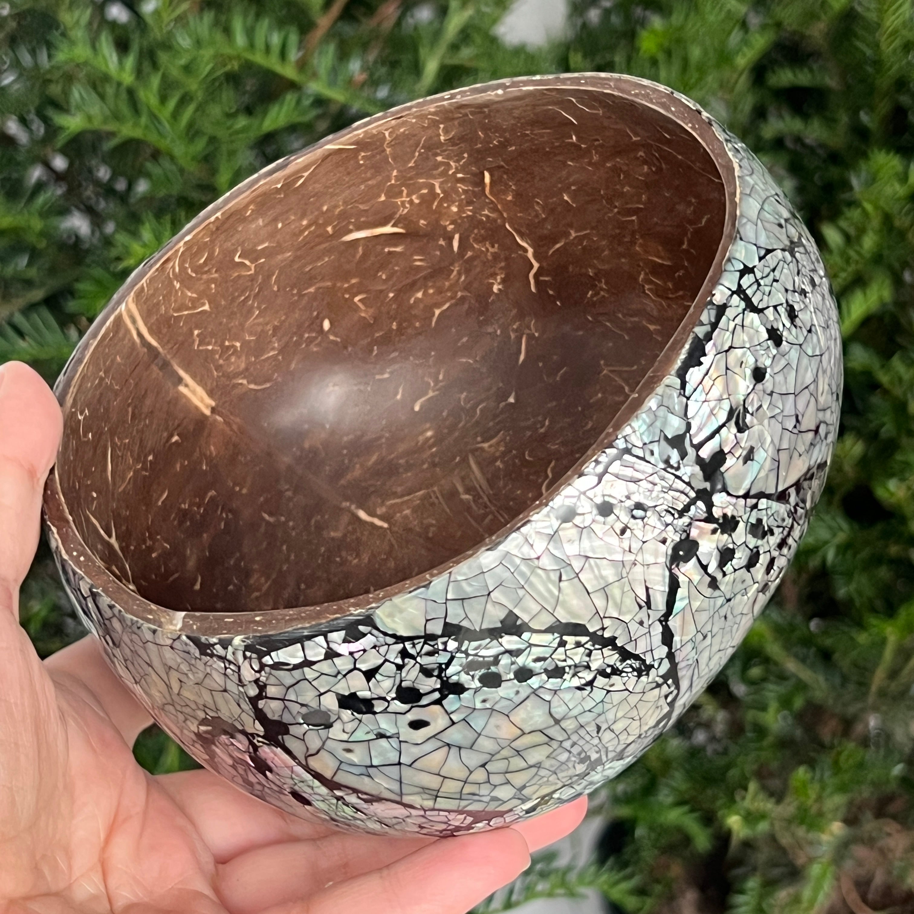 • Povrchová úprava: vnútro z abalone mušle s perleťovým leskom, vonkajšok z prírodného kokosu, ručne leštené