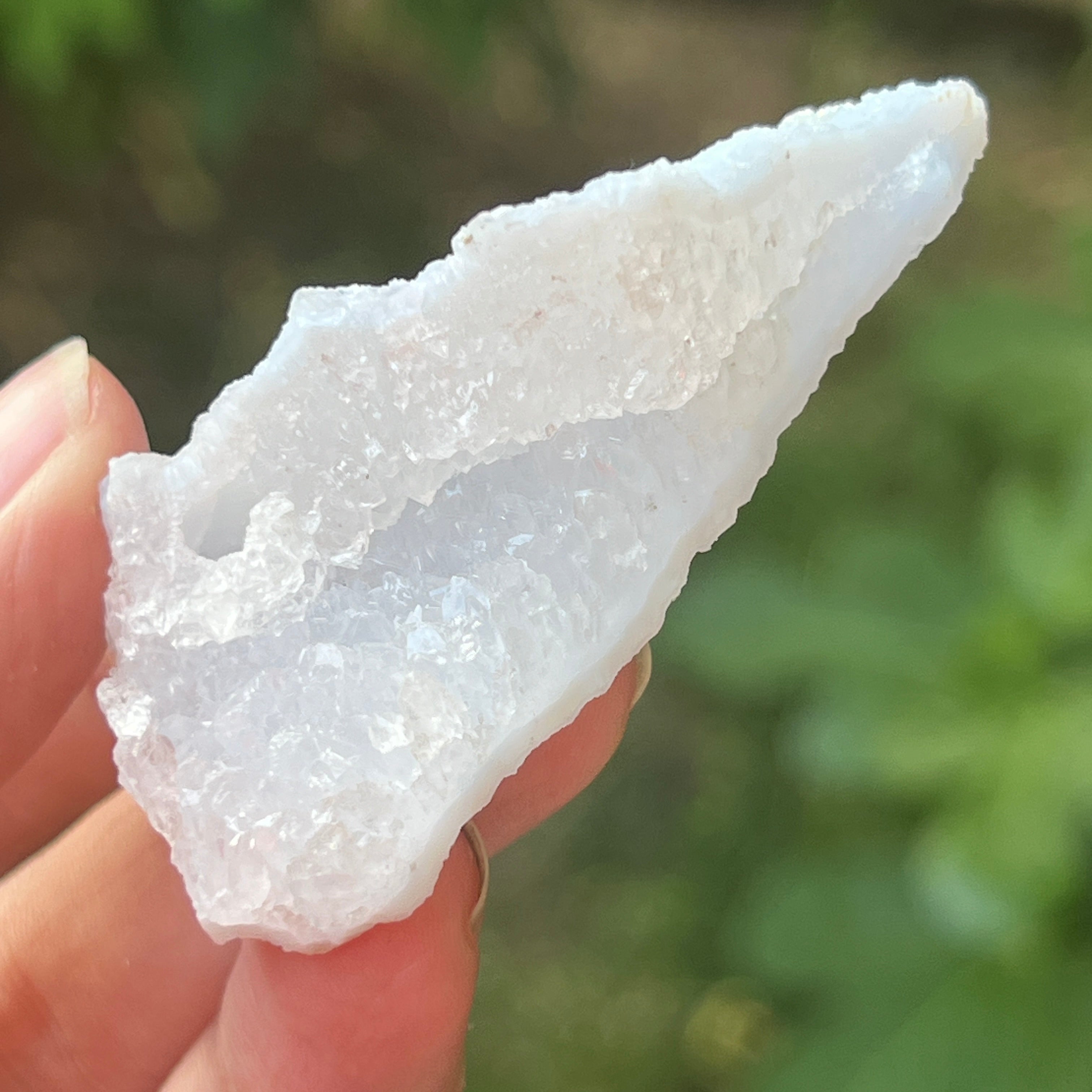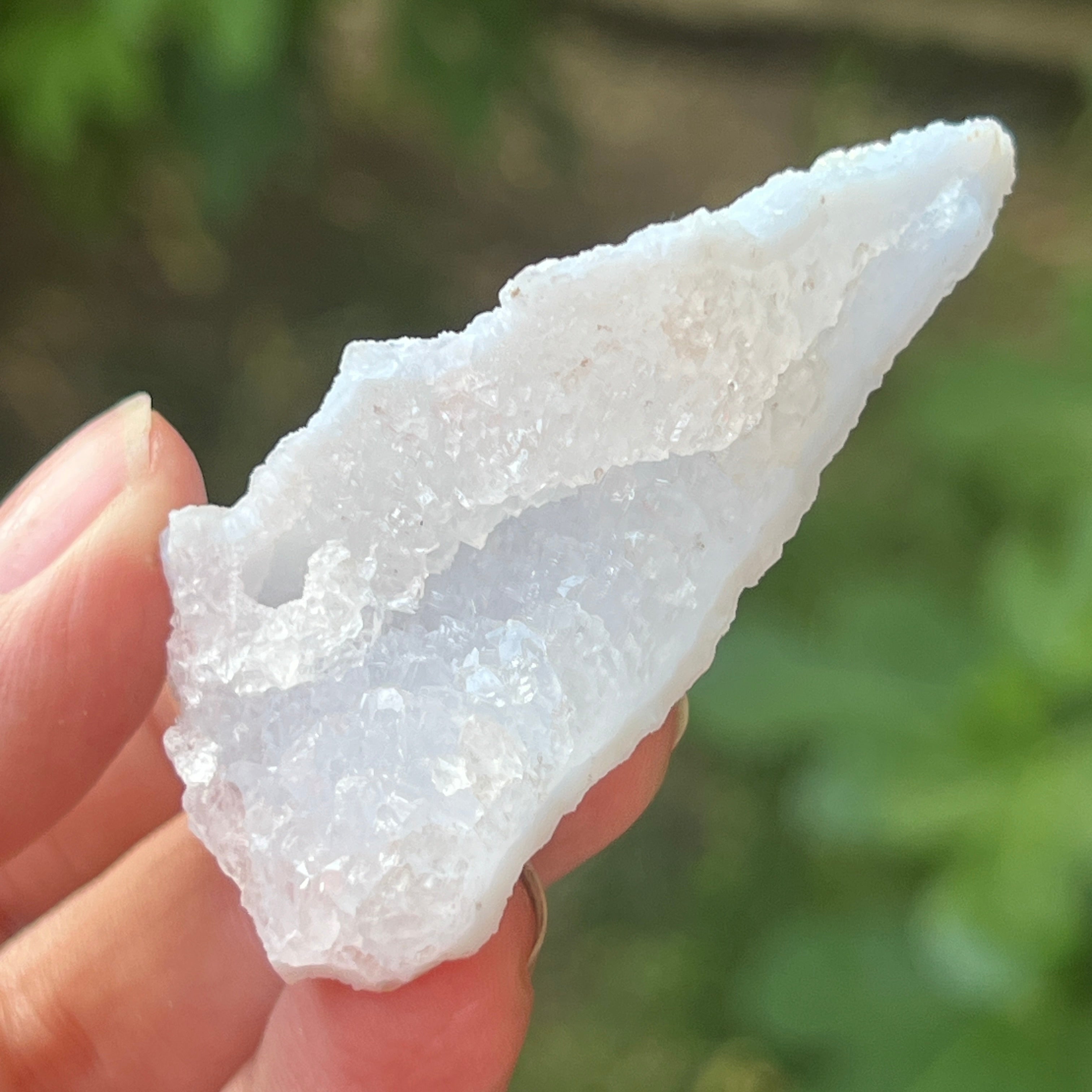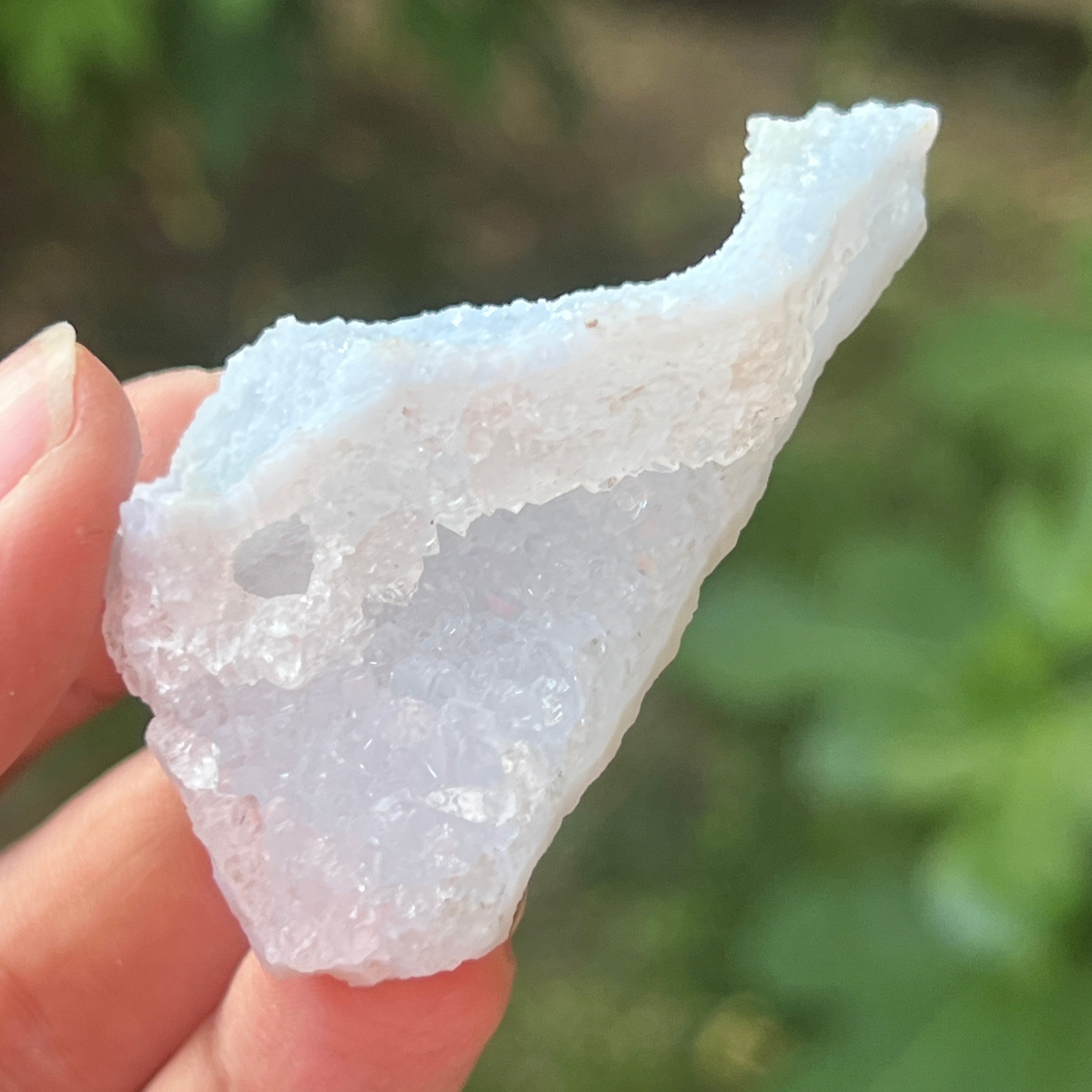 Vzorky modrého čipkovaného achátu a modrej chalcedónie pochádzajú z Nsanje, Malawi. Tieto špeciálne formácie prechádzajú zložitým procesom kyslých kúpeľov v Južnej Afrike, ktorý starostlivo odstraňuje väčšinu alebo všetky stopy matrice, čím zostáva čistý modrý čipkovaný achát a/alebo modrá chalcedónia s pozoruhodnou krásou.