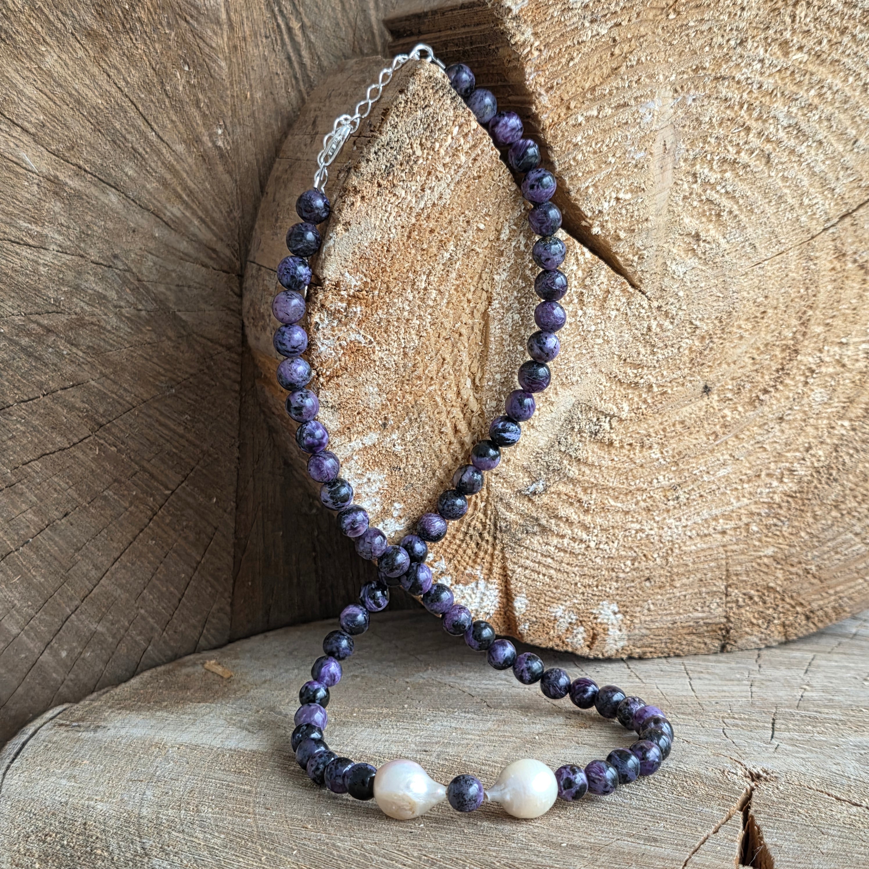 Náhrdelník s pokojnou a hlbokou prítomnosťou, vyrobený z6 mm guličiek charoitu, ktorých odtiene fialovej, levanduľovej a mliečne bielej sa zdajú prelínať ako vnútorná krajina. Každý kameň má jedinečný vzor, ako odtlačok premien a hlbokého porozumenia.