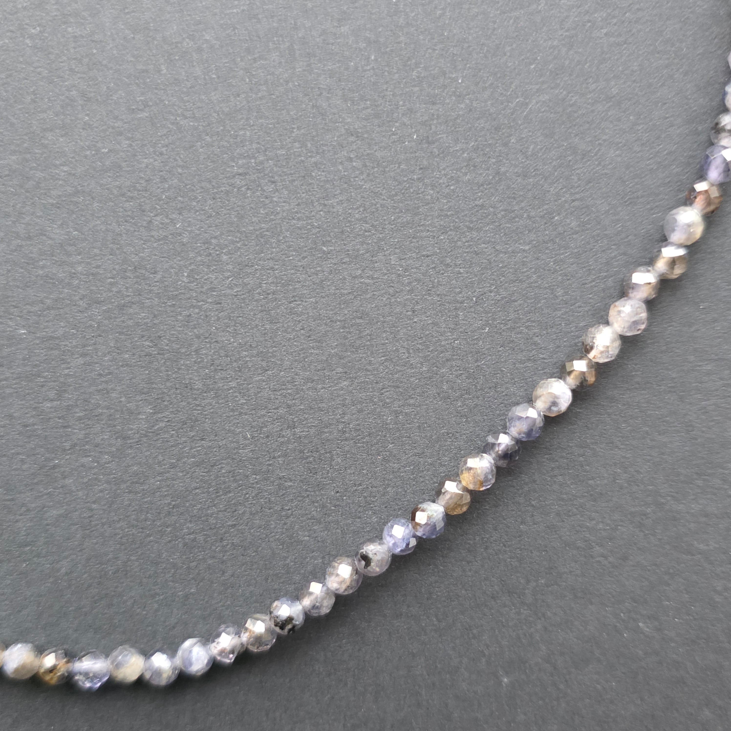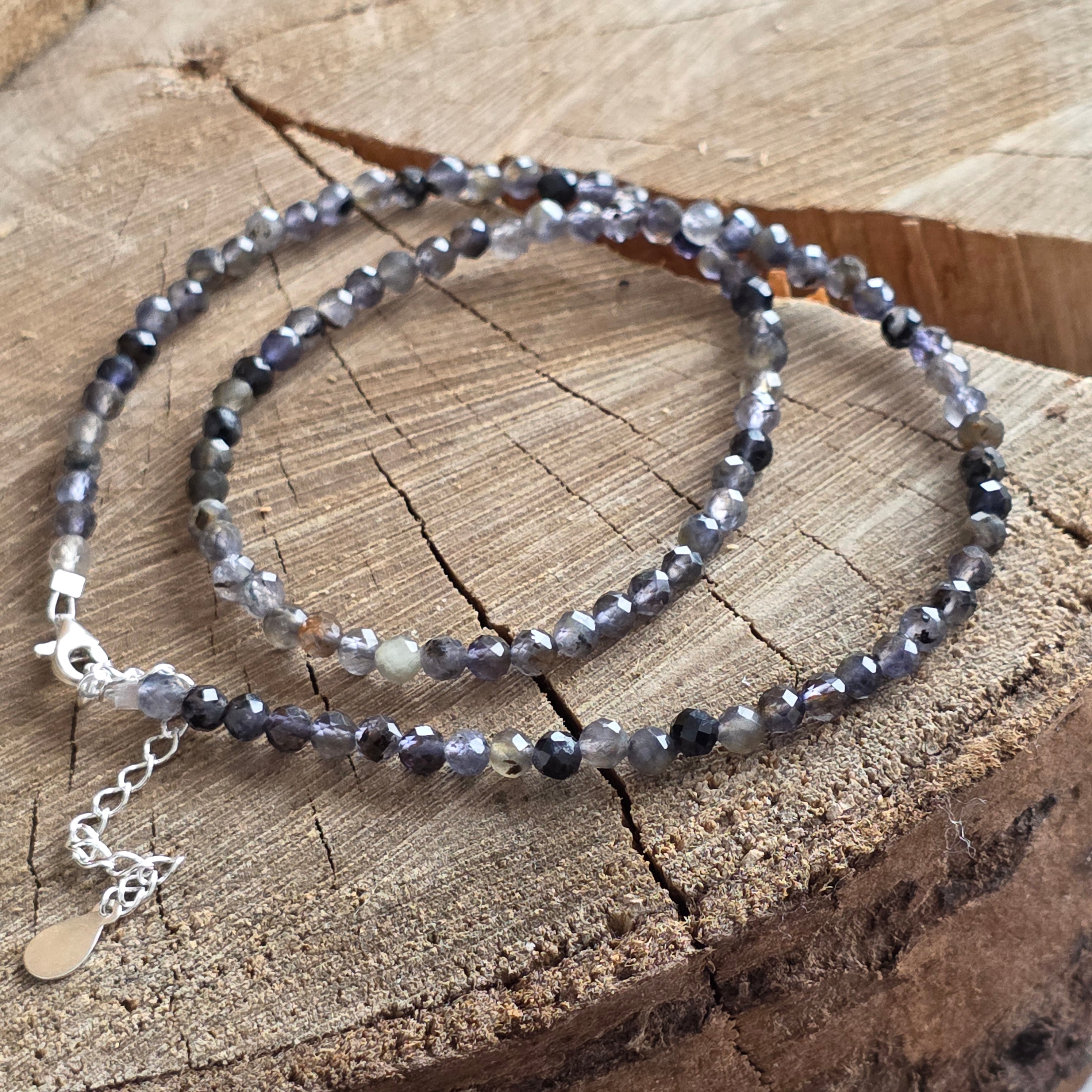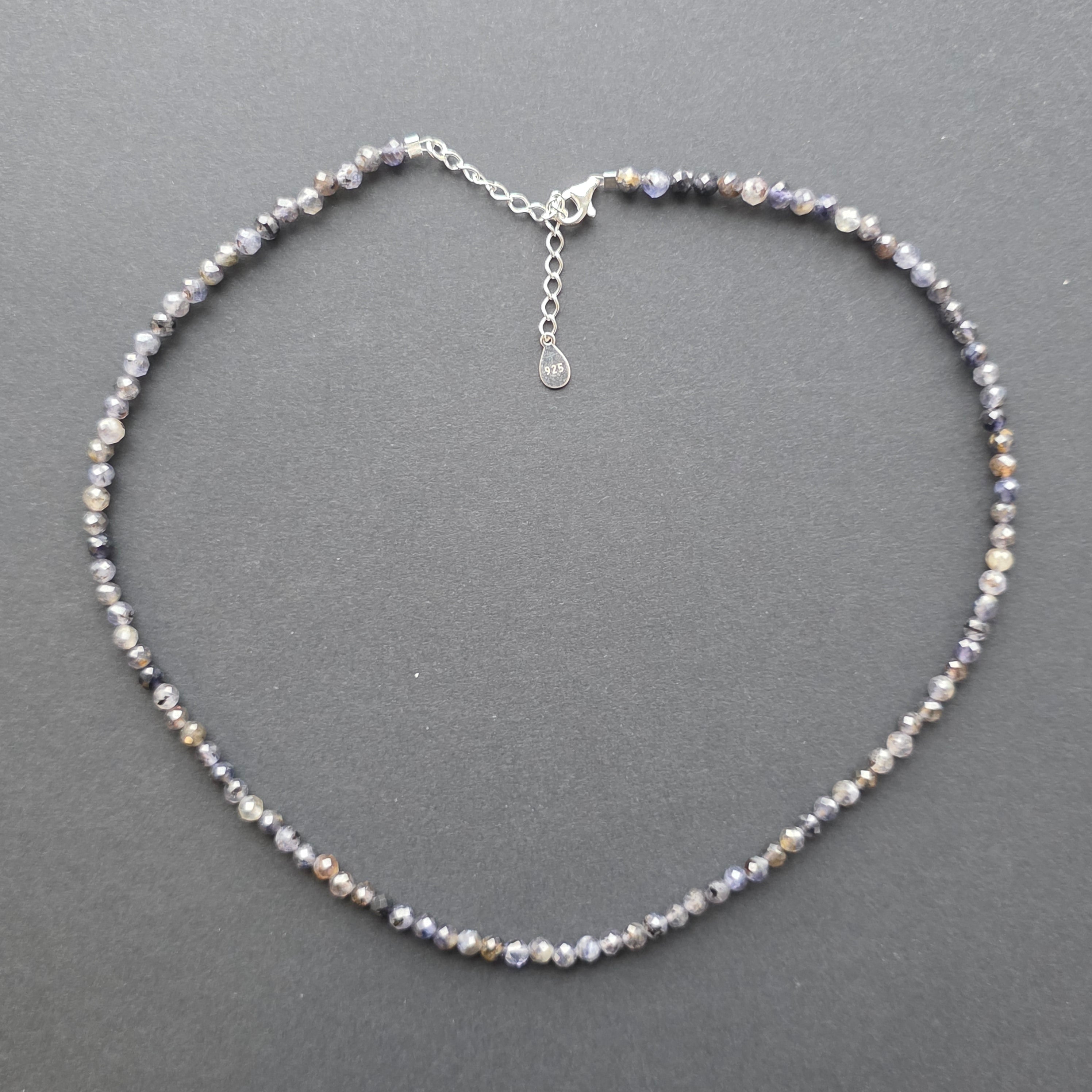 Náhrdelník, ktorý vyzerá, ako by bol vyrezaný zo svetla súmraku. Prírodný fazetovaný iolit 4 mm nesie jemné tóny fialovej a modrej, podobne ako večerná obloha, ktorá postupne stráca svoj lesk nad oceánom. Jemné fazety zachytávajú každú lúč svetla a vytvárajú diskrétny, elegantný a hlboký lesk.