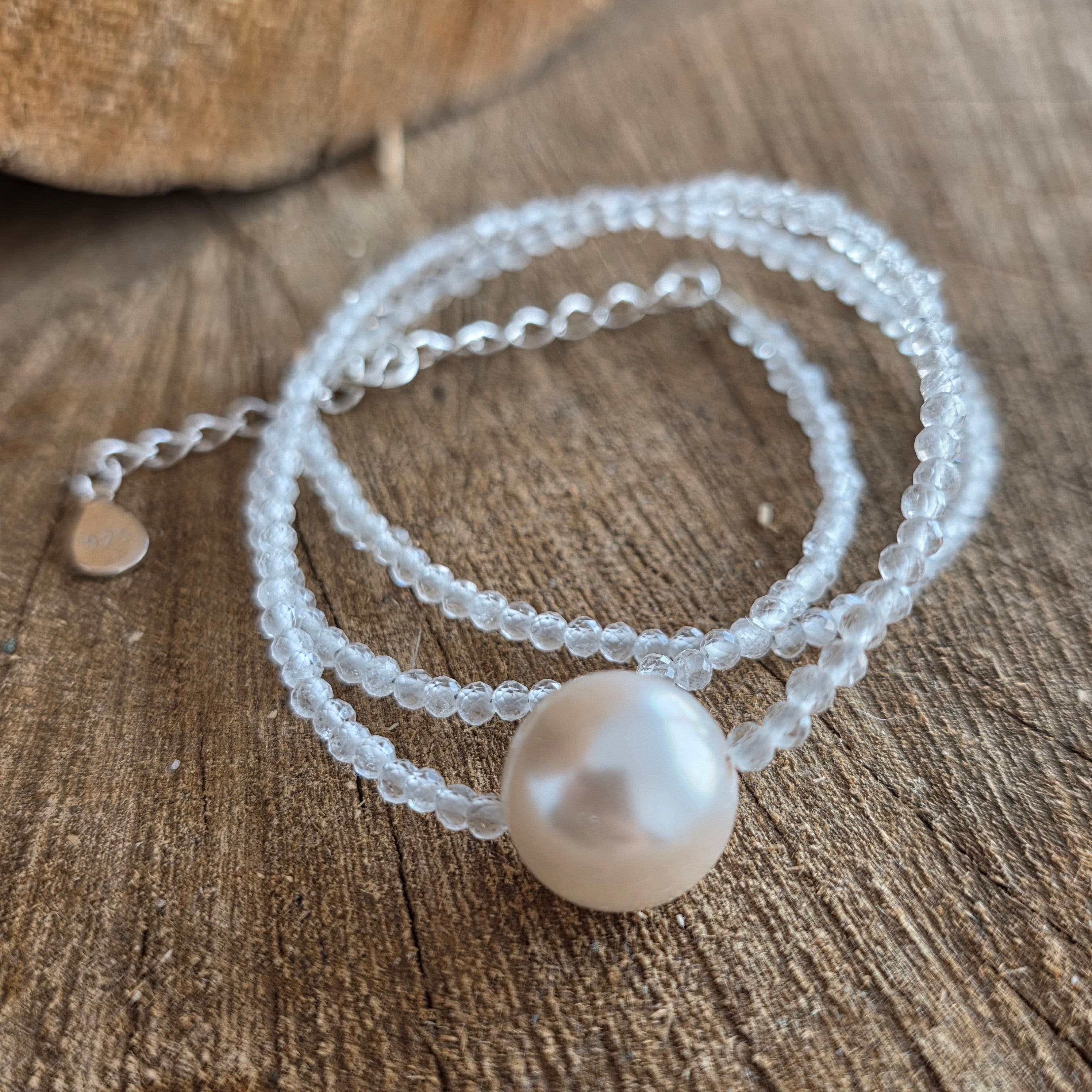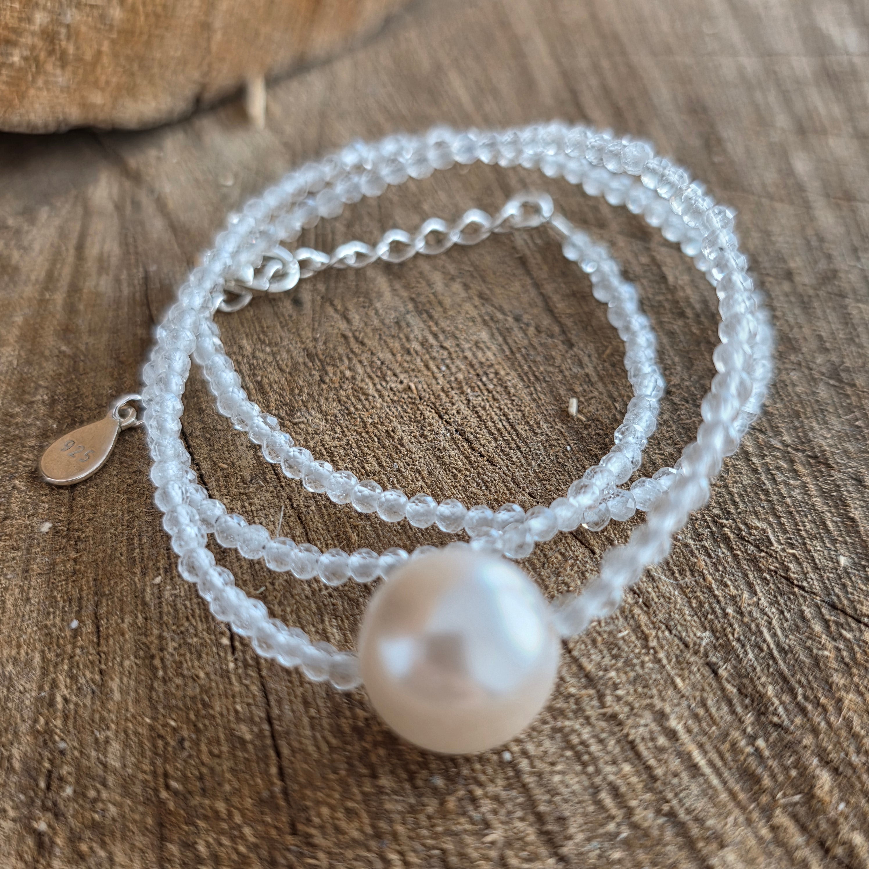 Materiály: prírodný mesačný kameň, fazetované guľôčky 2,5 mm, striebro 925, perla 1 cm