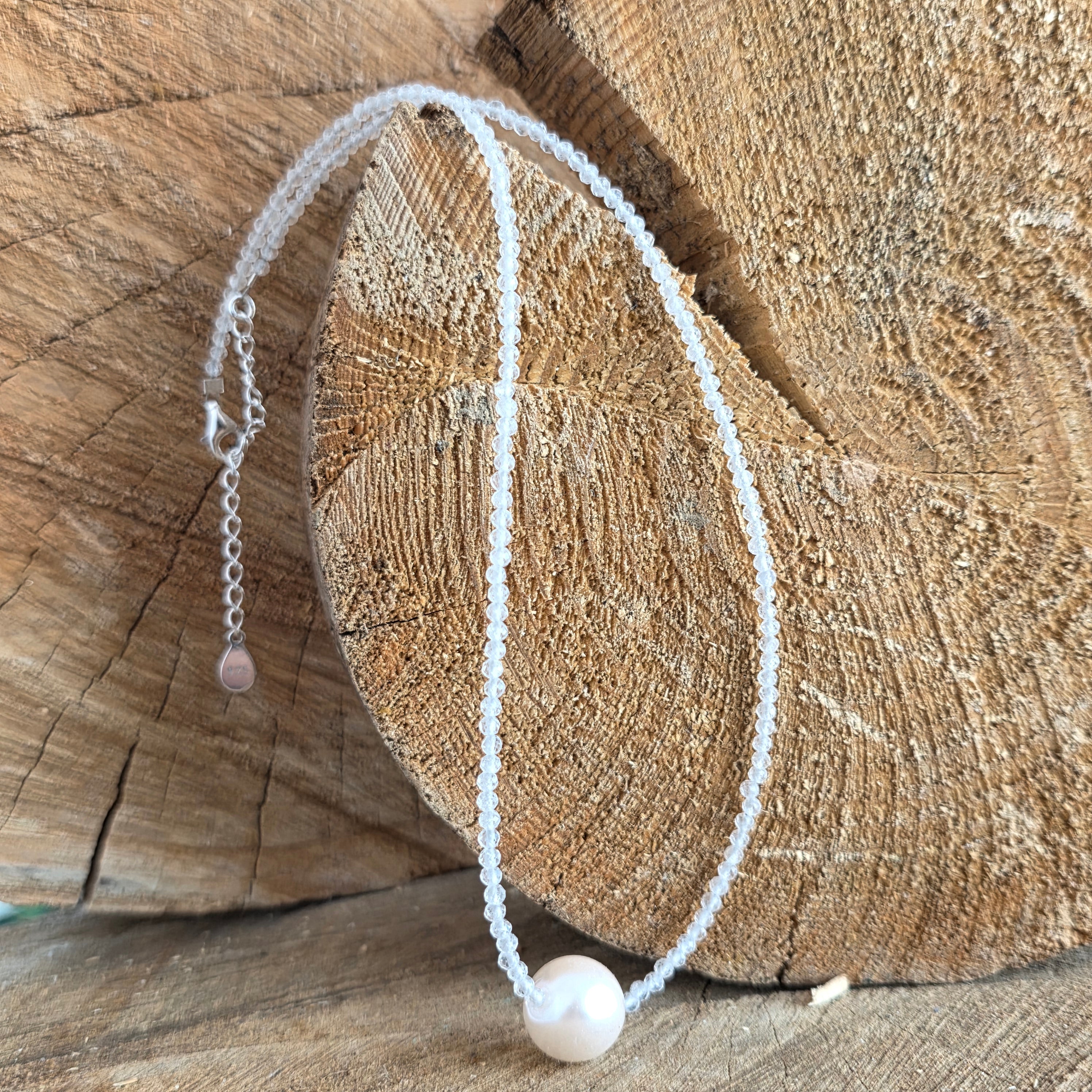 Centrálnym prvkom je prírodná perla s priemerom približne 1 cm, ktorá pridáva klasický a elegantný nádych a harmonicky dopĺňa žiariacu povahu mesačného kameňa. Spoločne tieto prvky vytvárajú vyvážený šperk, vhodný na každodenné nosenie aj na špeciálne príležitosti.