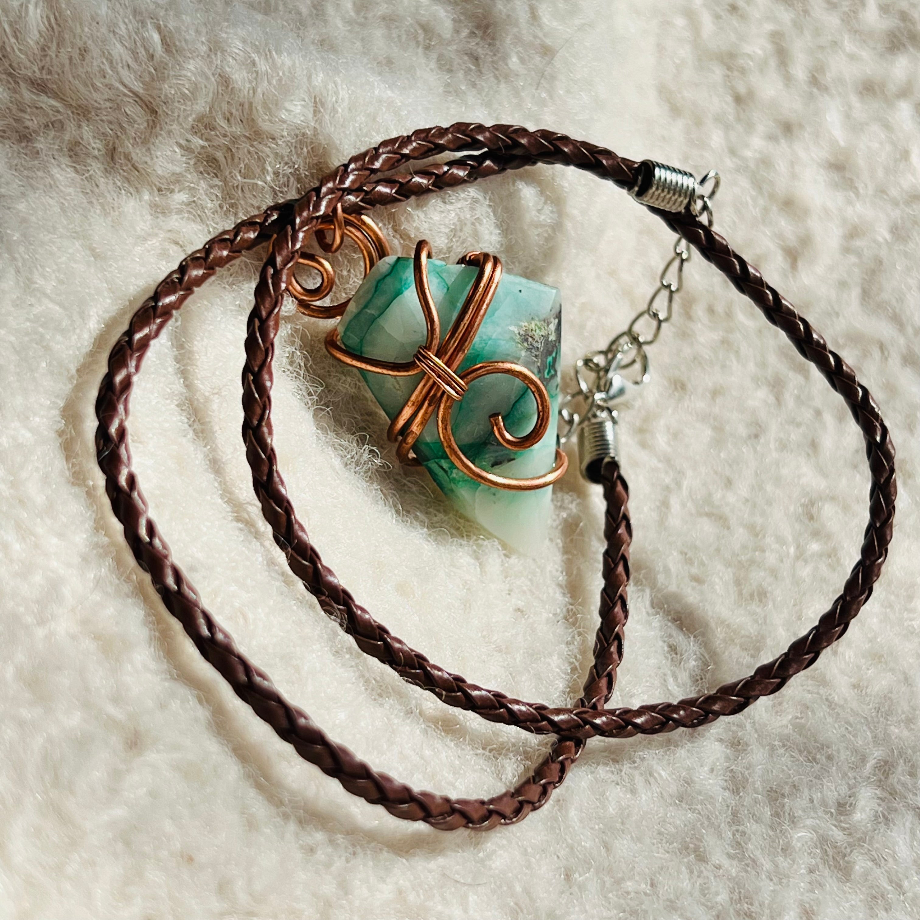 Náhrdelník s príveskom pripevnený umeleckým drôtikom, zapletaná hnedá šnúrka, ručná práca.