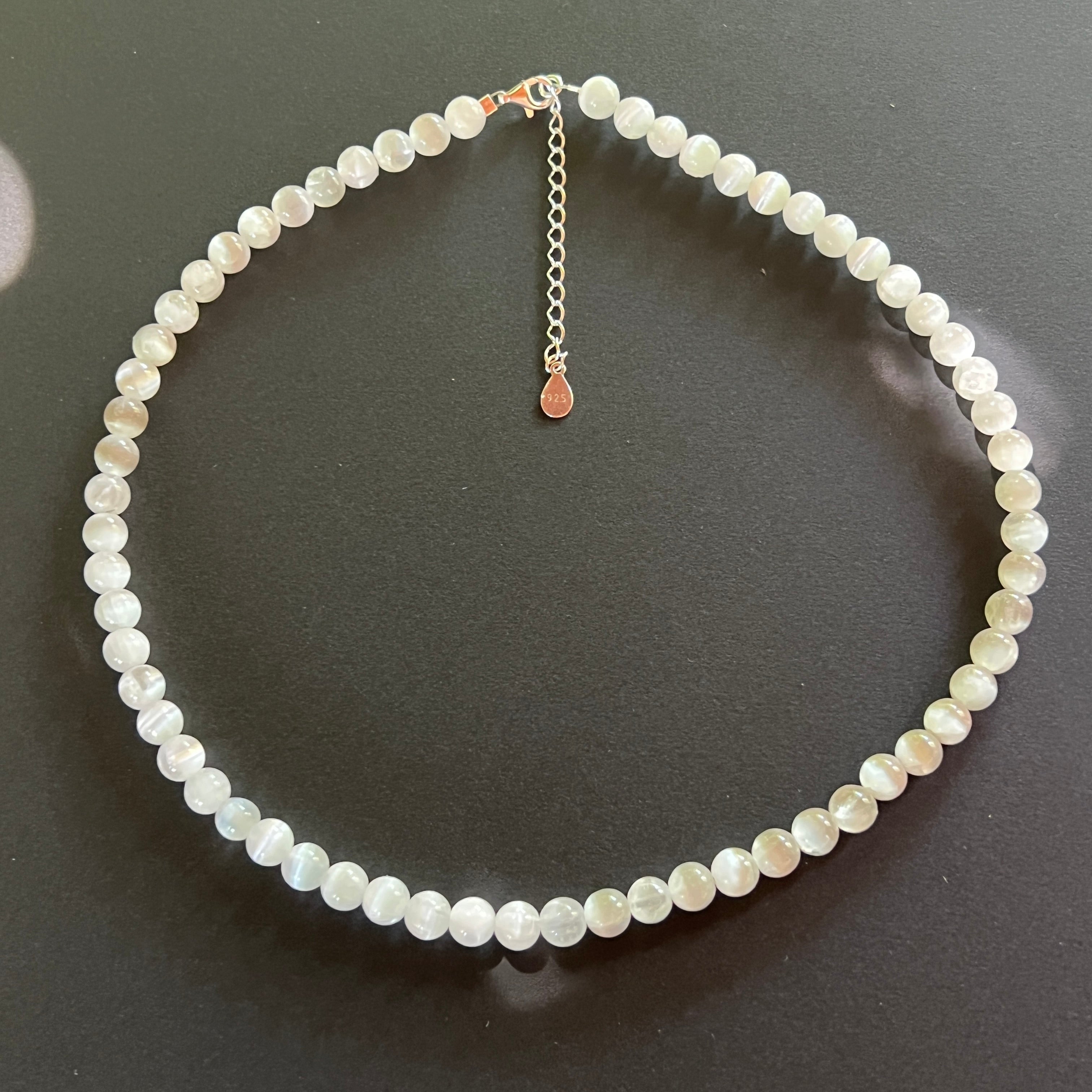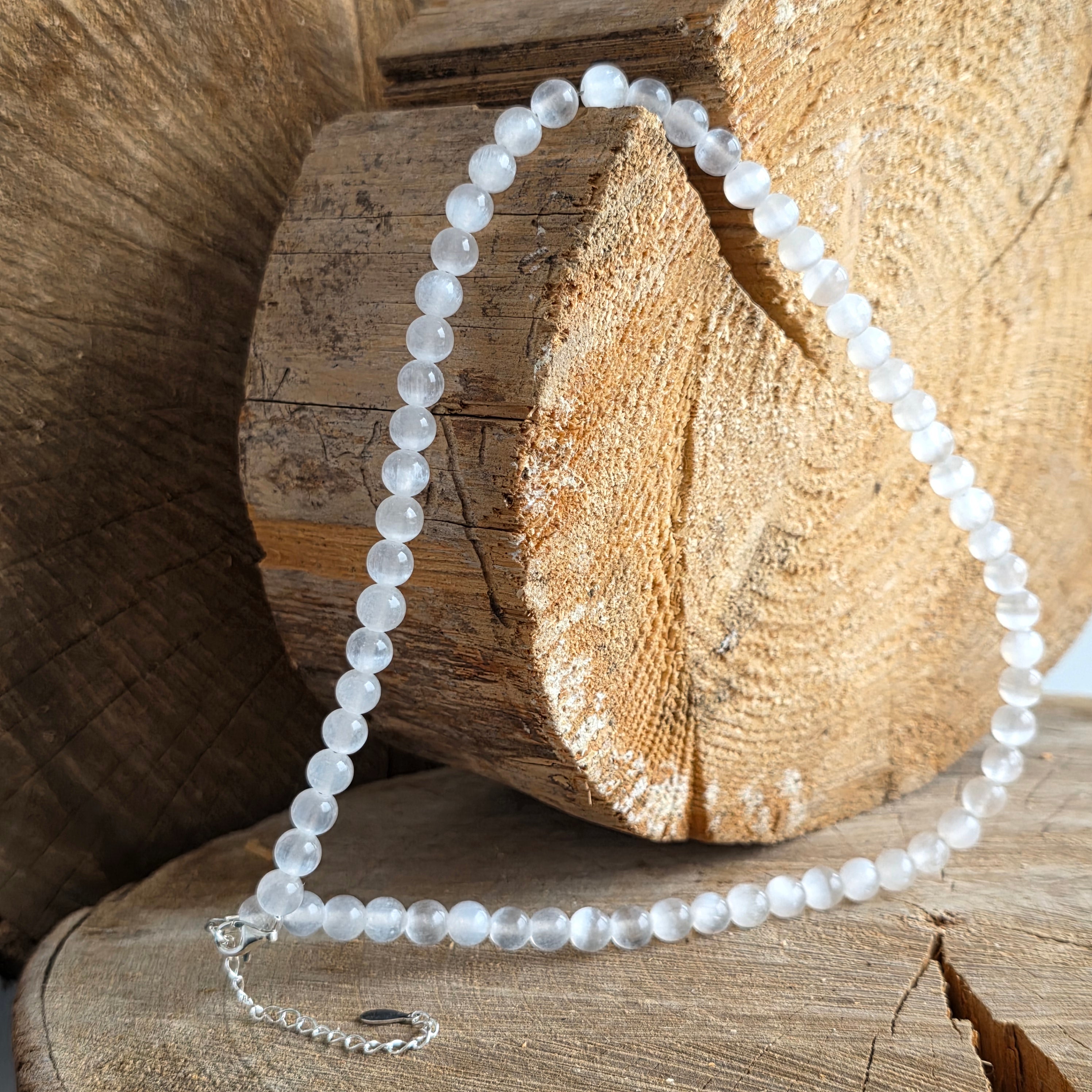 Náhrdelník ako lúč zoslaný do hmoty – zložený z dokonale guľatých prírodných selenitových guličiek o veľkosti 6 mm, z ktorých každá nesie čistotu tichého bieleho rána. Hodvábny a priehľadný povrch odráža svetlo s takmer nereálnou jemnosťou, akoby vydychoval pokoj.