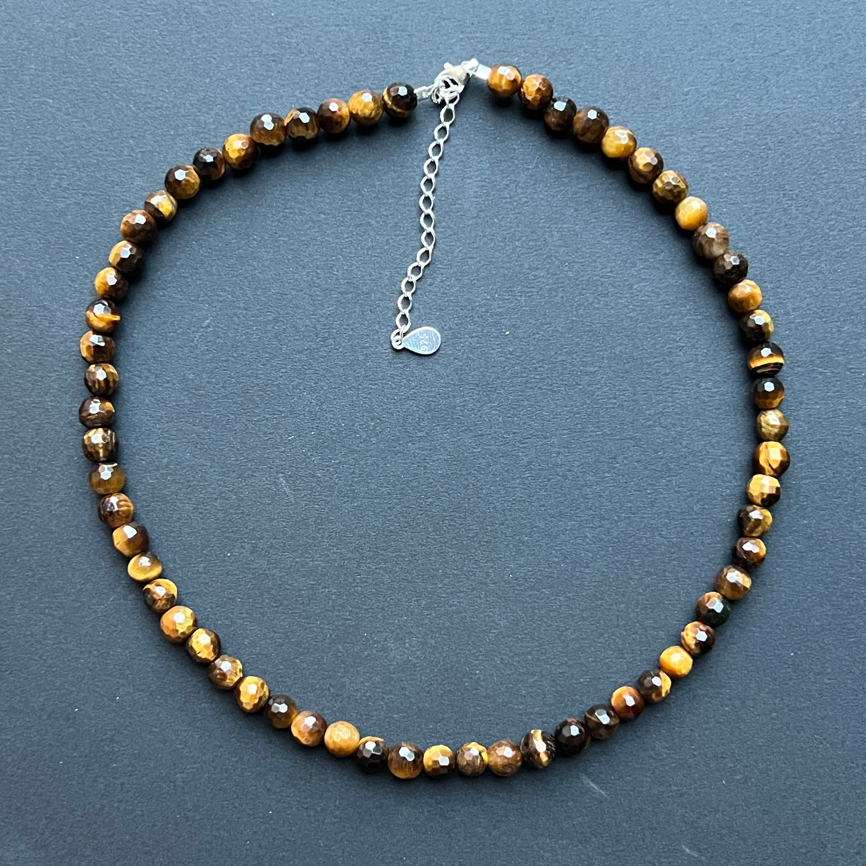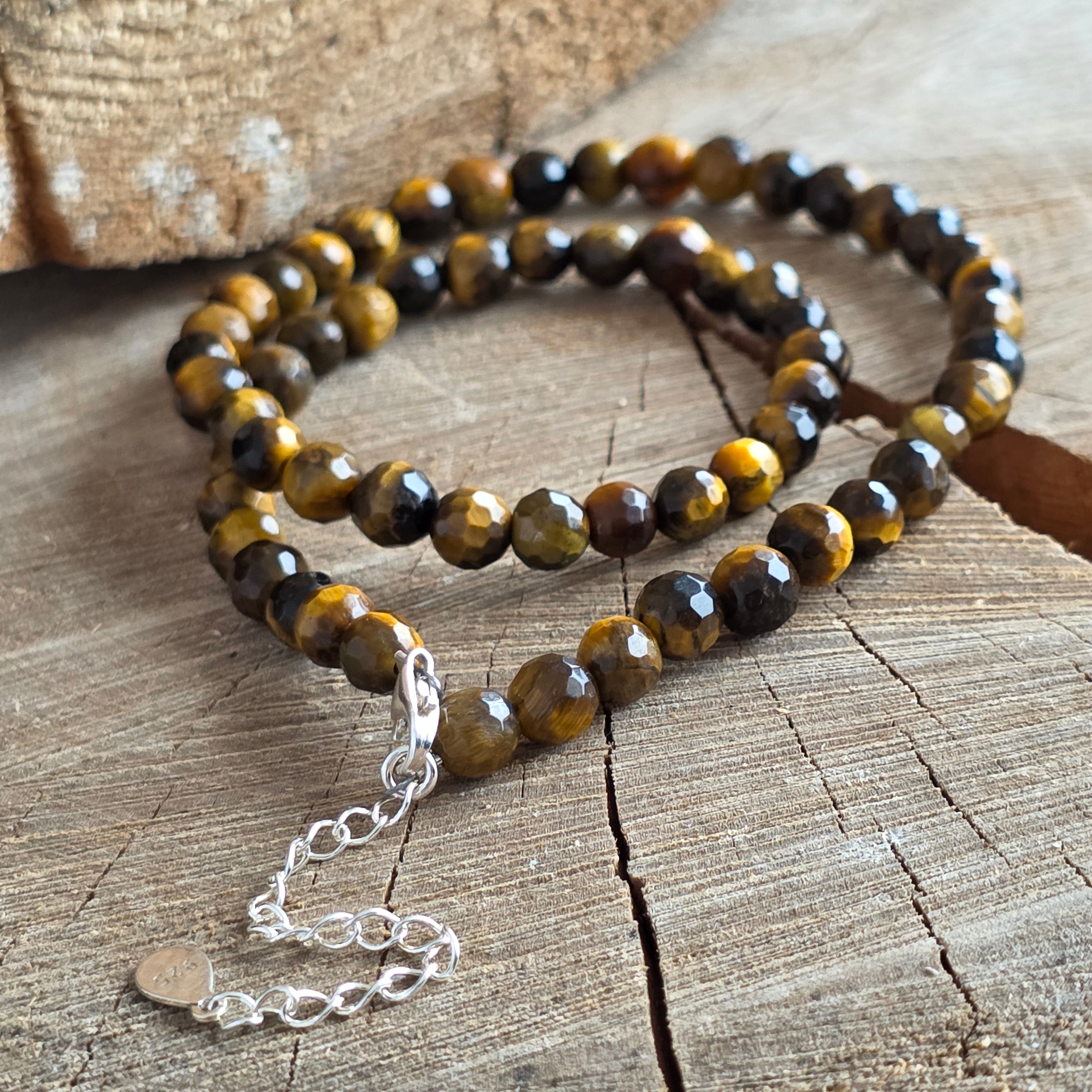 Šperk, ktorý vibruje v zlatistých tónoch a medených tieňoch – ako lúče prechádzajúce hustým listnatým porastom posvätného lesa. Tento fazetovaný náhrdelník z Tigrieho oka s korálkami 6 mm odhaluje jemný lesk, ako sľub vyslovený šepotom samotnou zemou.