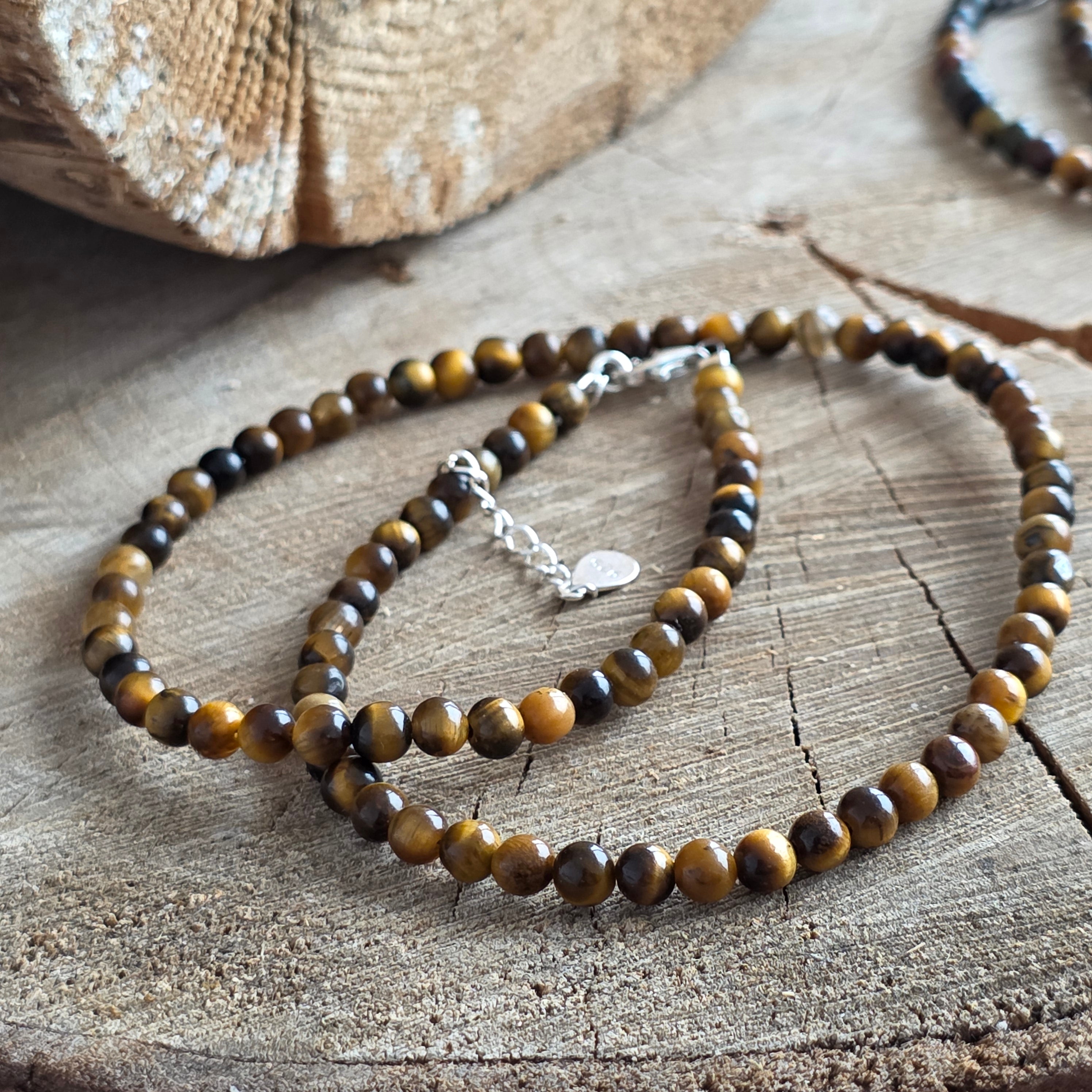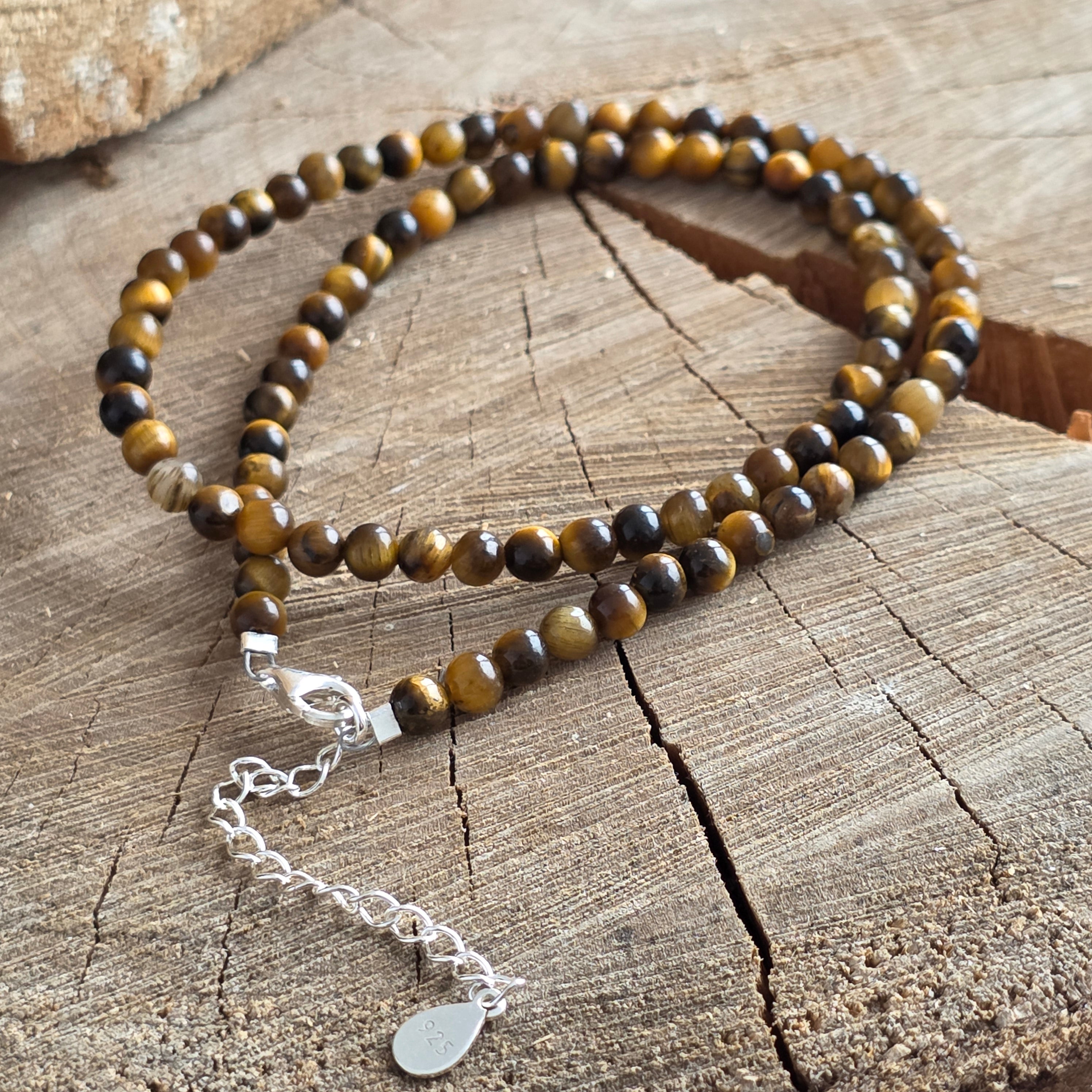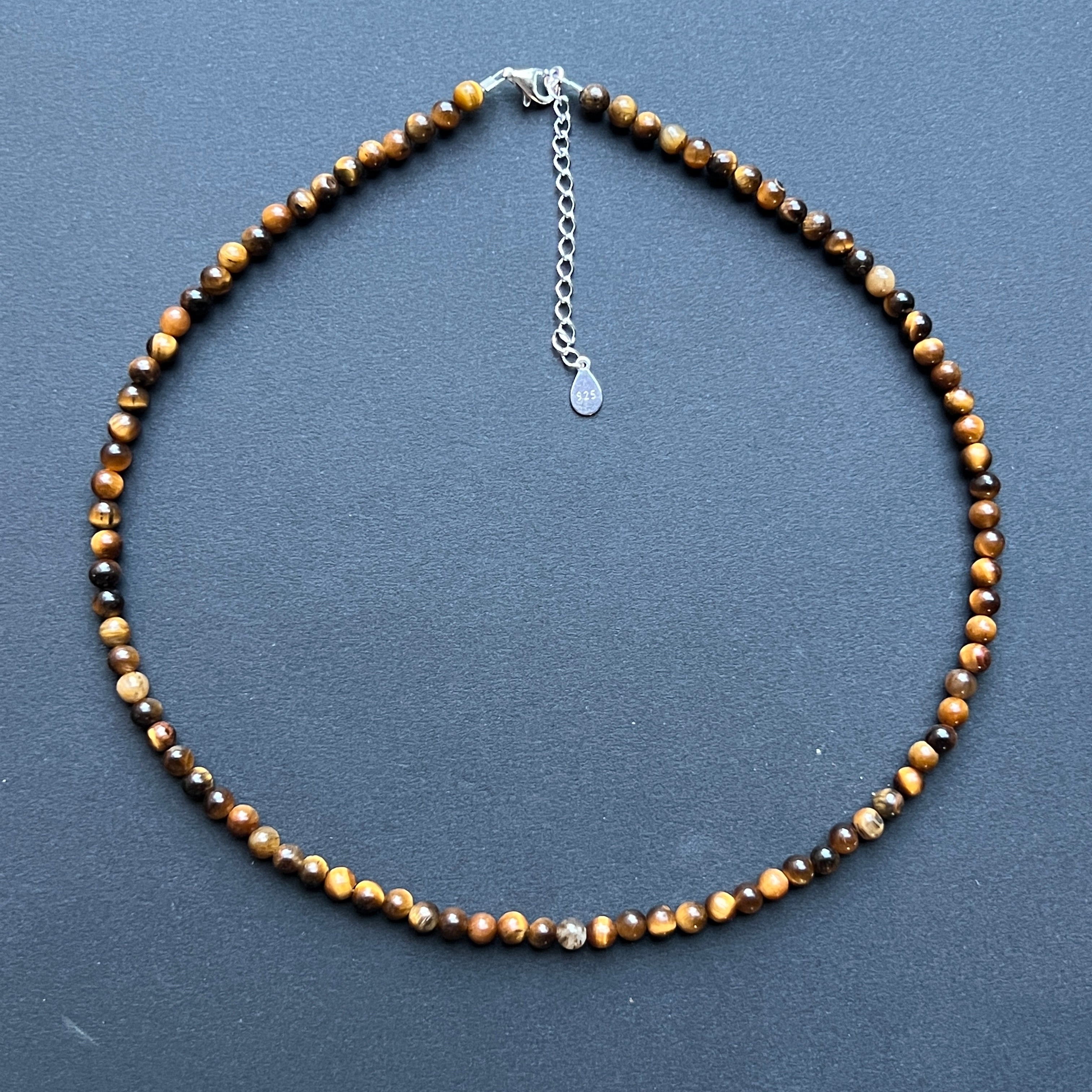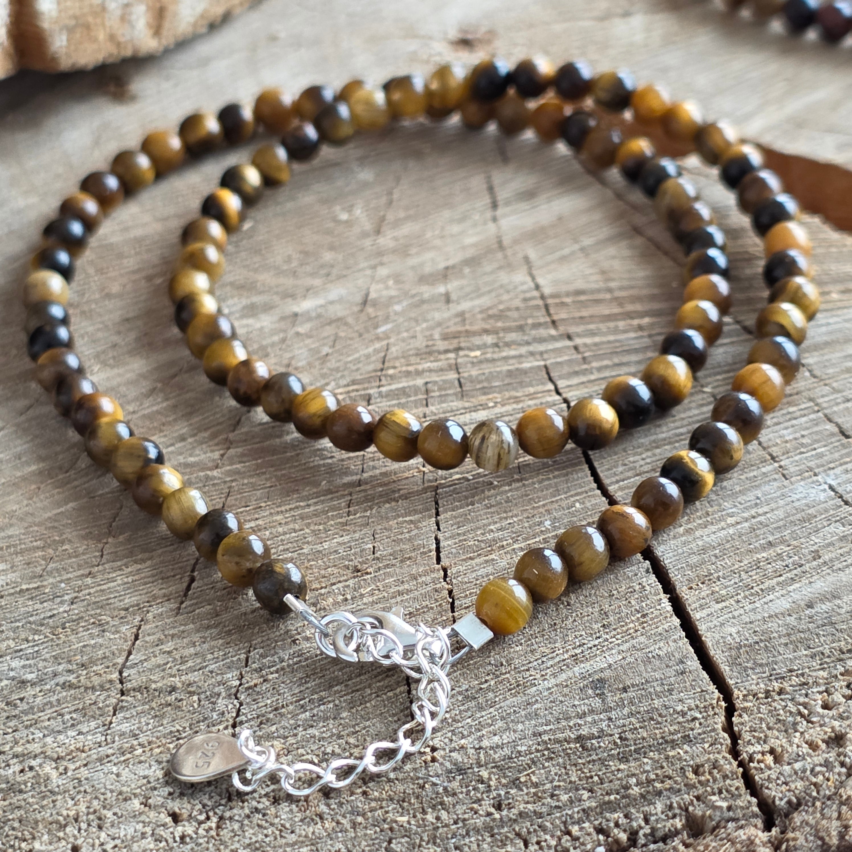 Šperk, ktorý vibruje odtieňmi zlatej a medenej – ako lúče prenikajúce hustým lístím posvätného lesa. Tento náhrdelník z Tigrieho oka s korálkami o veľkosti 4 mm odhaľuje jemný lesk, podobný prísľubu vyslovenému šepotom samotnou zemou.