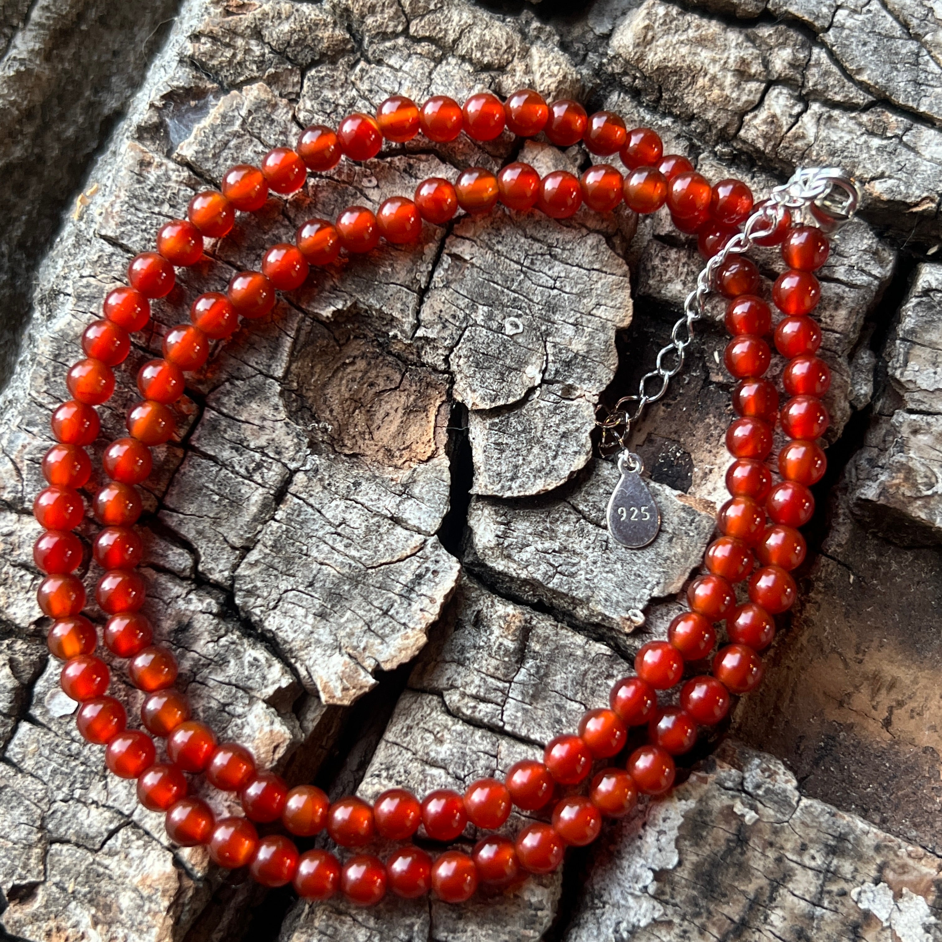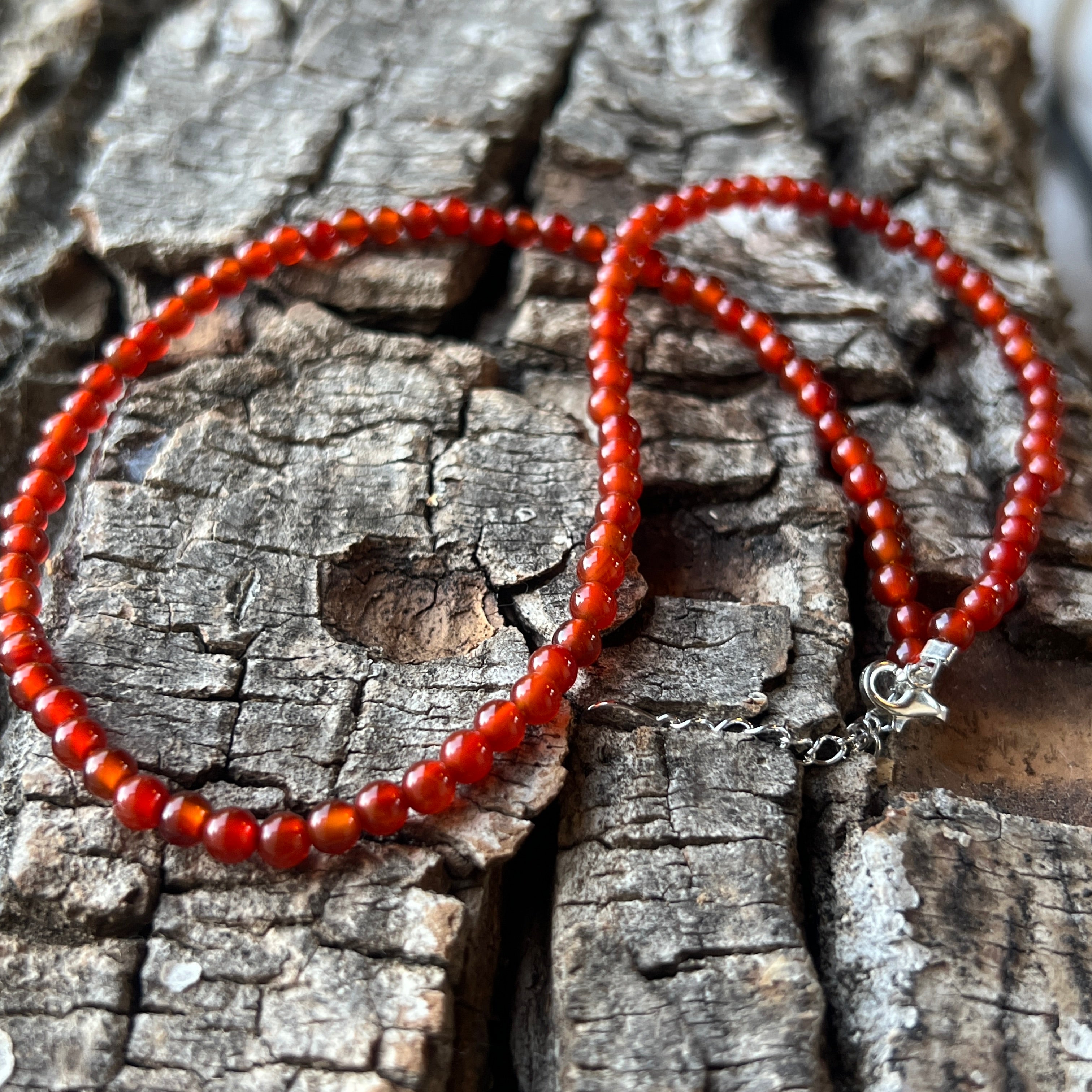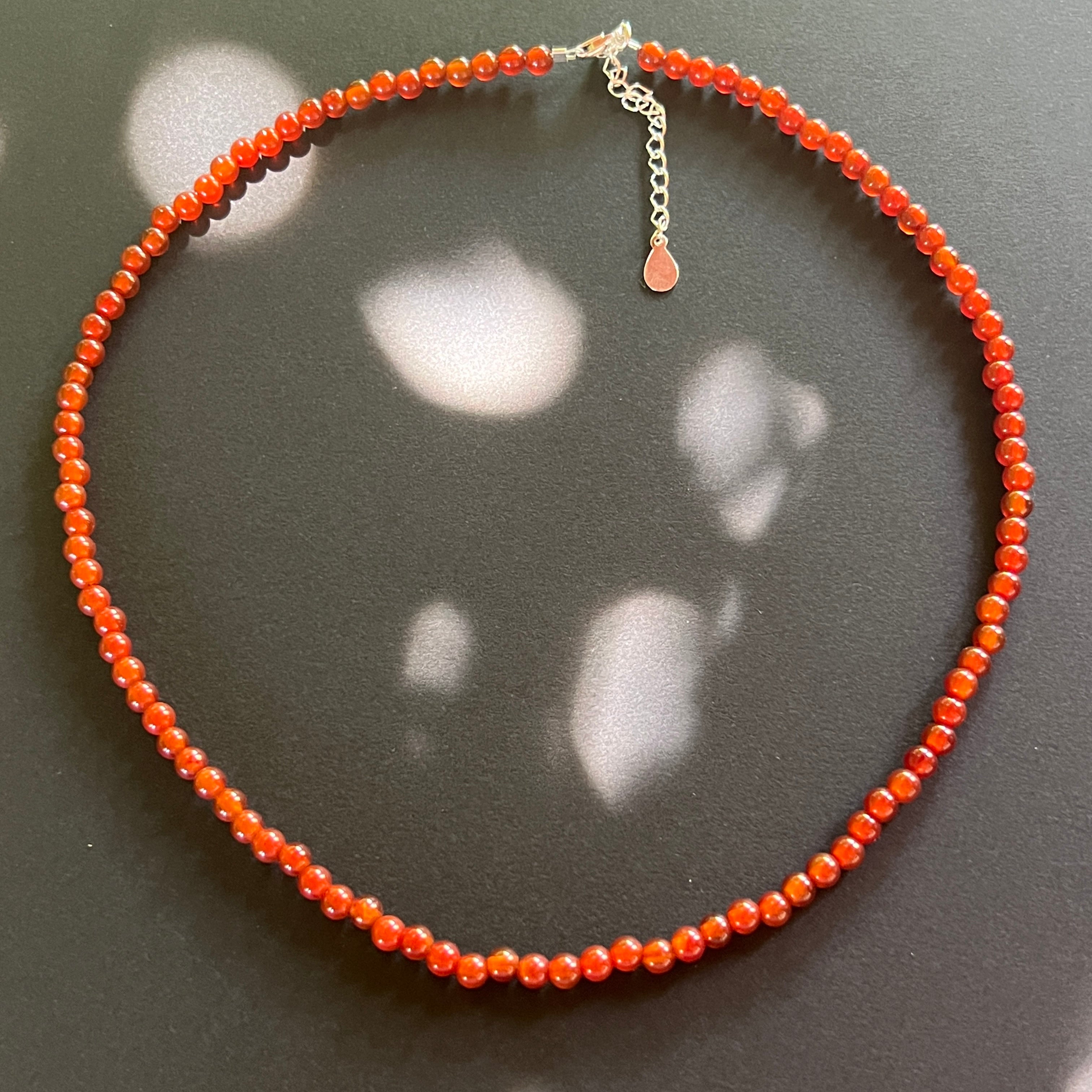 Jemný náhrdelník, ale s horúcim srdcom – zložený z malých guľôčok červeného karneolu, dokonale guľatých, o veľkosti 4 mm, ako minerálne iskry, ktoré ticho a nepriamo obklopujú váš krk.