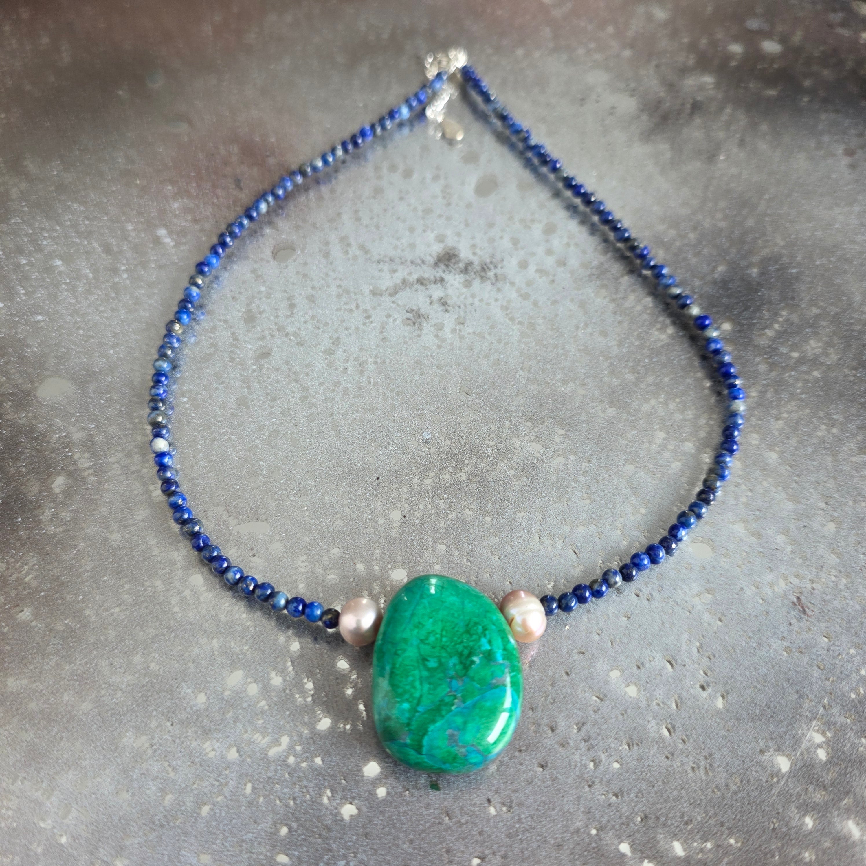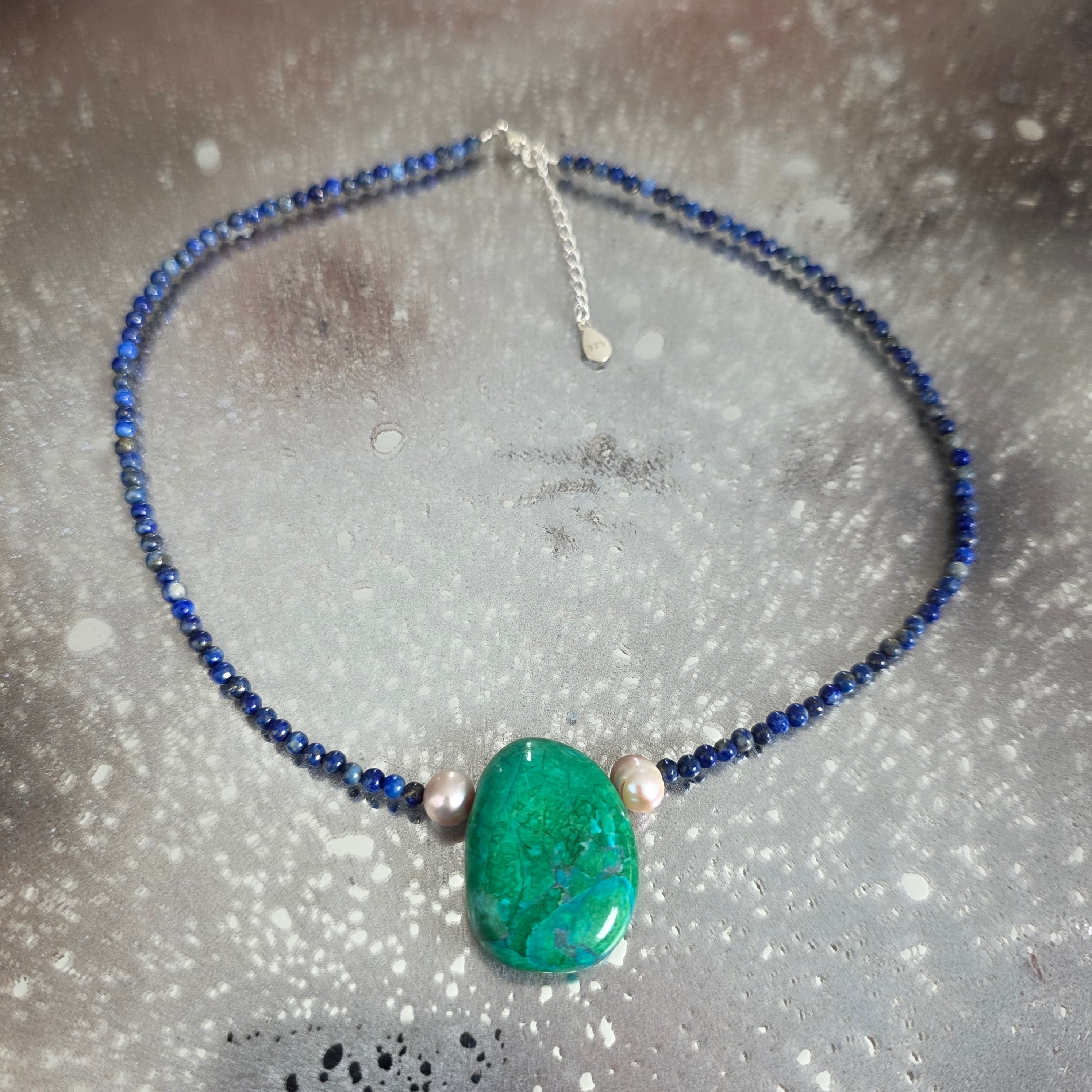 Náhrdelník ako ponor do hlbokého neba, s nádychom vlhkej zeme a hmly. Deep je šperk, ktorý spája silu sýtych farieb s nedokonalou eleganciou prírodných tvarov – kus pre ženu, ktorá sa nebojí skúmať priestory medzi emóciami.