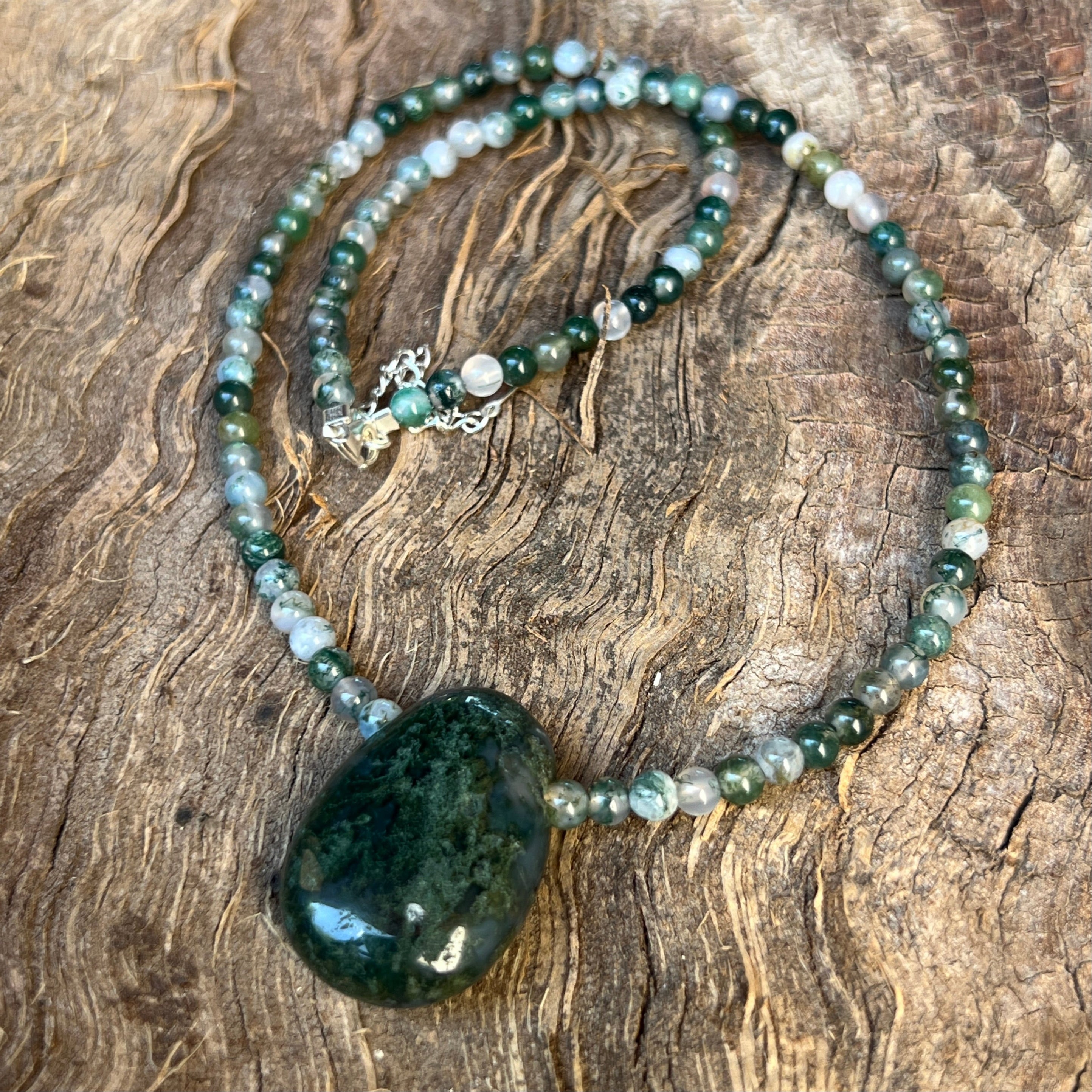 Náhrdelník ako les v miniatúre, nosený na krku – zelený, organický, plný života a tajomstva. Korálky z machového achátu o veľkosti 4 mm odhaľujú miniatúrne krajiny: priehľadné tvary s zelenkastými žilkami, ktoré pripomínajú mach, listy a korene pulzujúce v hĺbke.