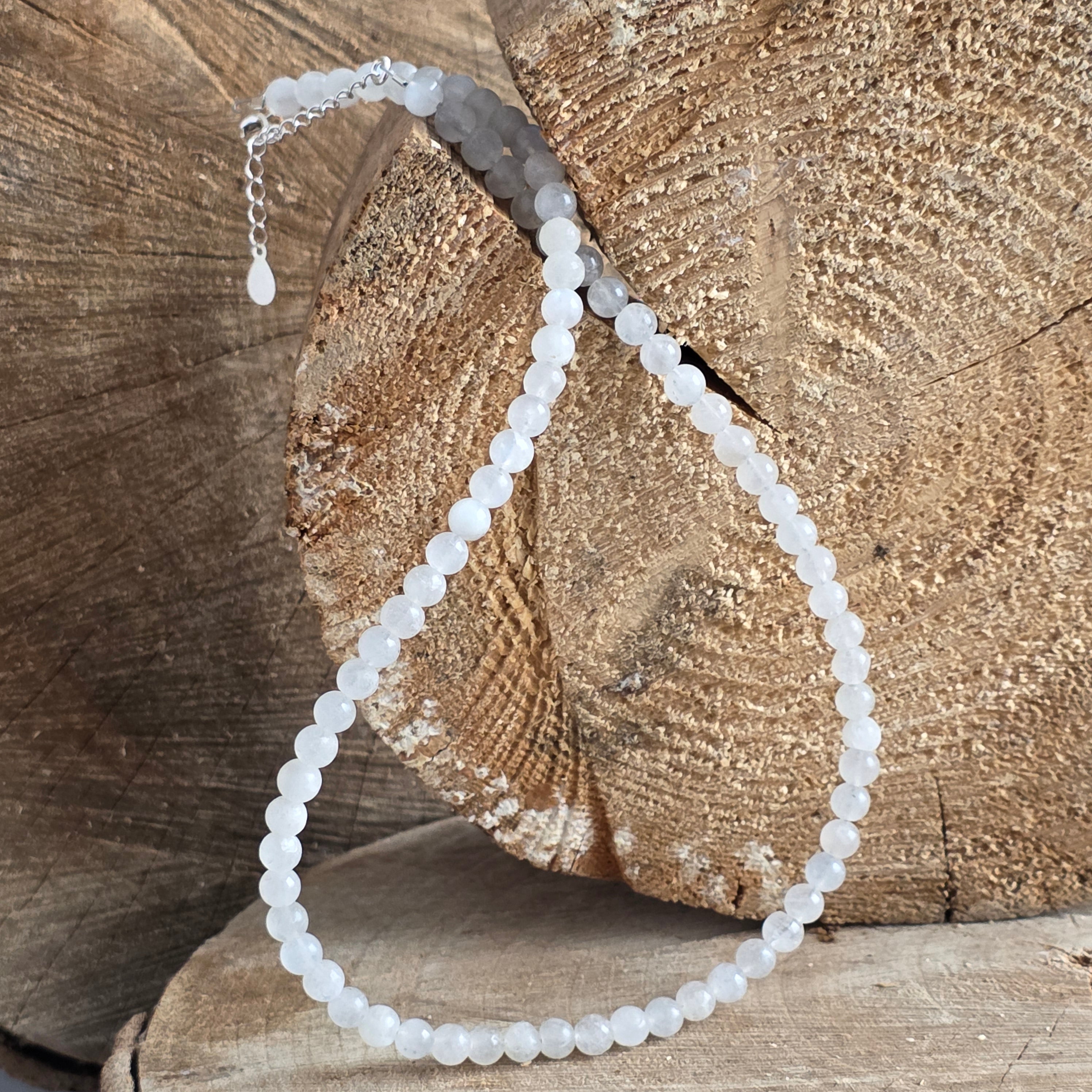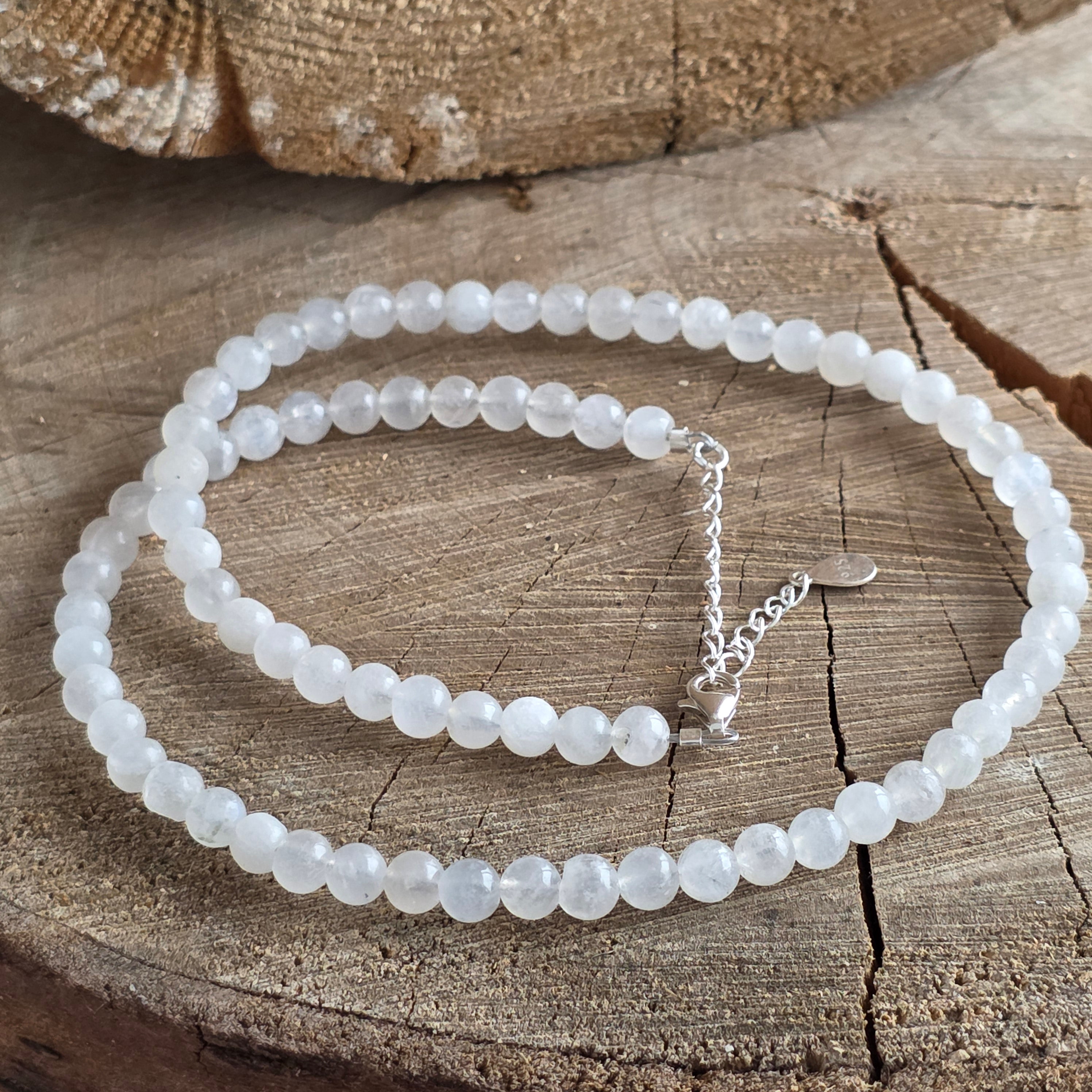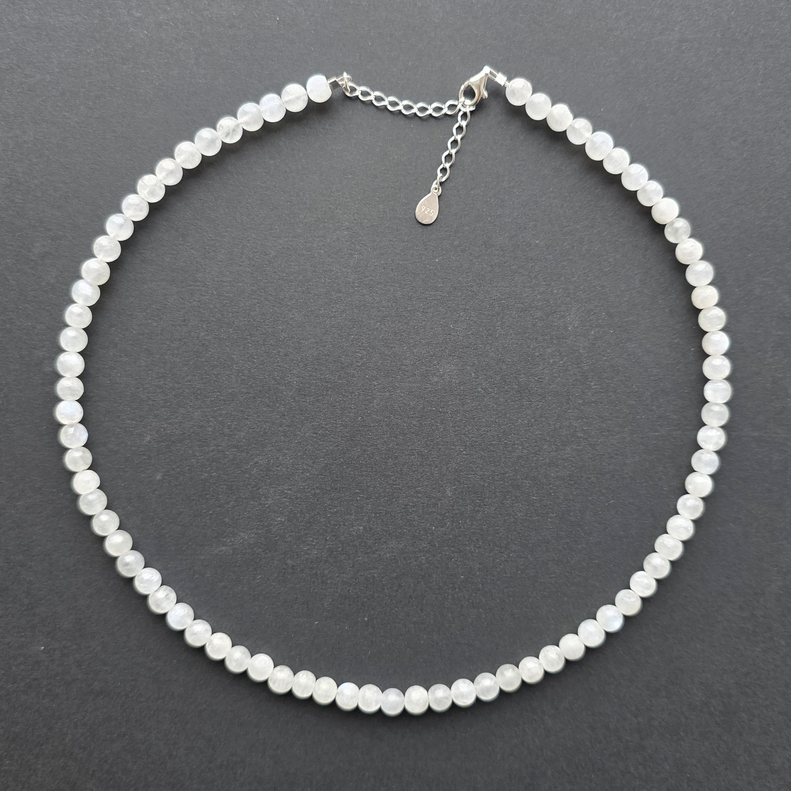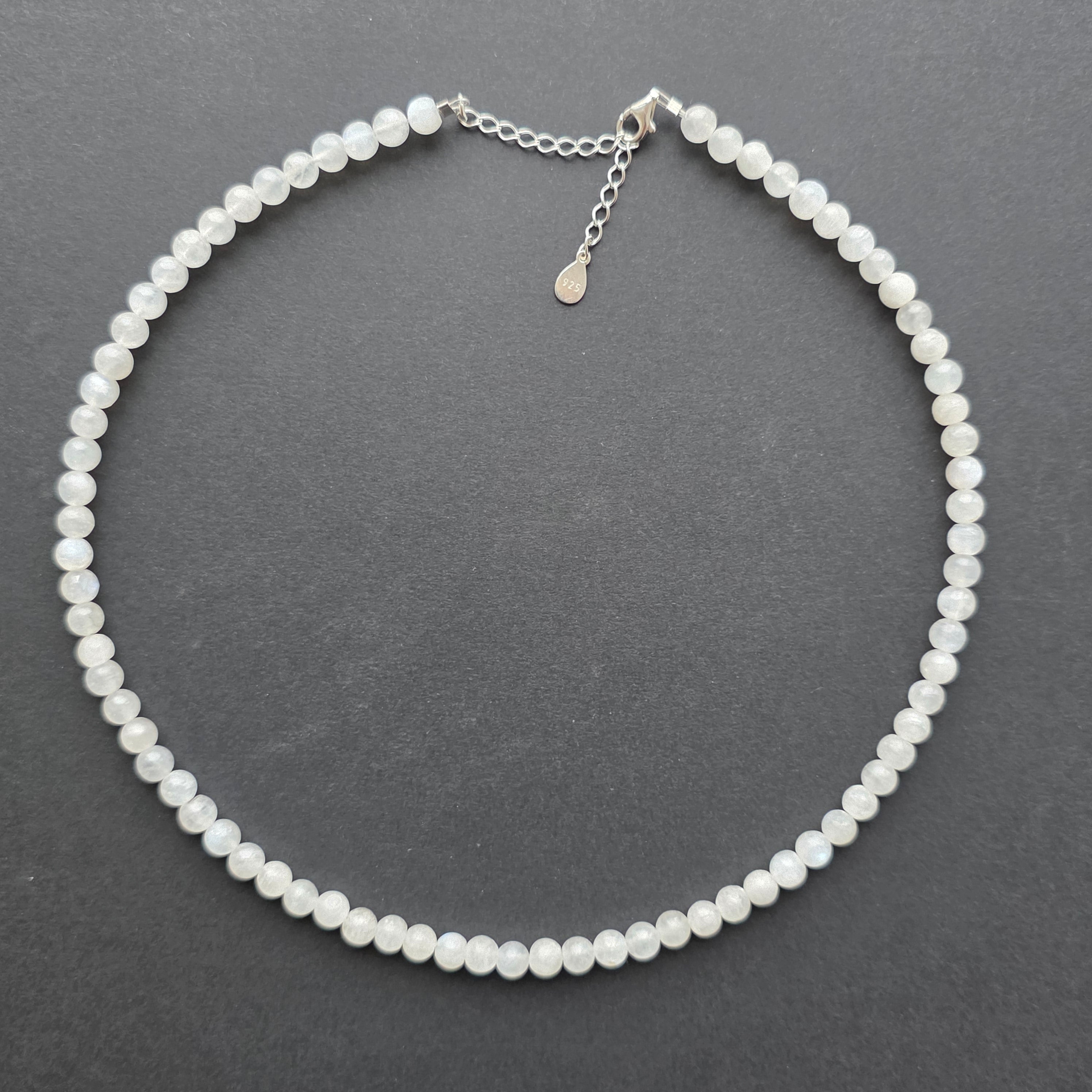 Náhrdelník, ktorý nesie mesačné svetlo vo svojej najjemnejšej podobe. Prírodný mesačný kameň o veľkosti 6 mm, s modrými a perleťovými odleskami, jemne tancuje pri každom pohybe, ako lúč zachytený medzi vodou a nebom. Perfektne guľaté korálky vytvárajú elegantnú a ženskú líniu a zapínanie zo striebra 925 pridáva nádych sofistikovanosti a odolnosti.