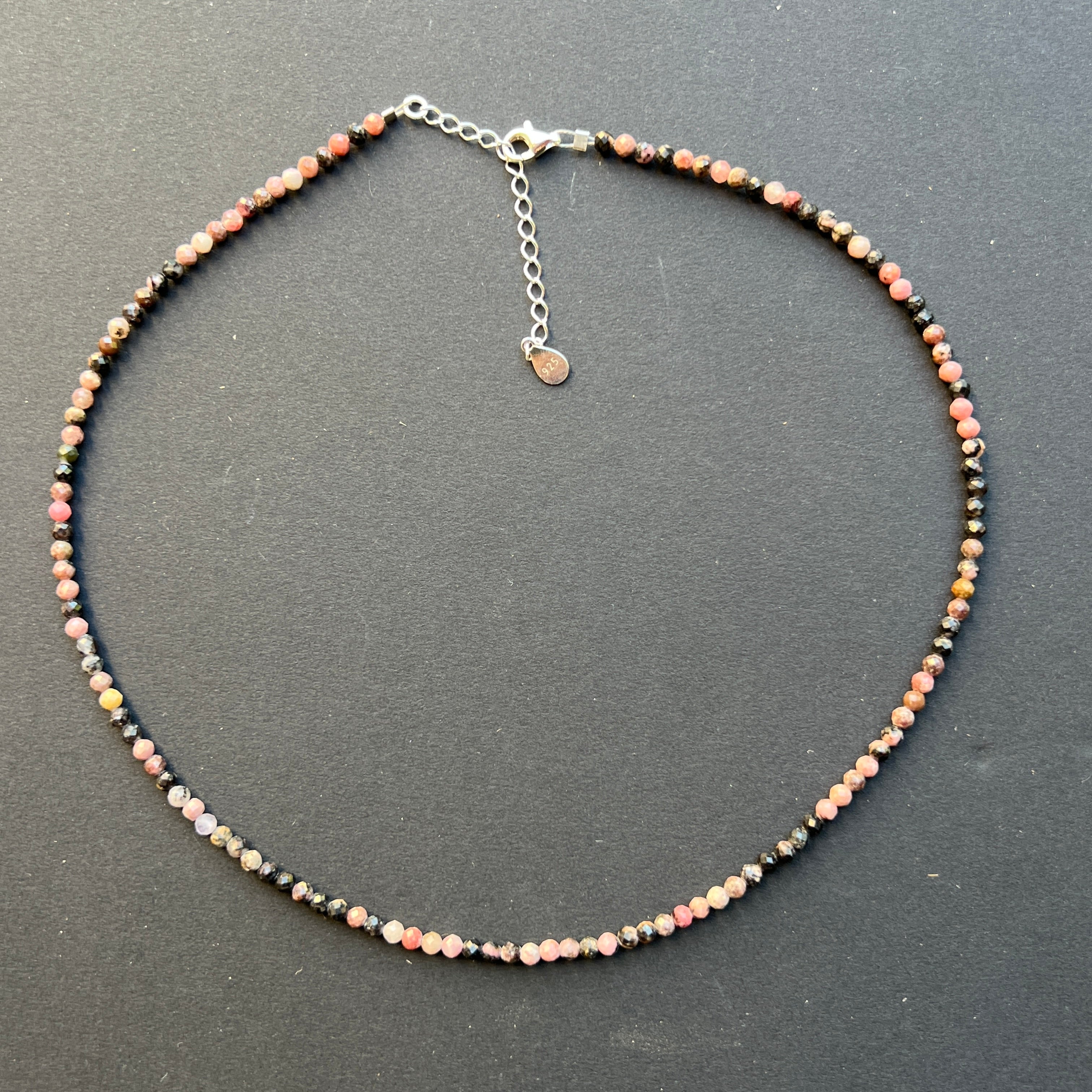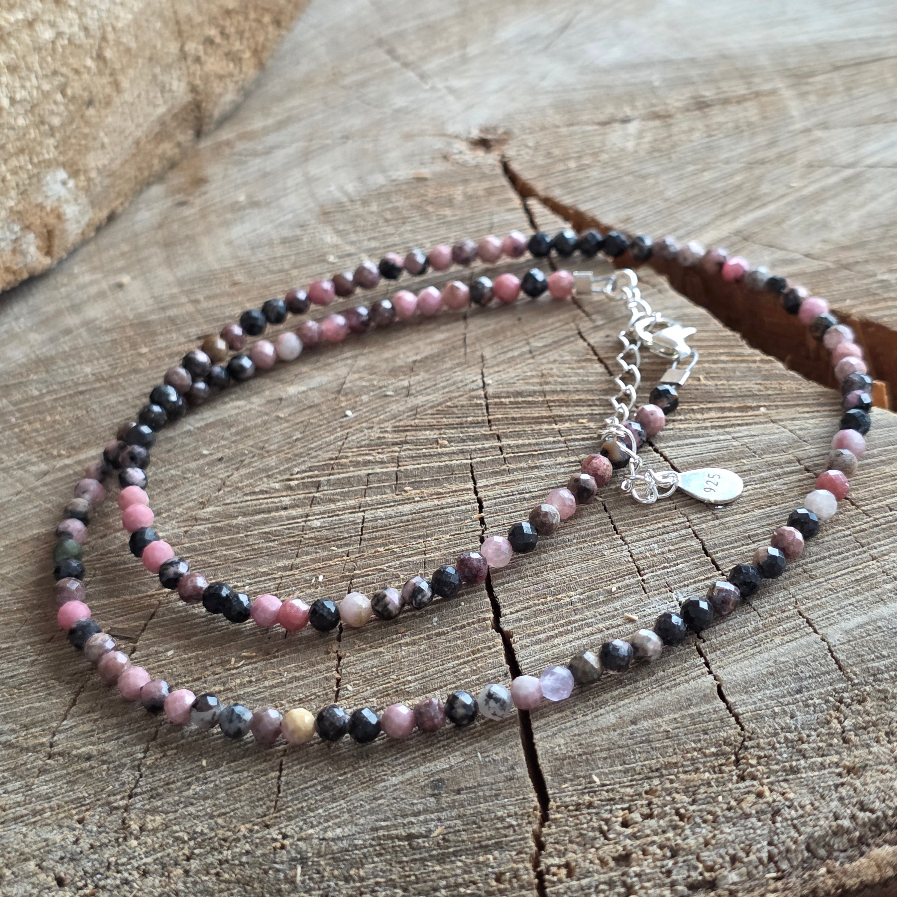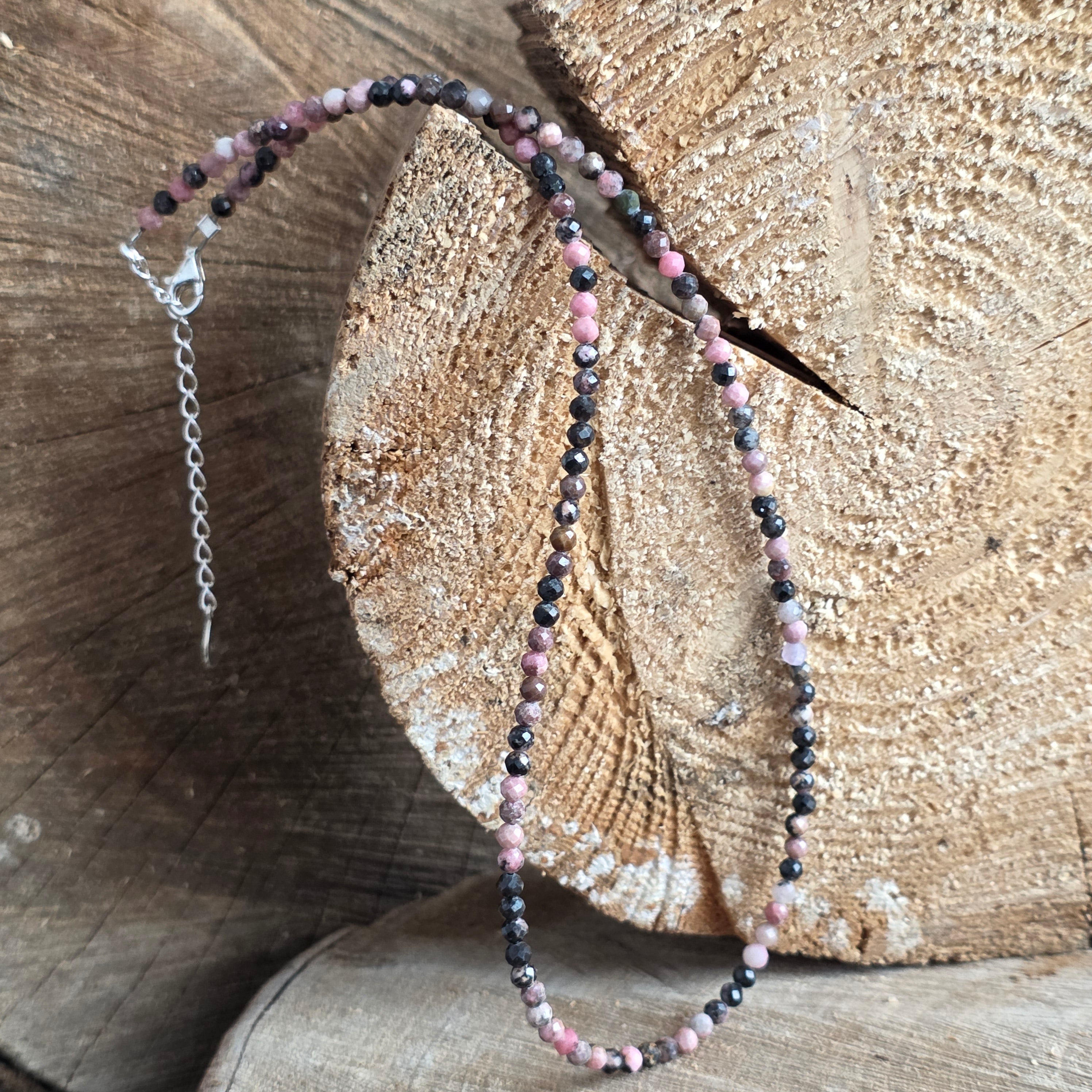 Náhrdelník, ktorý vibruje teplými odtieňmi ružovej s hnedastými tieňmi – ako emócia, ktorá sa rodí z hlbín a pomaly vystupuje na povrch. Vyrobený z prírodného rodonitu, s fazetovanými guľôčkami o priemere 4 mm, náhrdelník zachytáva eleganciu zraniteľnosti a jemnú silu uvedomelej lásky.