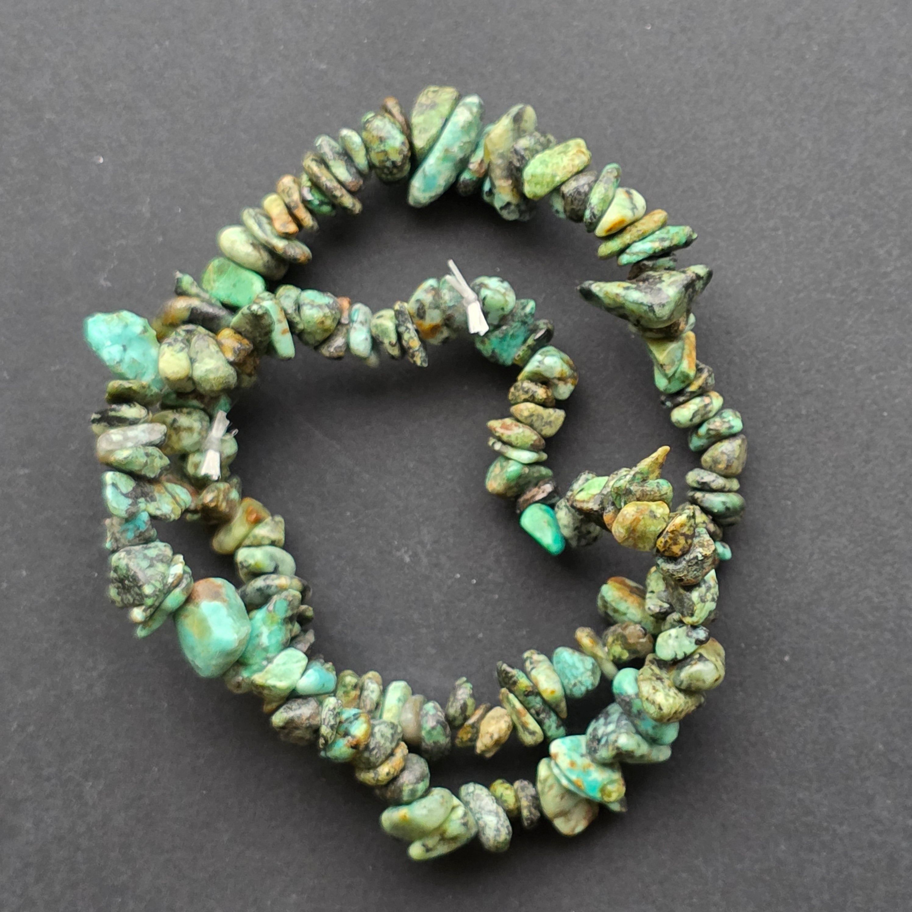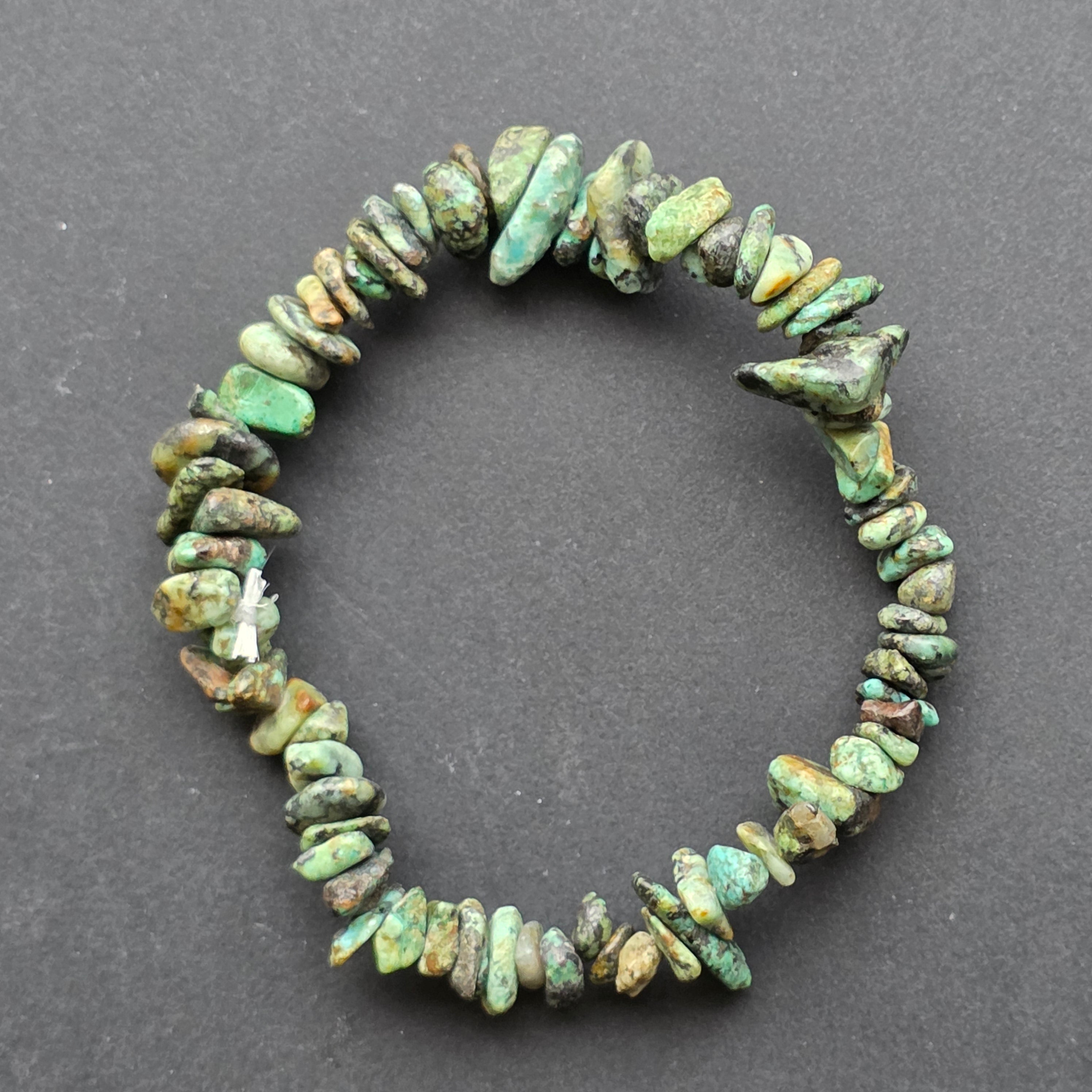 • Kameň: africký tyrkys (African Turquoise) – nepravidelné drťové kusy, ručne brúsené