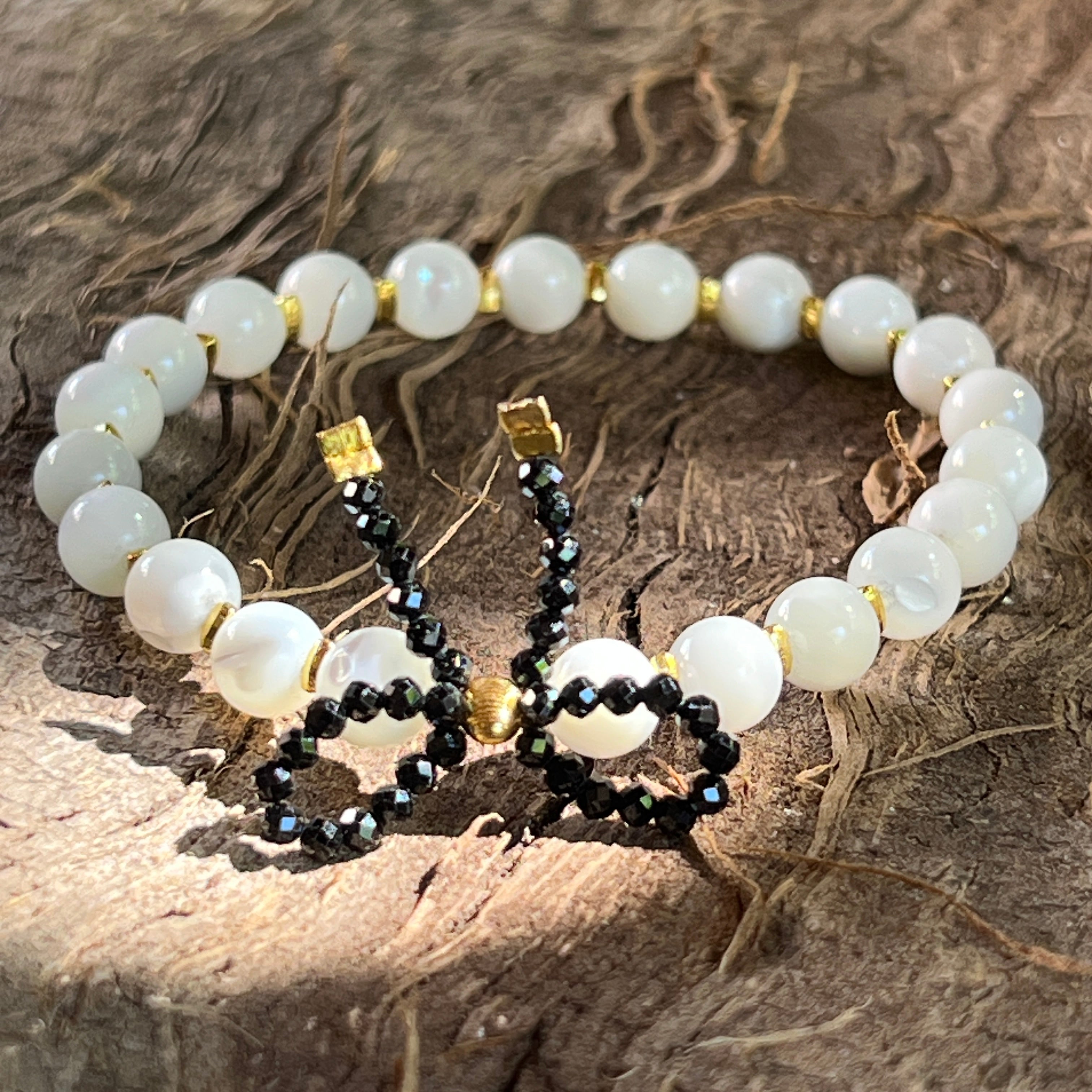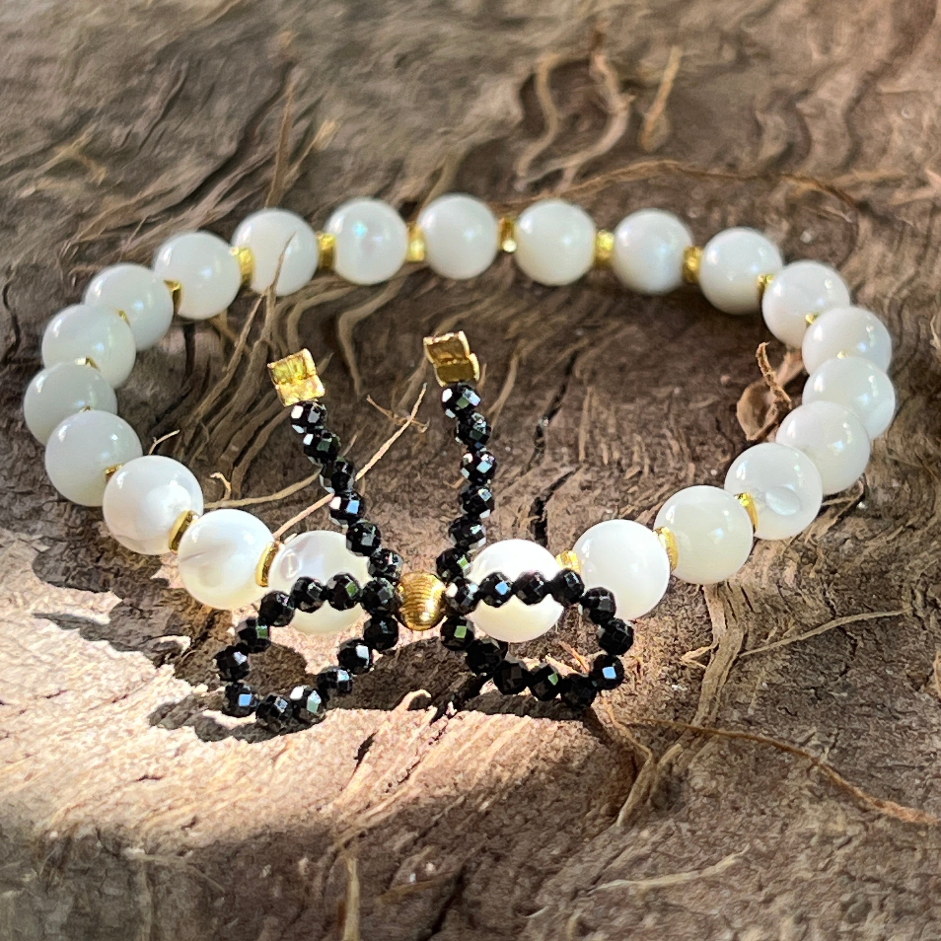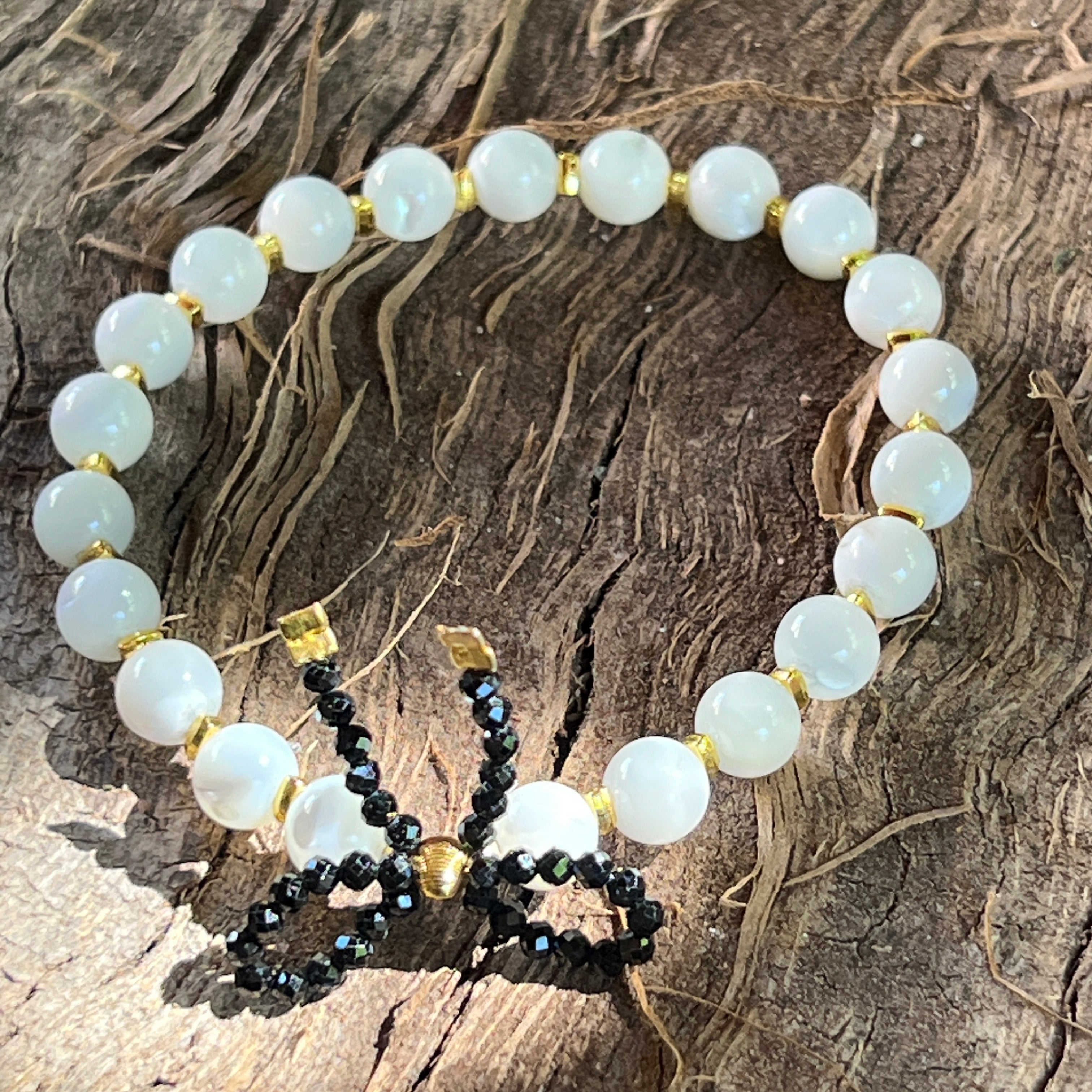 Náramok z perlete s dekoratívnym uzlom z čierneho turmalínu – guľové korálky 6 mm