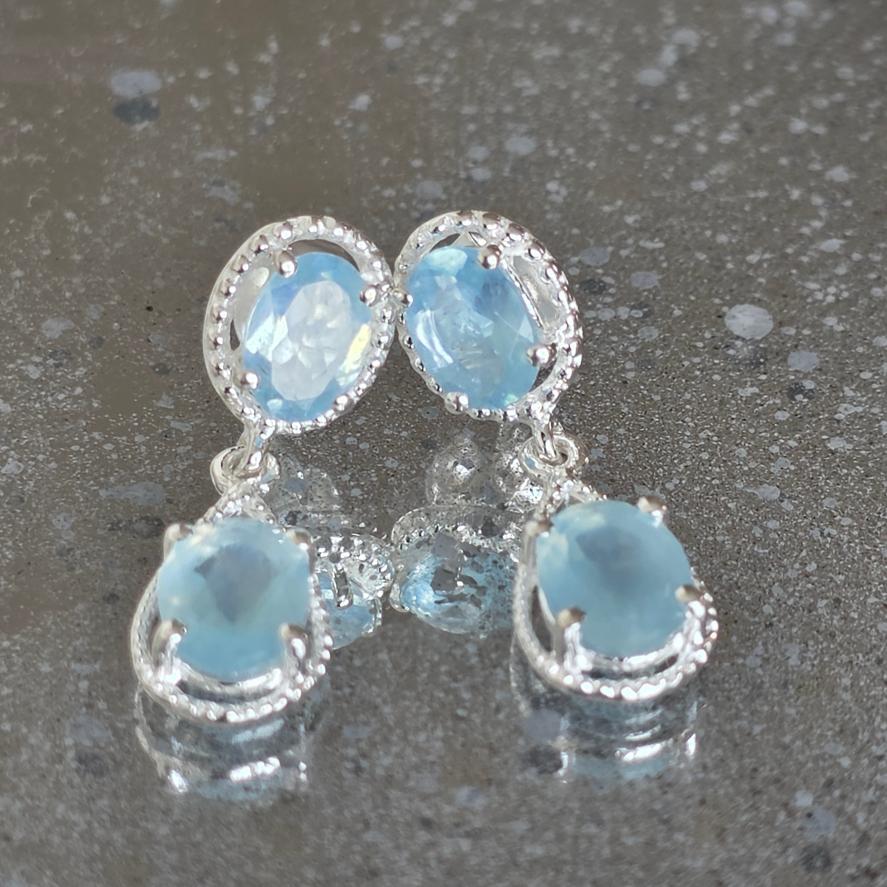 Ich jemné odtiene modrej sa harmonicky dopĺňajú, odrážajú svetlo subtílnym spôsobom a dodávajú svieži, ale vyvážený vzhľad. Jemný rám zo striebra 925 zvýrazňuje tvar kameňov bez toho, aby vizuálne zaťažil šperk.