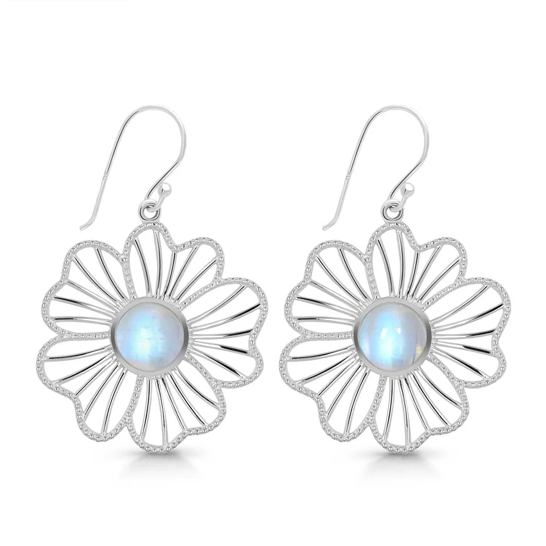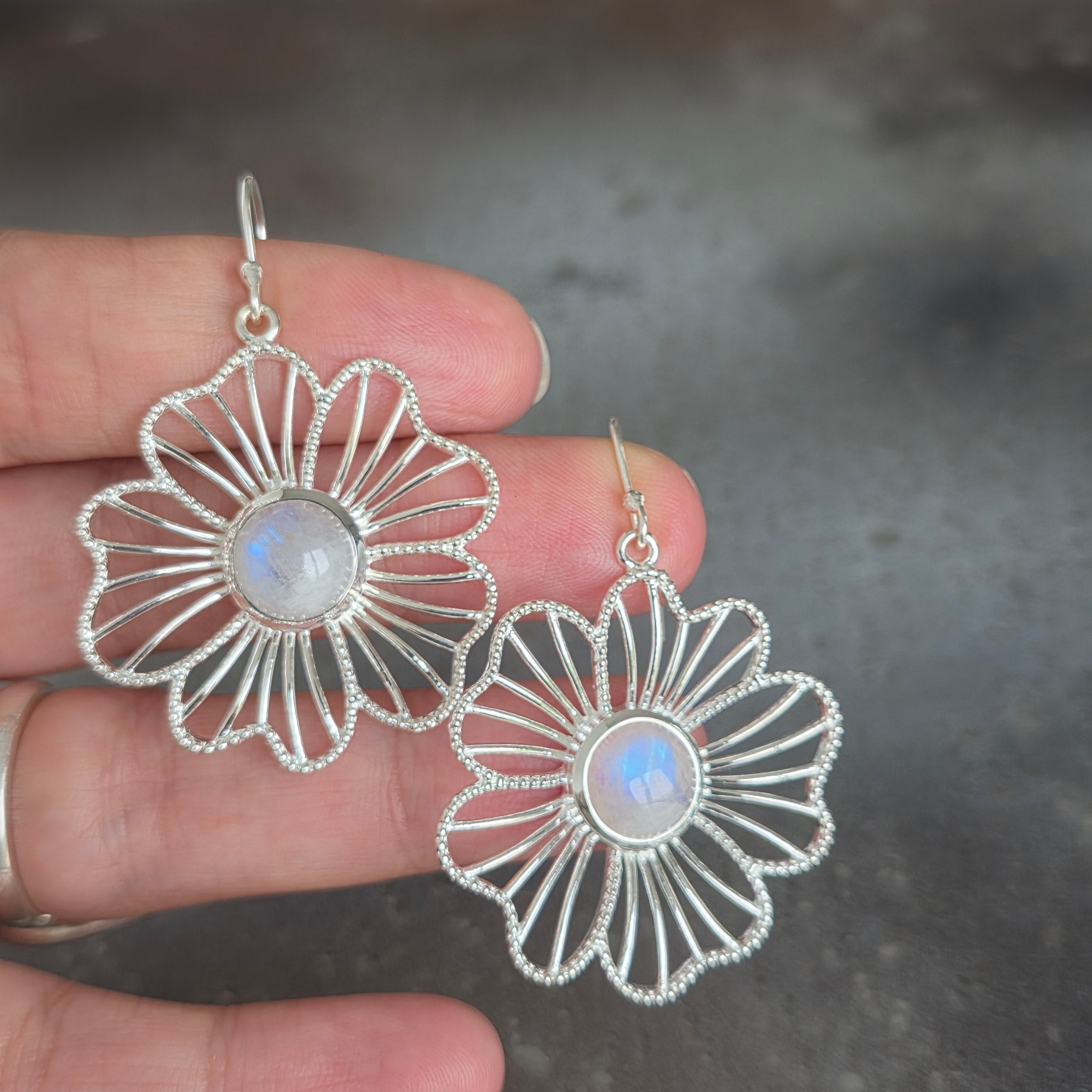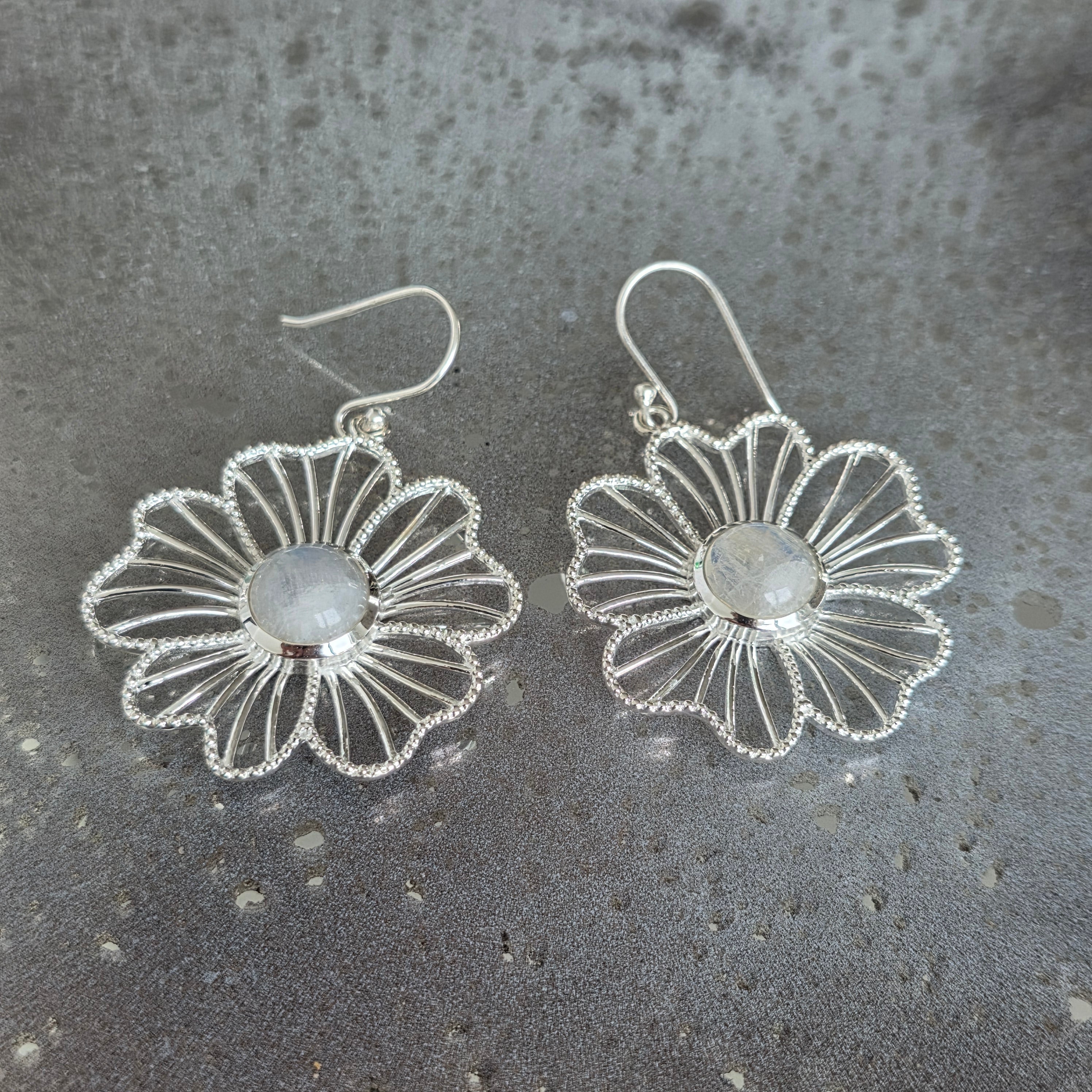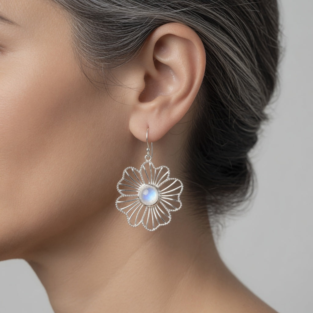 Náušnice „Flower“ zvýrazňujú jemnosť prírodných tvarov prostredníctvom rozšíreného a elegantného kvetinového dizajnu. V strede každej kvetiny sa nachádza mesačný kameň, s jemnými odleskami, ktoré sa zdajú tancovať v svetle.