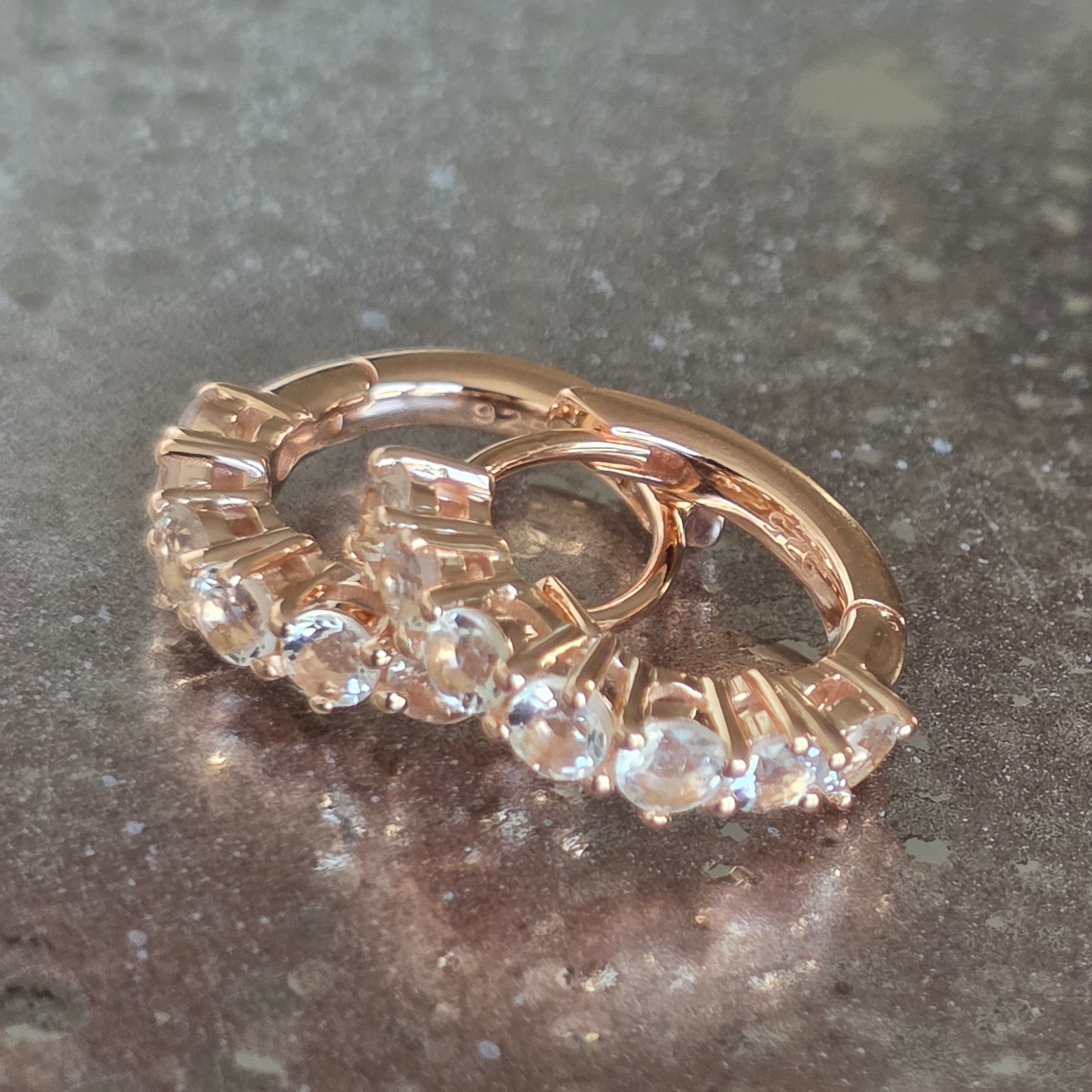 Tvar hoop poskytuje rovnováhu a univerzálnosť, zatiaľ čo jemný lesk kameňov pridáva nenápadný akcent, vhodný ako na denné outfity, tak aj na zvláštne príležitosti.