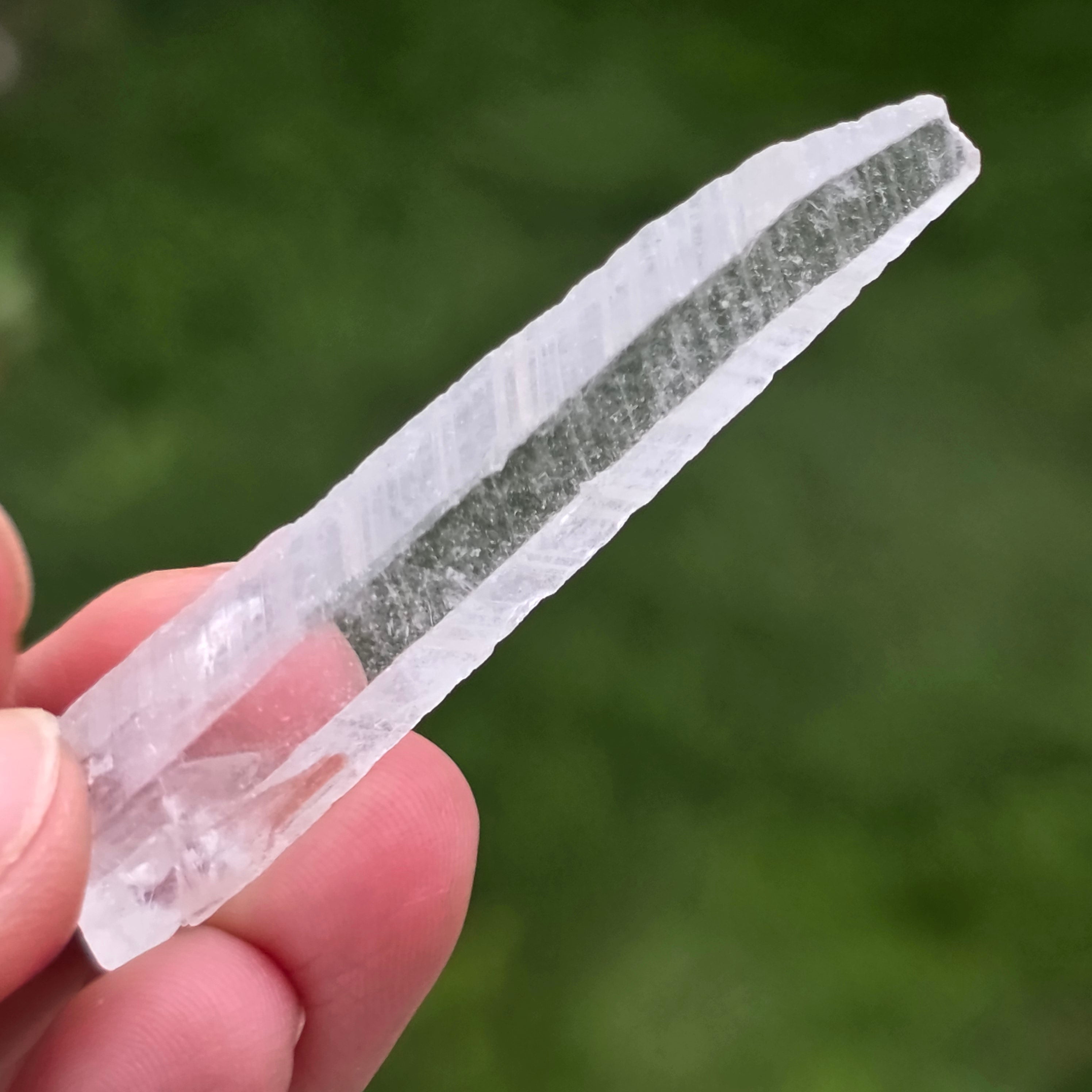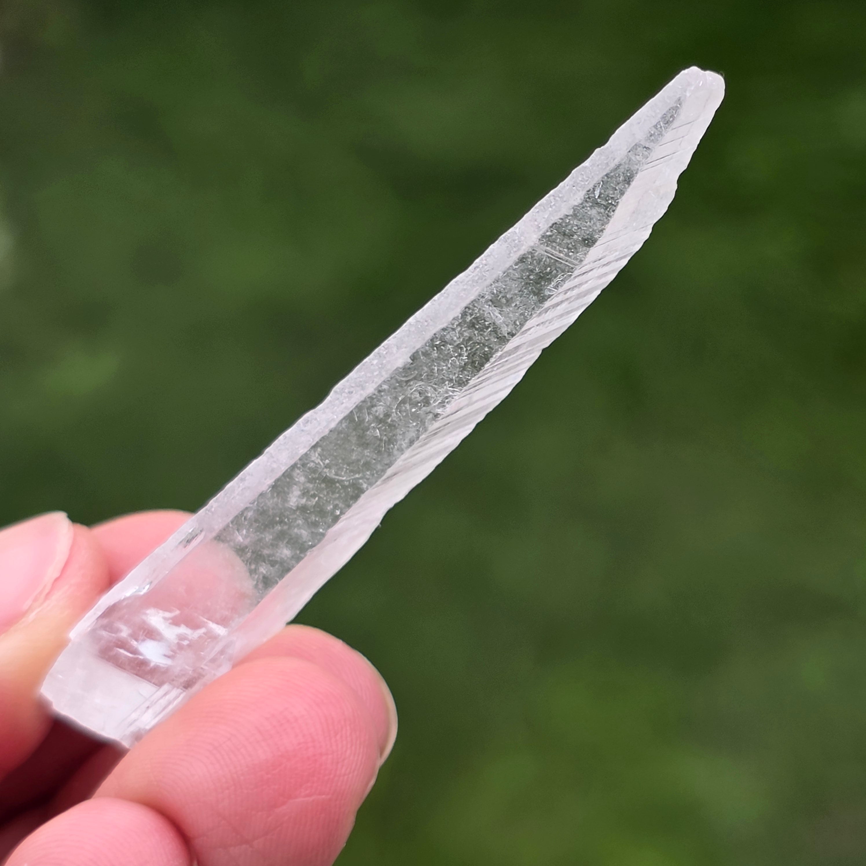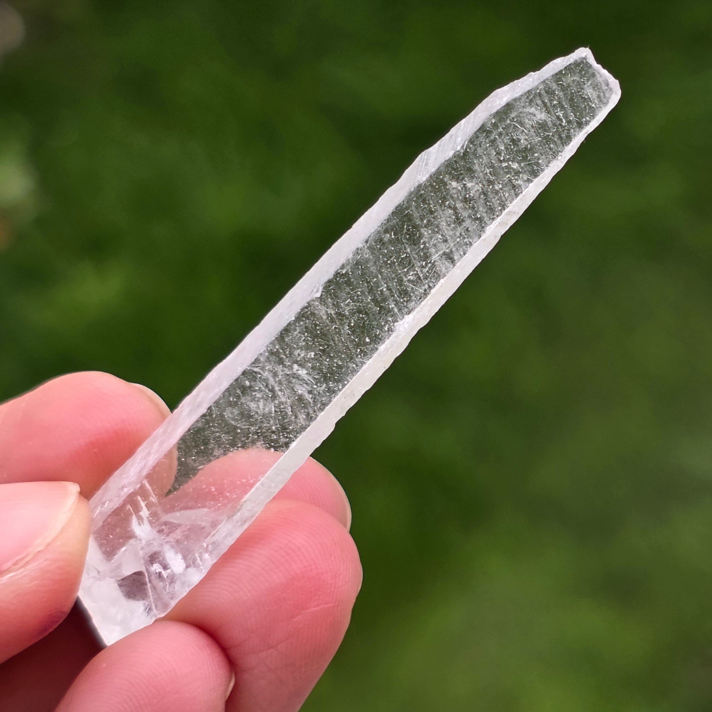 Kryštály sa vyskytujú v tenkej prizmickej forme s jasnými zakončeniami, s vysokou priehľadnosťou a diskrétnym, takmer skleným leskom. Ich pretiahnutý tvar a spôsob rastu dávajú každému kusu vzdušný, vizuálne krehký charakter, ale dobre definovaný mineralogicky. Čistý a jednotný vzhľad robí tieto kusy veľmi cenenými vo výstavných vitrínach.
