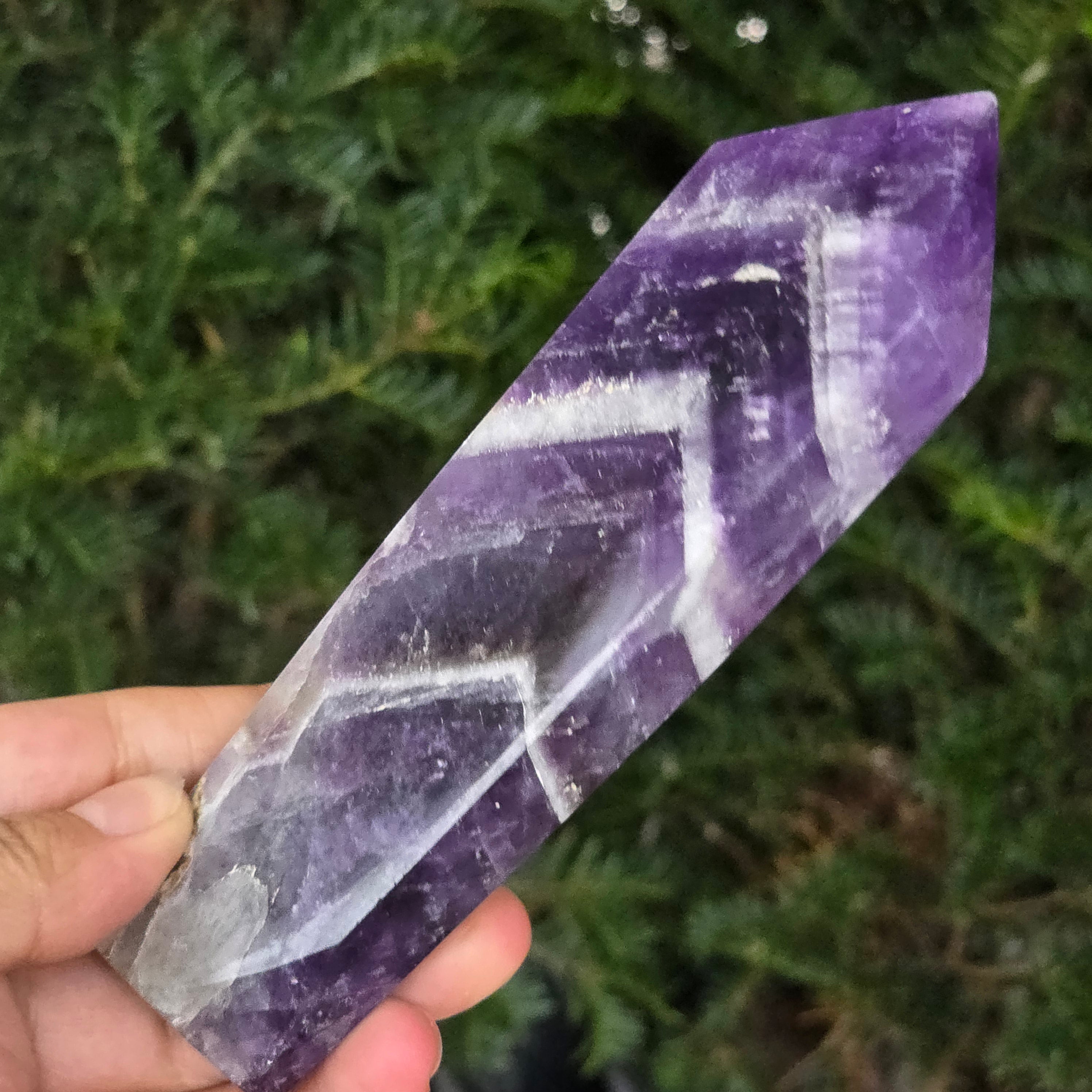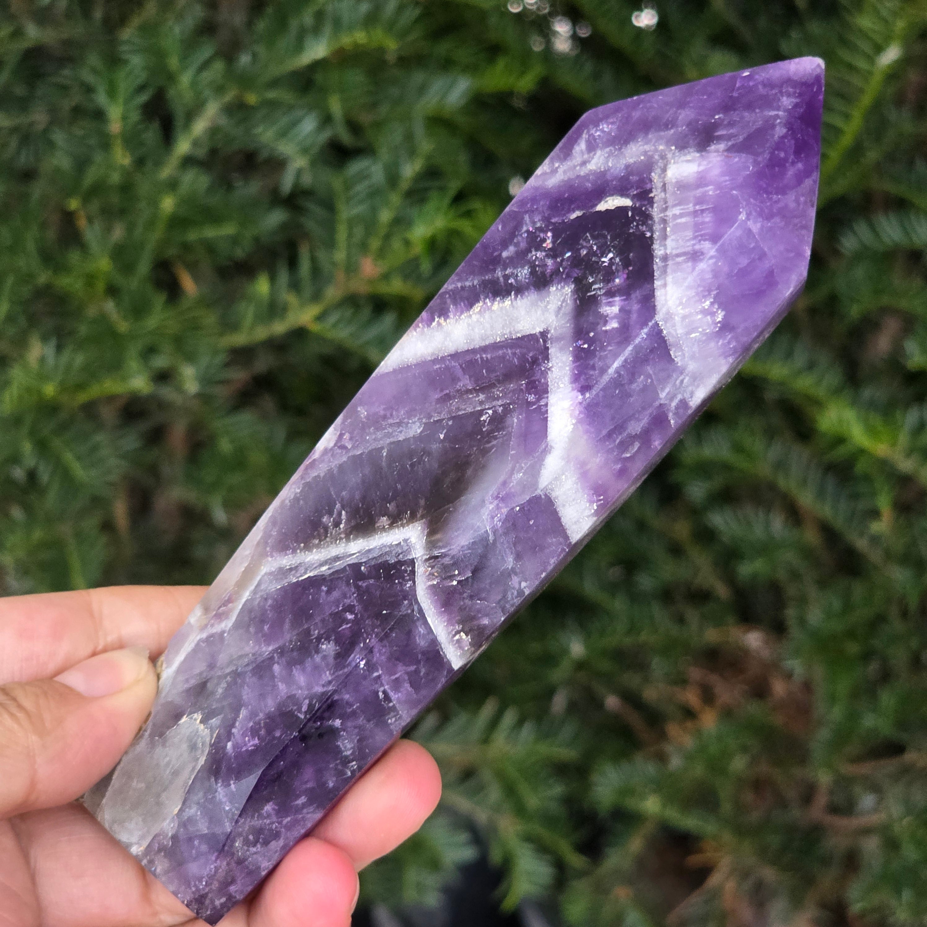 Vyberte si obelisk z ametystu chevron a nechajte ho priniesť do vášho priestoru čistiacu energiu, harmóniu a nádych mystickej elegancie — symbol jasnosti a duchovnej ochrany.