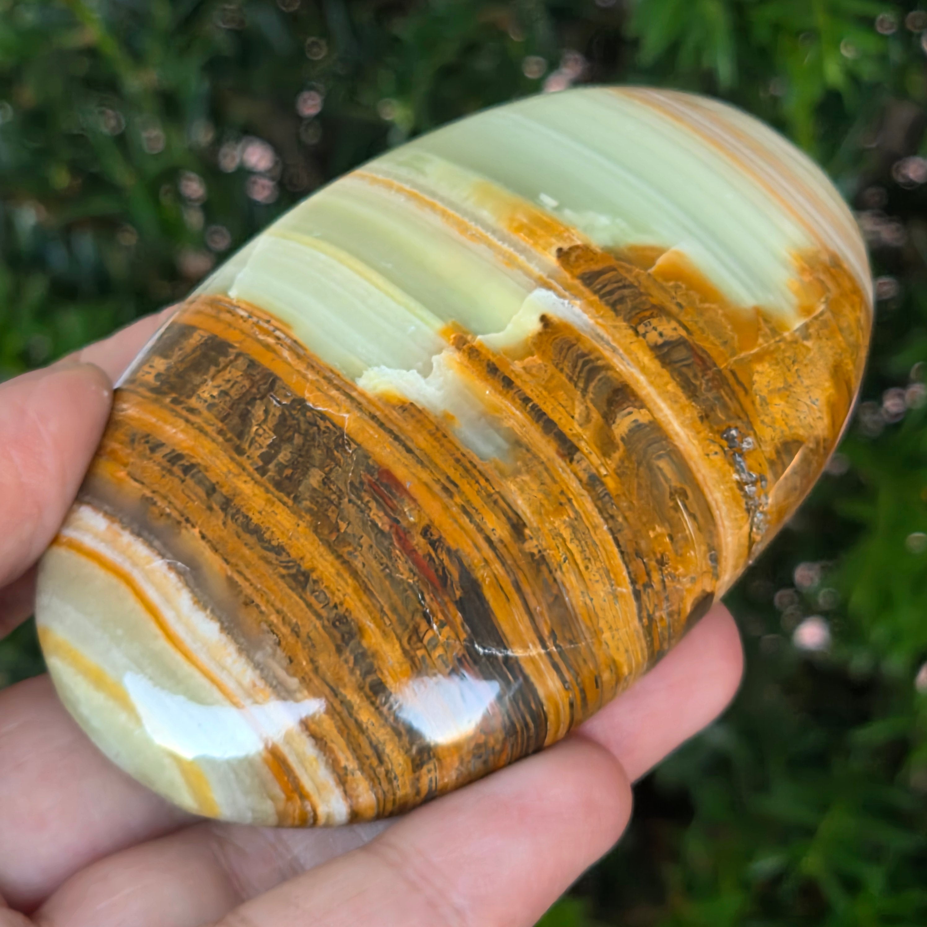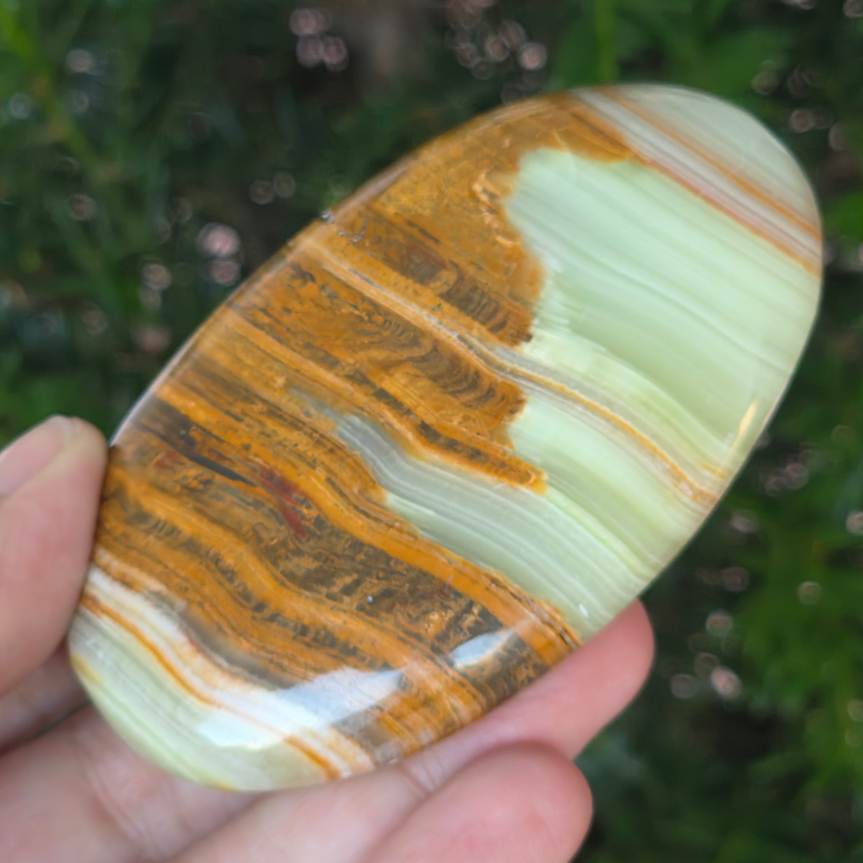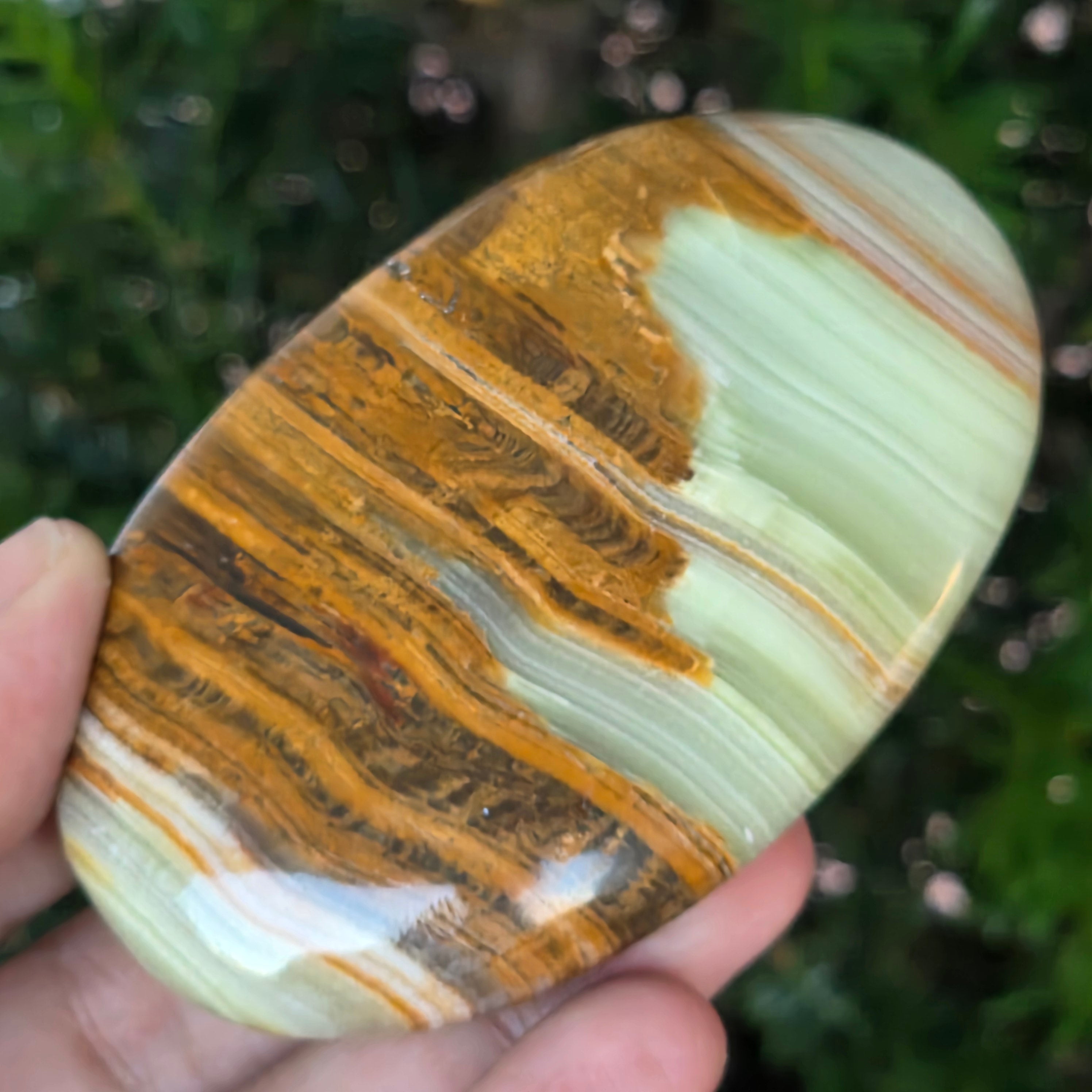 Držaný medzi dlaňami, tento palmstone z prírodného zeleného onyxu sa stáva spojencom rovnováhy, tichým pripomenutím harmónie medzi telom a duchom. Je ideálny na meditáciu, relaxáciu alebo jednoducho ako dekoratívny predmet s jemnou a rafinovanou energiou.