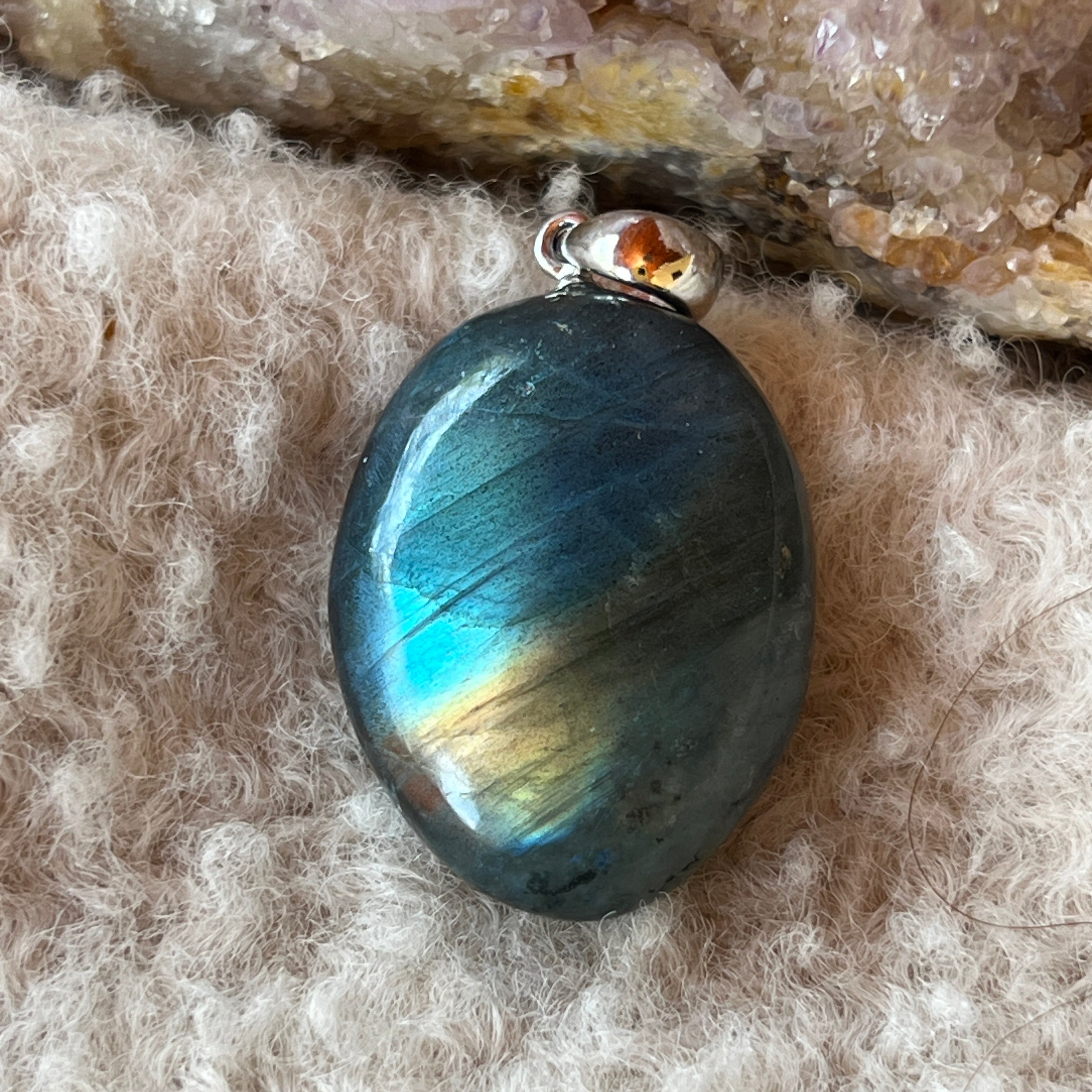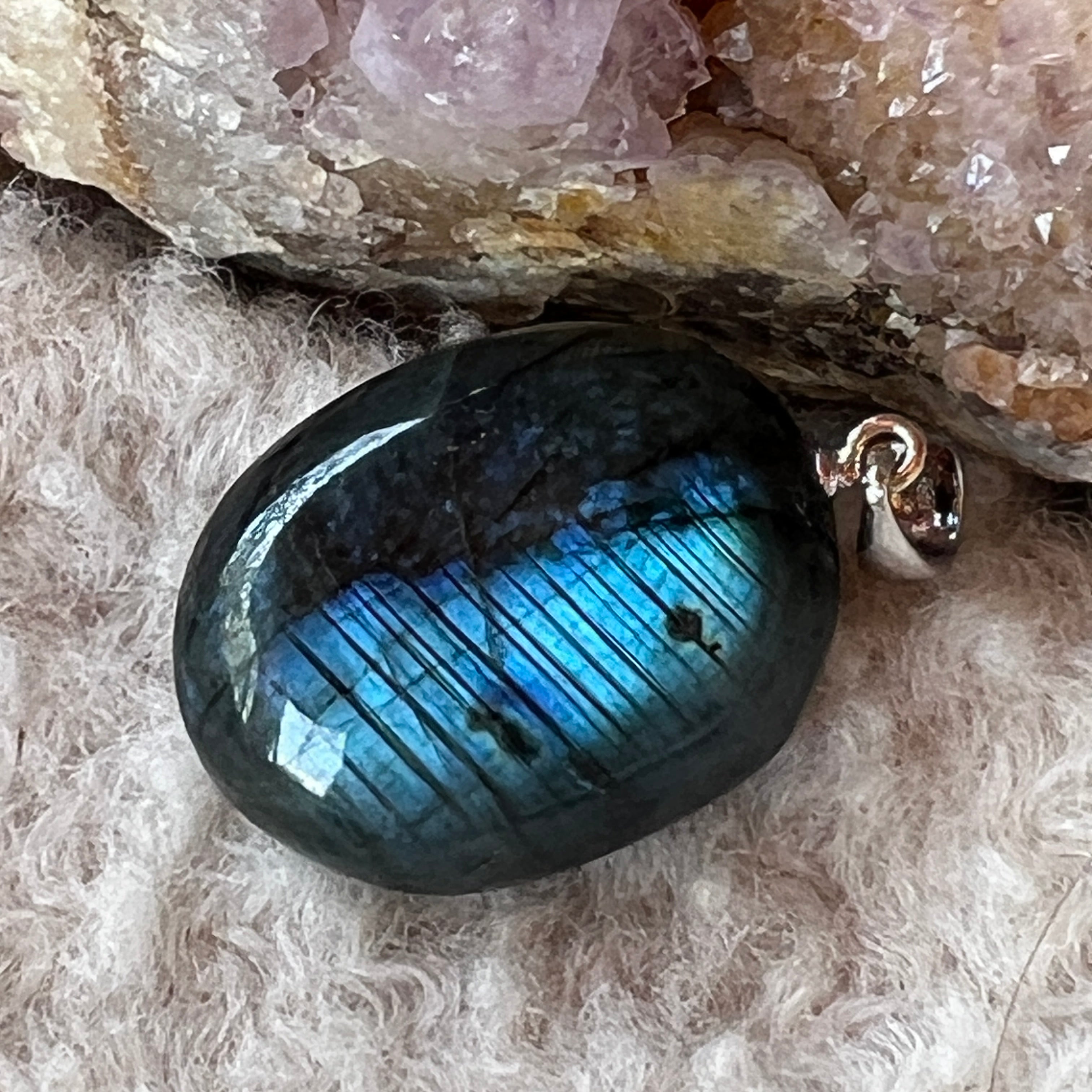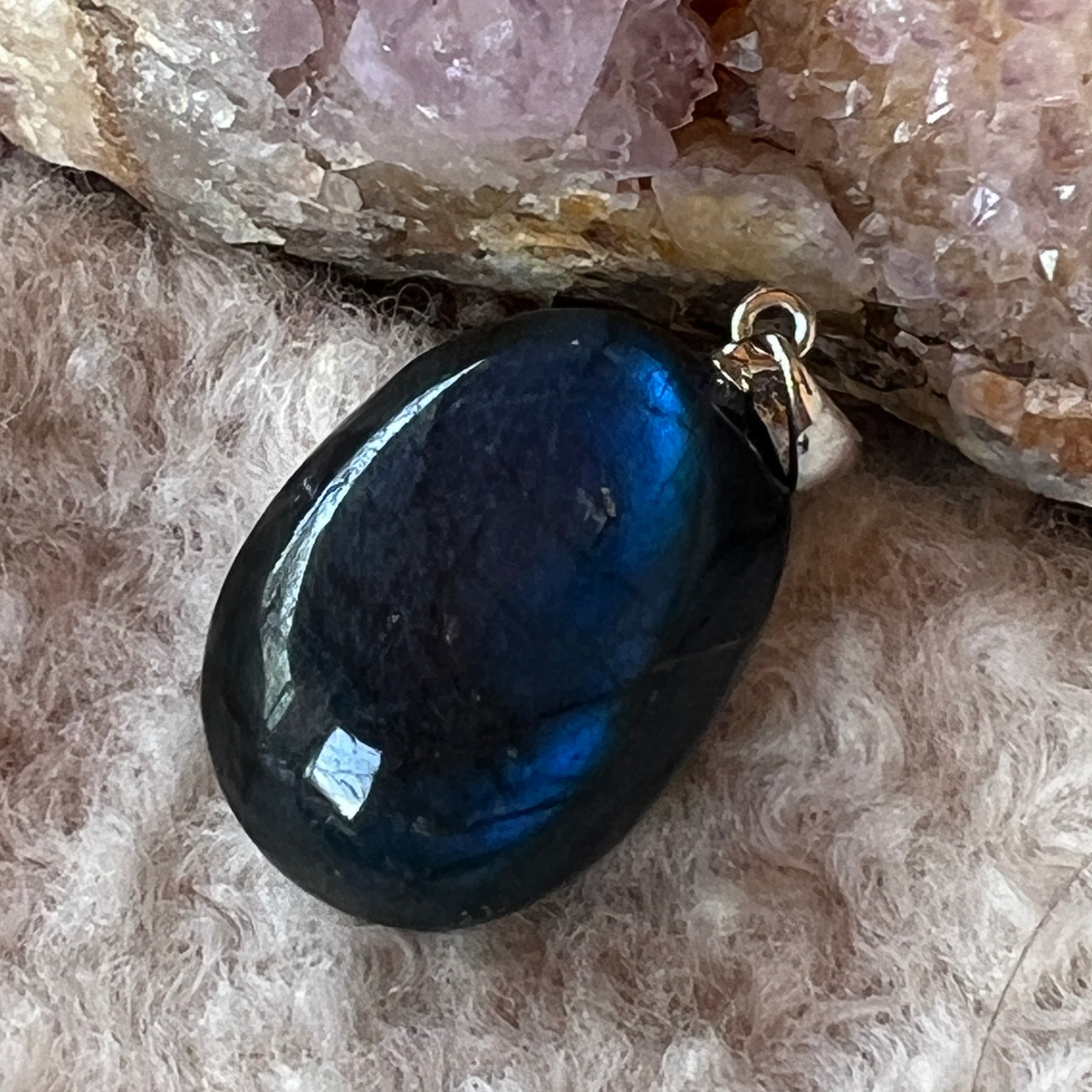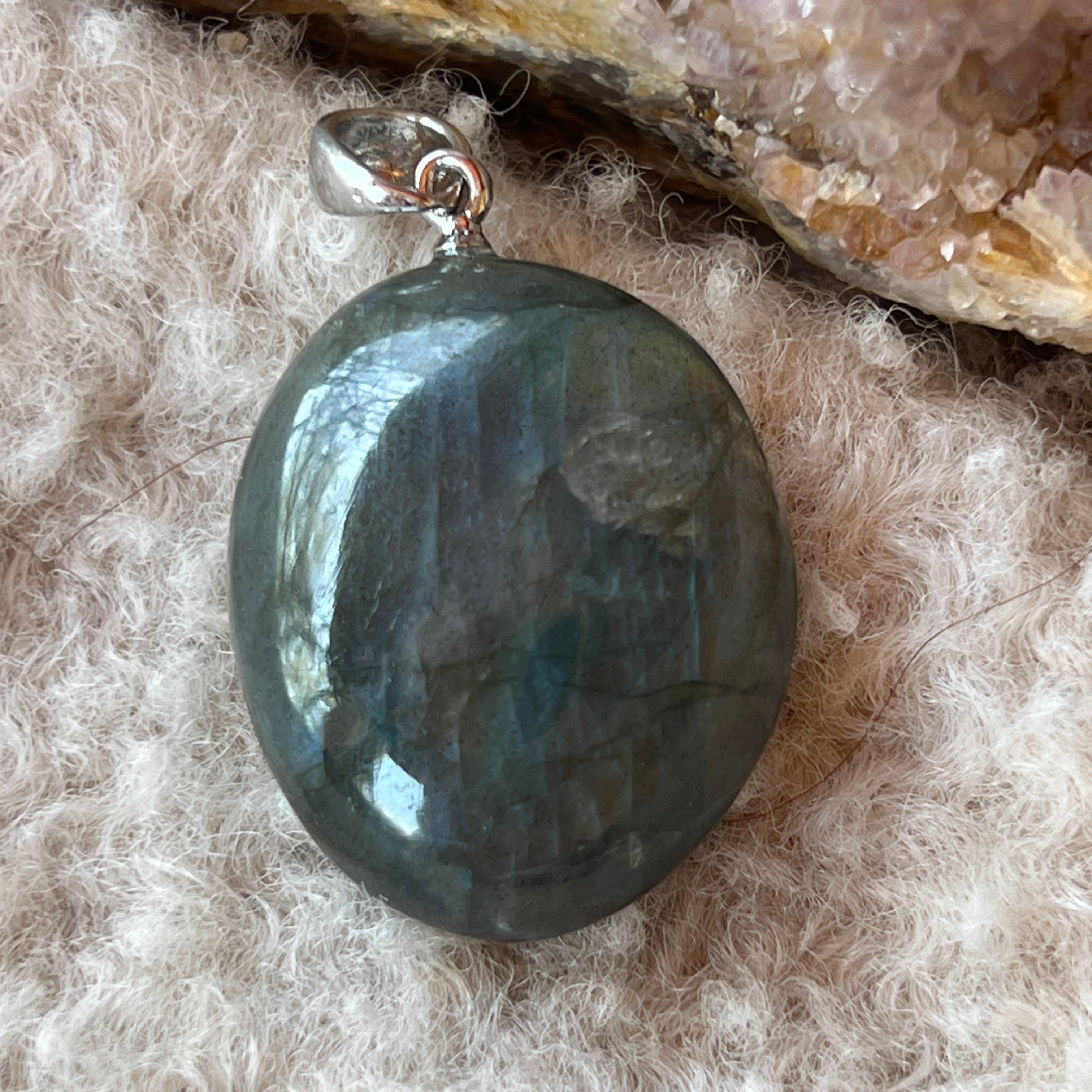 Vyberte si oválny prívesok z labradoritu, aby ste so sebou vždy nosili mágiu jeho irizácií a transformačnú energiu tohto tajomného kameňa ✨🌌.