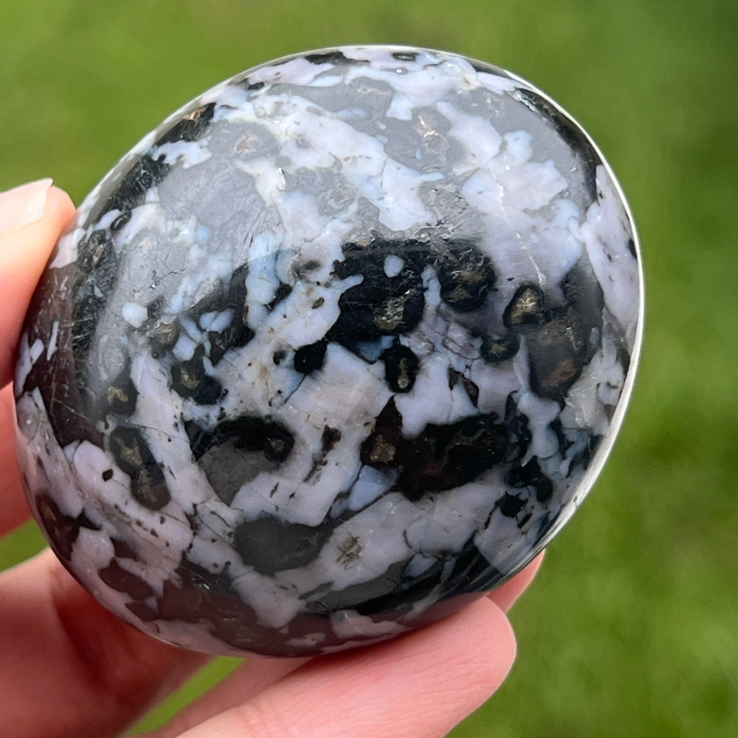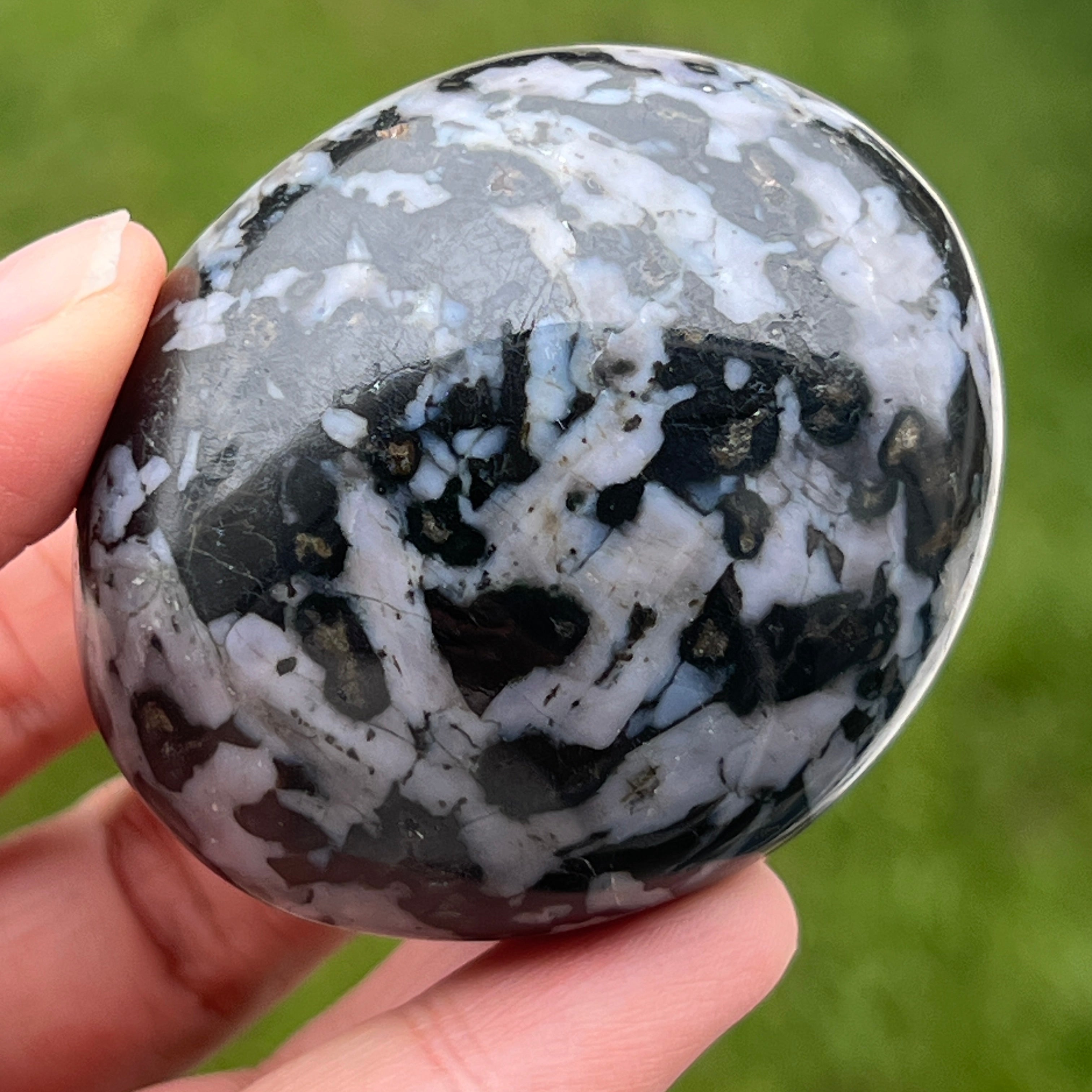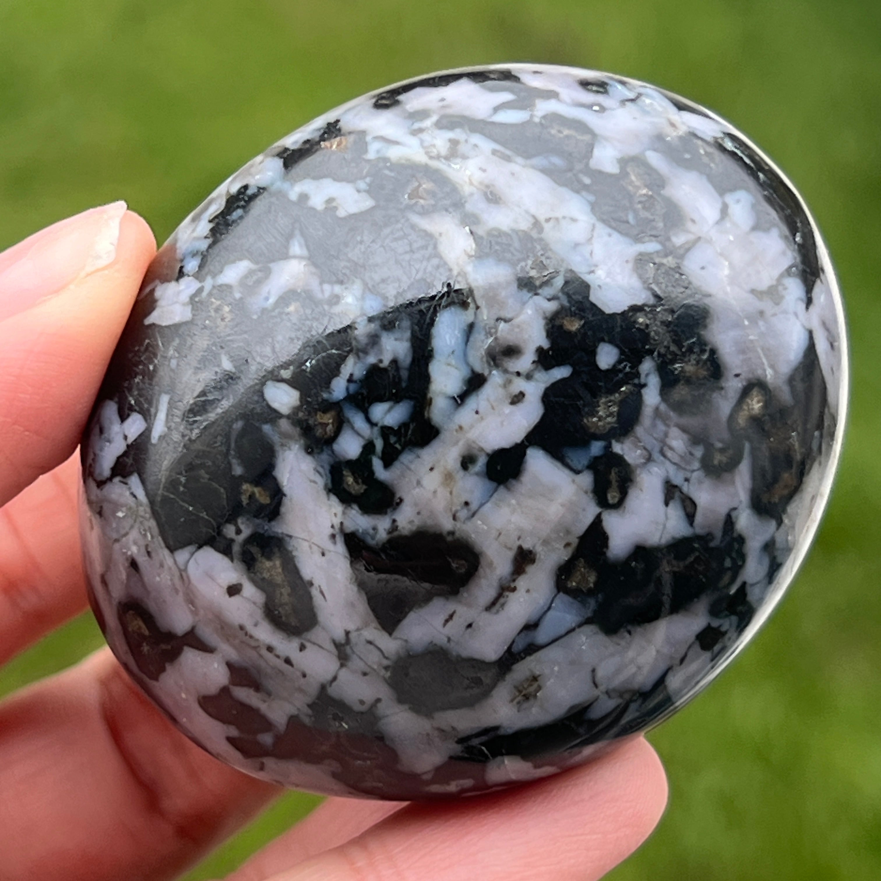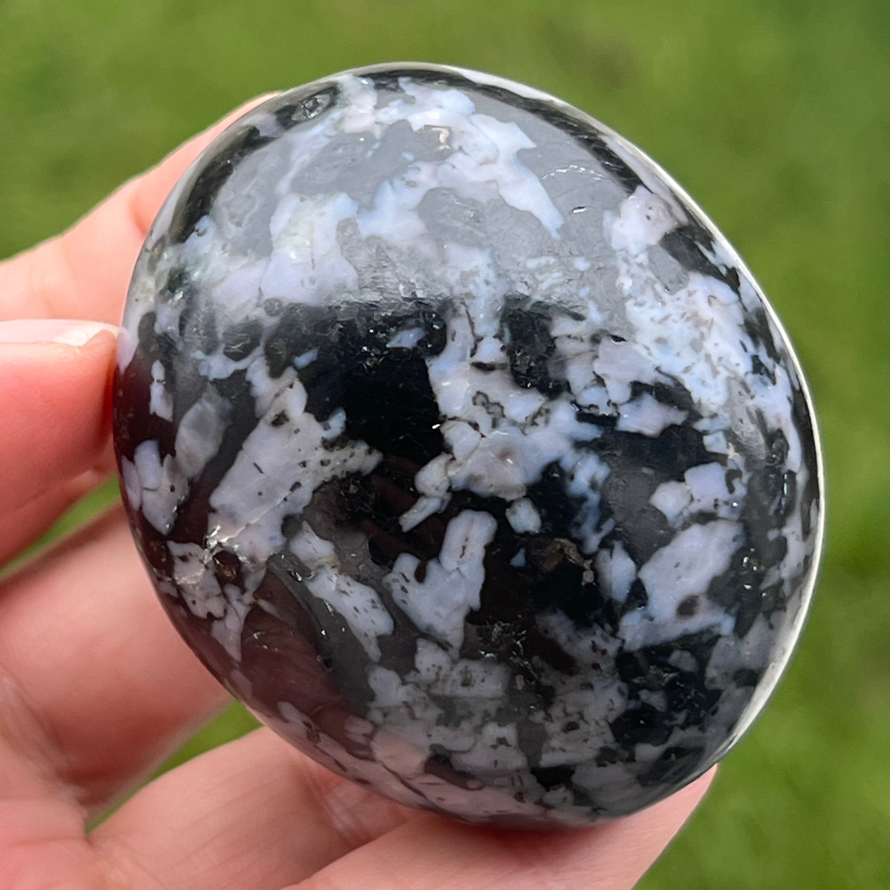 Merlinit je zriedkavý a fascinujúci polodrahokam, známy kombináciou kontrastných farieb, bielej a čiernej, ktorá mu dáva jedinečný vzhľad. Považuje sa za odrodu dendrekového opálu alebo za kombináciu kremeňa a iných minerálov, a jeho zložitá štruktúra ho robí ceneným nielen pre svoju krásu, ale aj pre predpokladané energetické vlastnosti. Merlinit je v oblasti kryštáloterapie známy svojimi mystickými energiami a spojením s intuíciou, jasnovidectvom a duchovným poznaním.