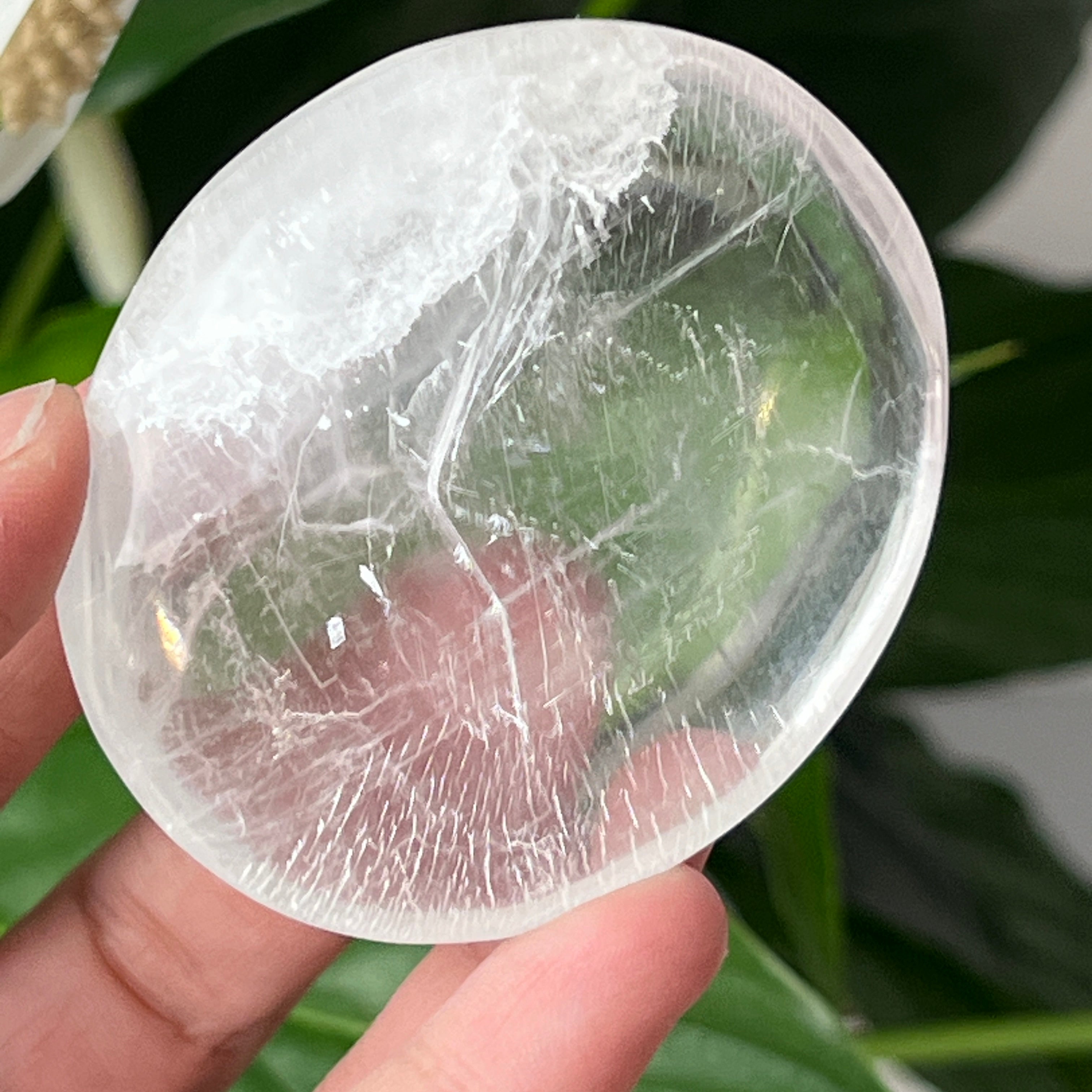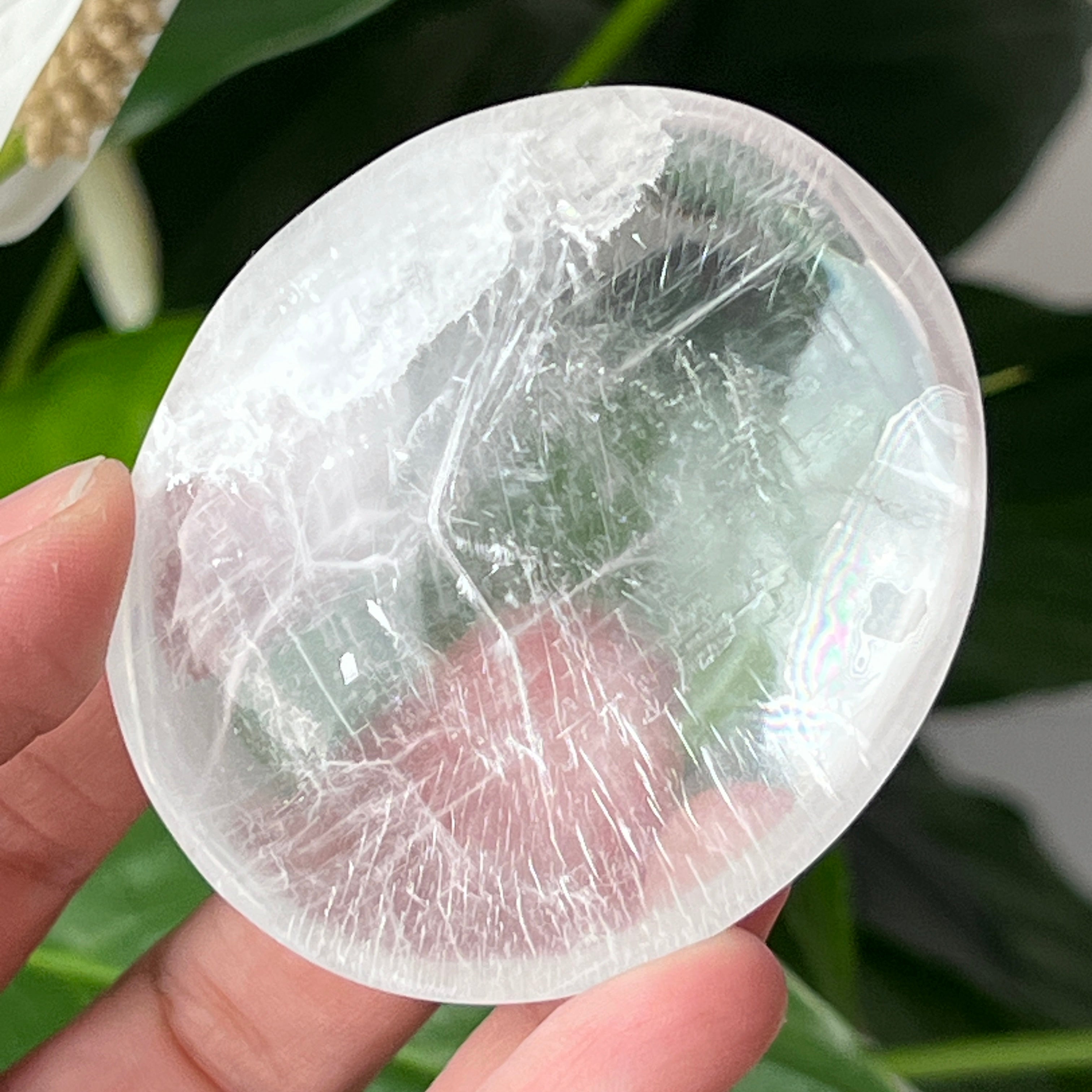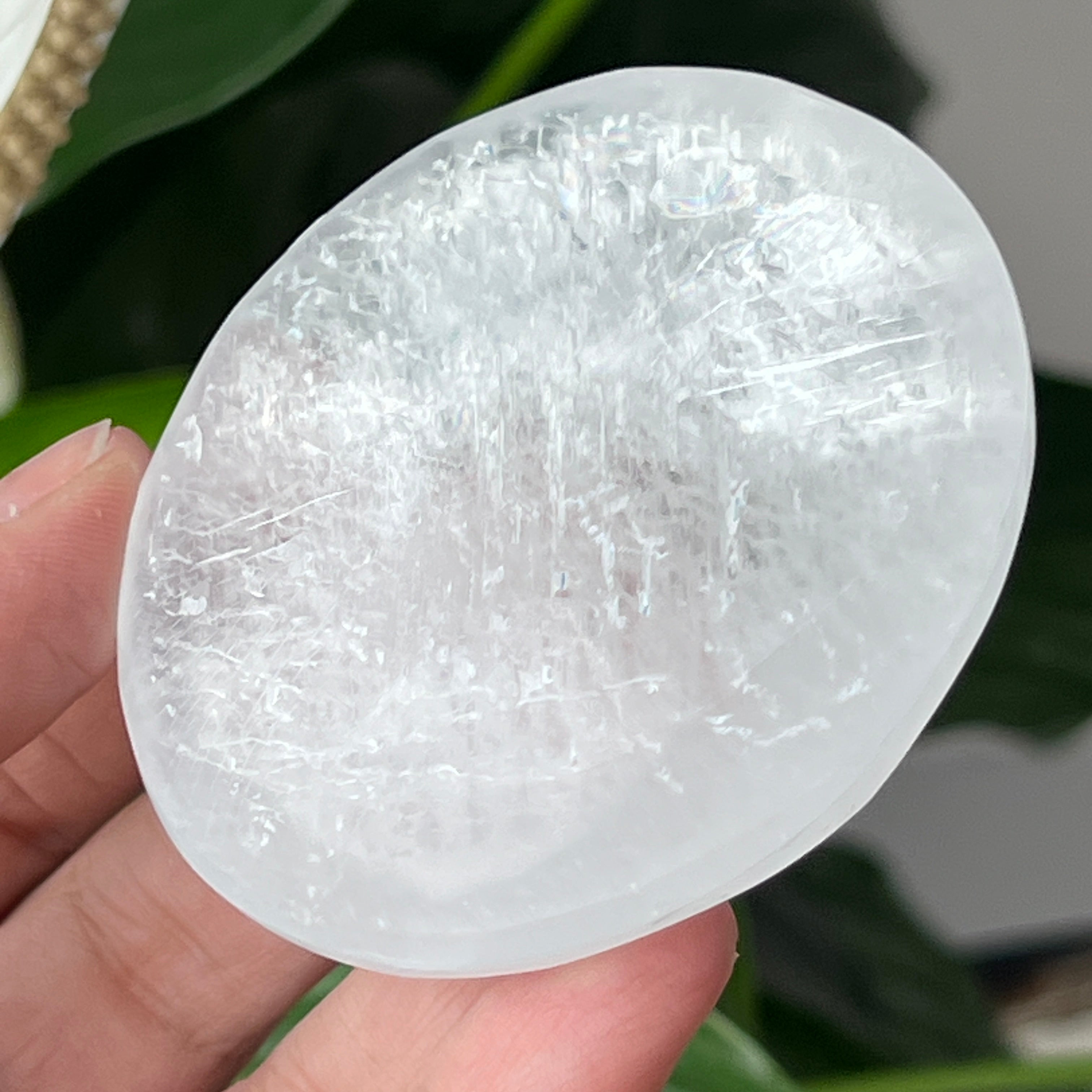 Tento oválny selenit s lesklým povrchom pochádza z Maroka a zaujme svojou priehľadnou textúrou a jemným leskom. Oválny tvar, známy aj ako „soap“ alebo palmstone, je ideálny na držanie v dlani počas meditácie alebo relaxačných rituálov.