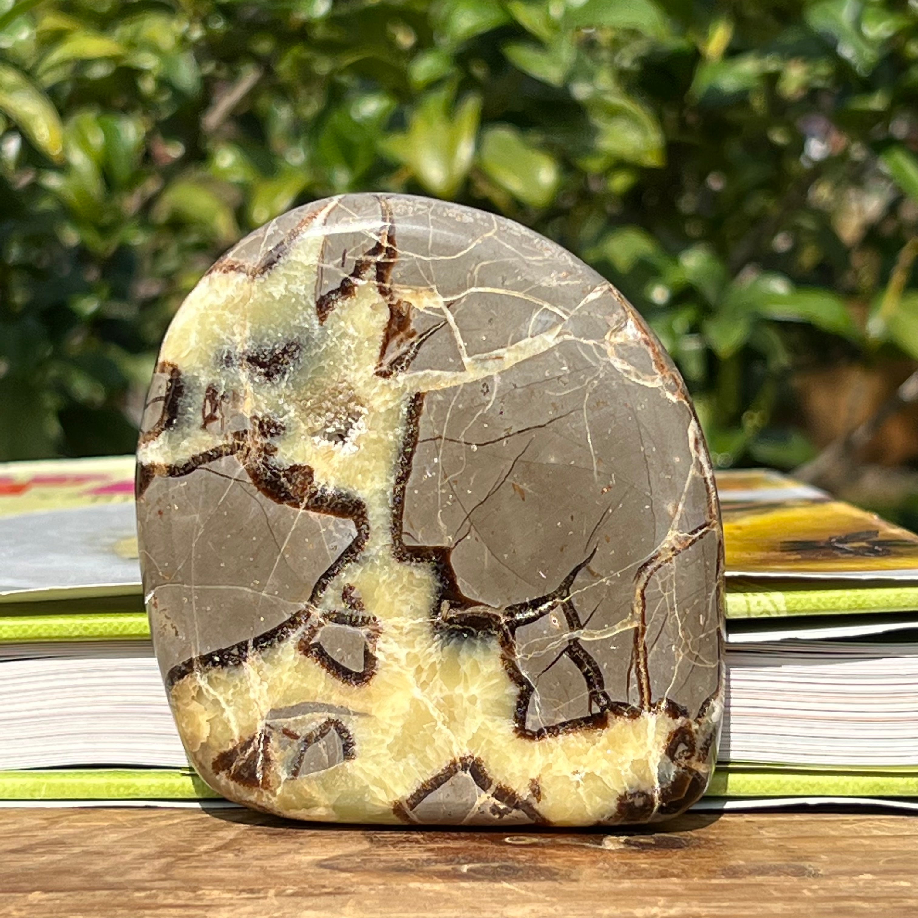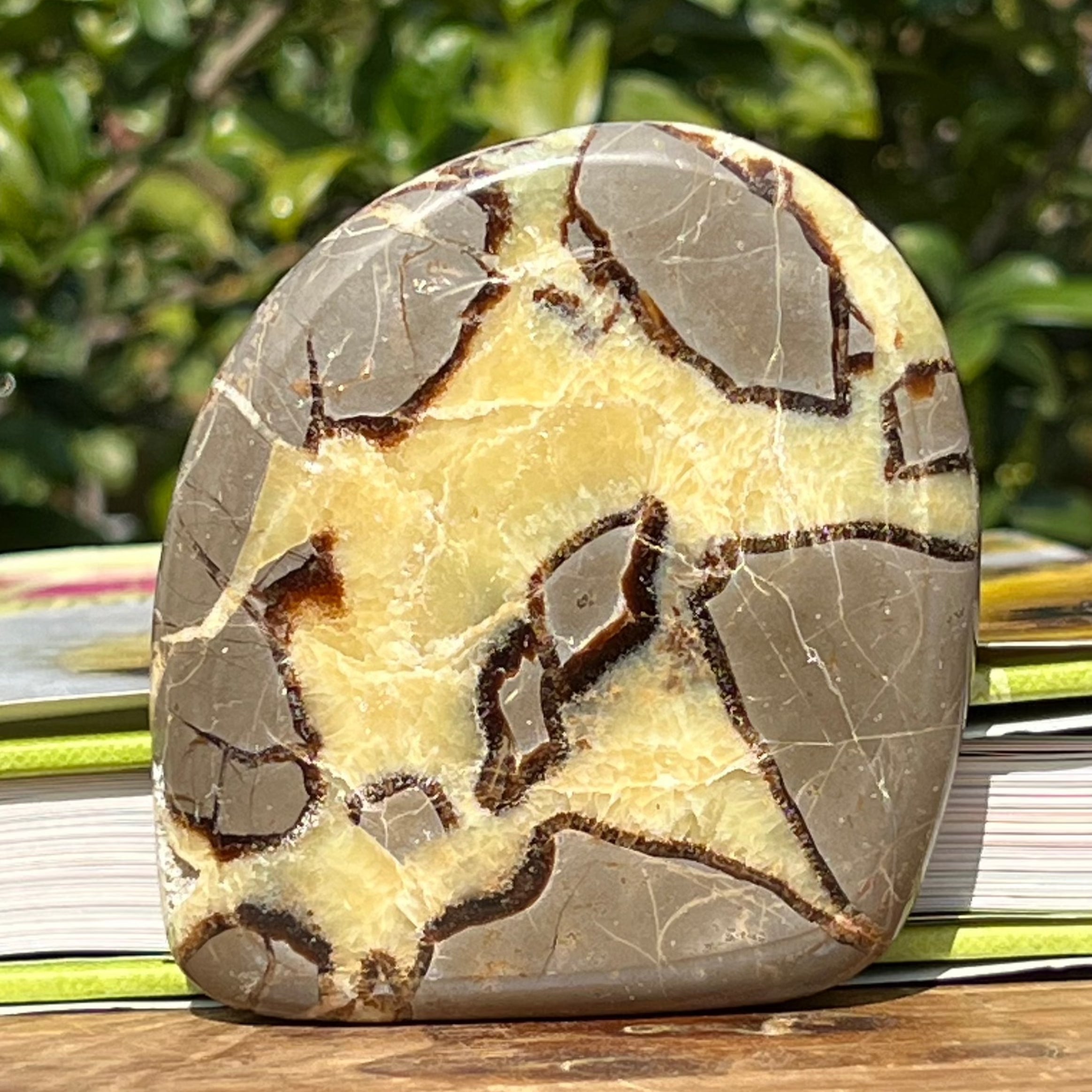 Septaria je vyrobená z kalcitu, limonitu, sadry a barytu, minerálov, ktoré tvoria jedinečnú hru v tomto kameni a dodávajú mu zvláštny vzhľad.