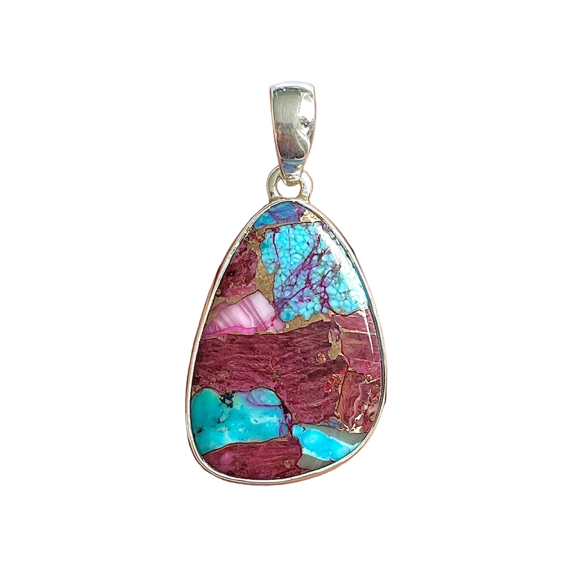 Tento jedinečný prívesok spája dva poklady prírody – Ustrica ostnatá a Ten tyrkysový – v ohromujúcej farebnej mozaike. Fialové, ružové a oranžové odtiene mušle sa prelínajú s hlbokou modrou tyrkysovou farbou, vytvárajúc živý drahokam pripomínajúci stretnutie mora a západu slnka.