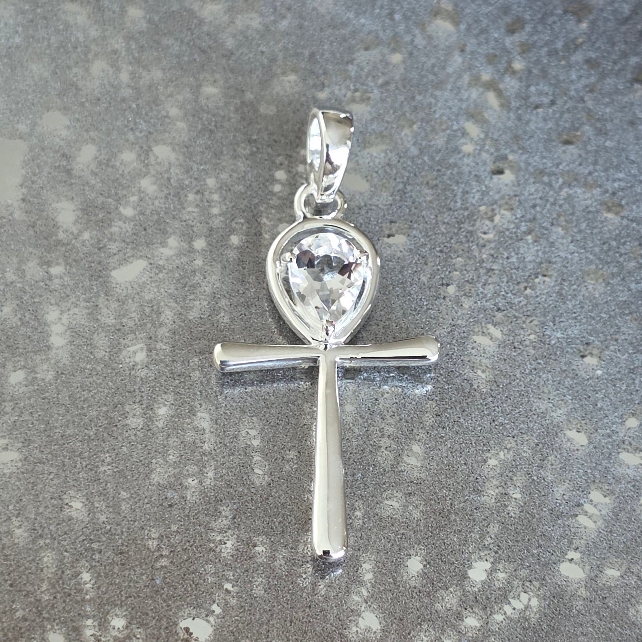 Prívesok s hlbokým symbolom, v ktorom je tvar „Kľúča života“ (Ankh) doplnený čistou priehľadnosťou číreho kremeňa. Kameň, elegantne vyrezaný do tvaru hrušky, pridáva kompozícii jemný a vyvážený akcent.