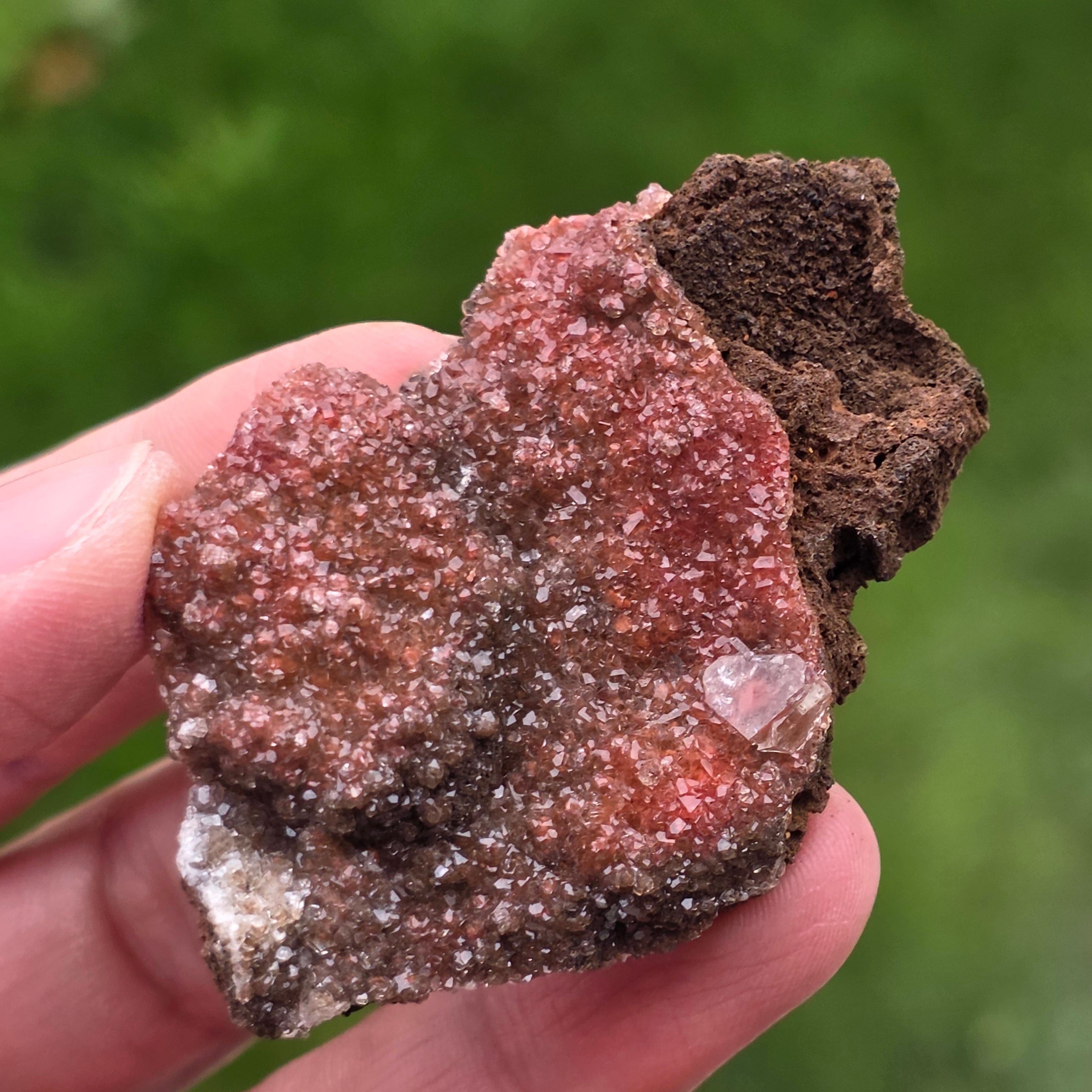 Kryštály kalcitu vykazujú špecifický habit nazývaný „diamantový kalcit“, charakterizovaný dobře definovanými koncami a lesklými plochami, ktoré subtilne, no výrazne odrážajú svetlo. Kompaktné usporiadanie kryštálov vytvára trblietavý povrch s bohatou textúrou, pričom každý kus je odlišný čo do tvaru, intenzity farby a rozloženia kryštálov.