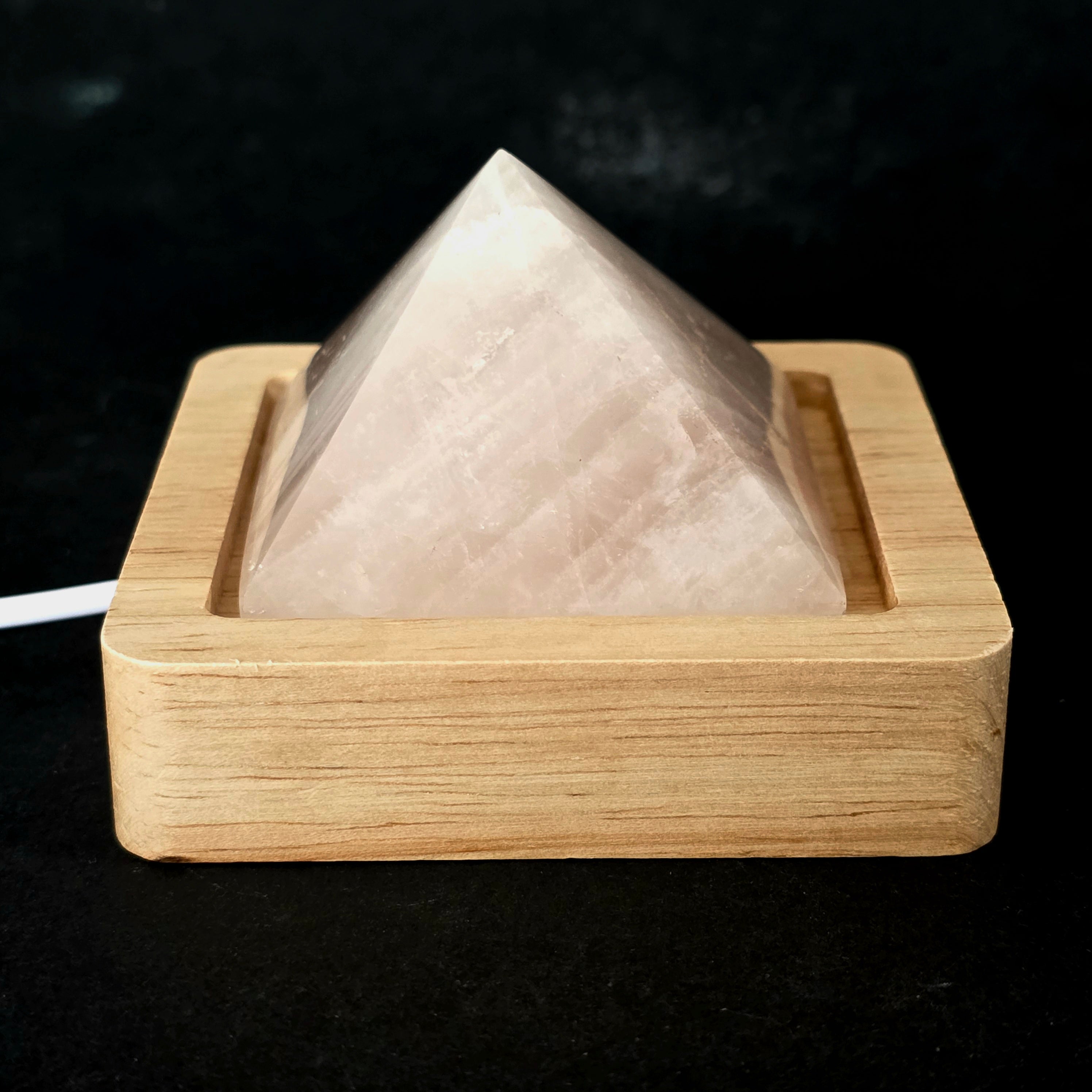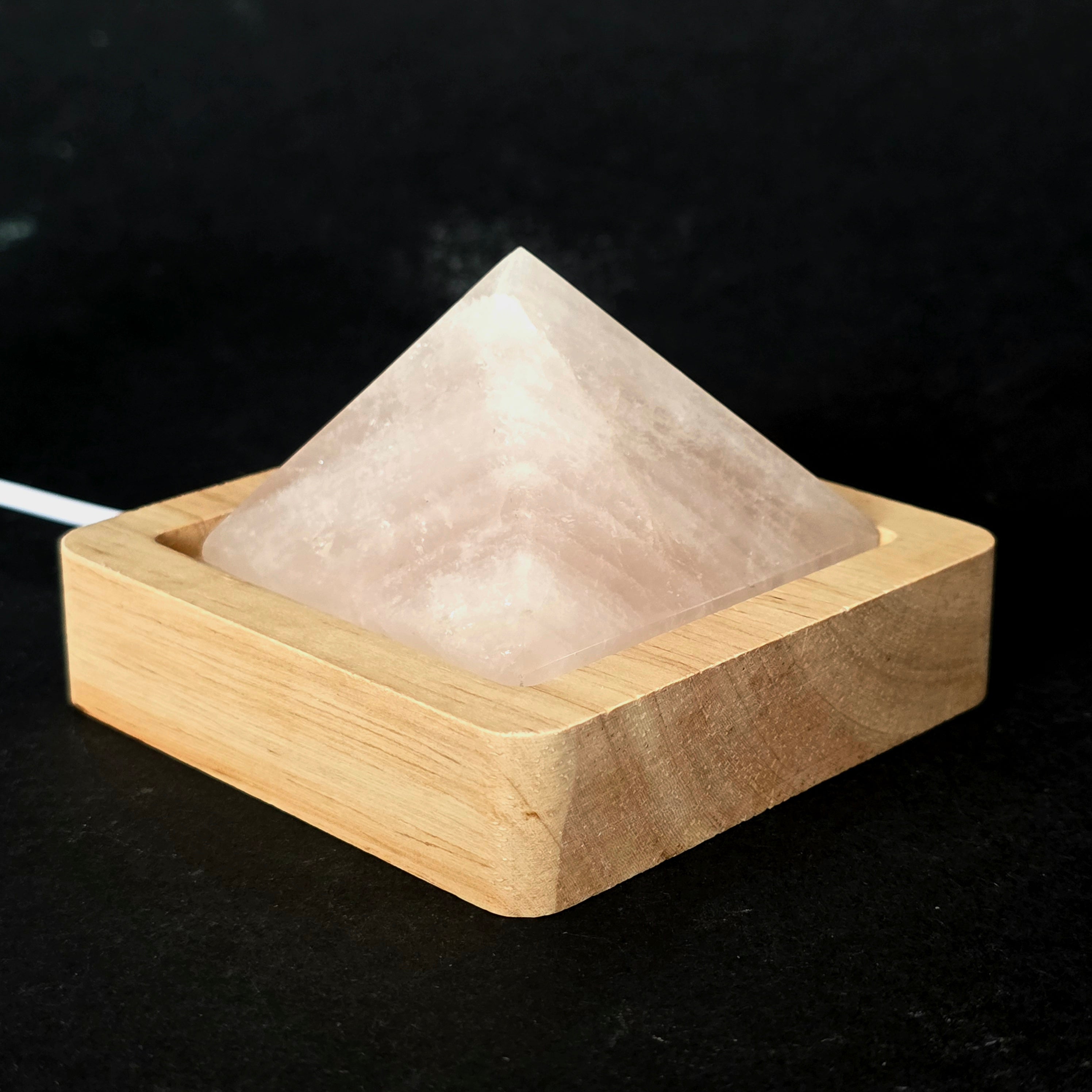 Materiály: prirodzená pyramída z ružového kremeňa, drevená základňa dekoračnej lampy, osvetľovací systém s USB napájaním.