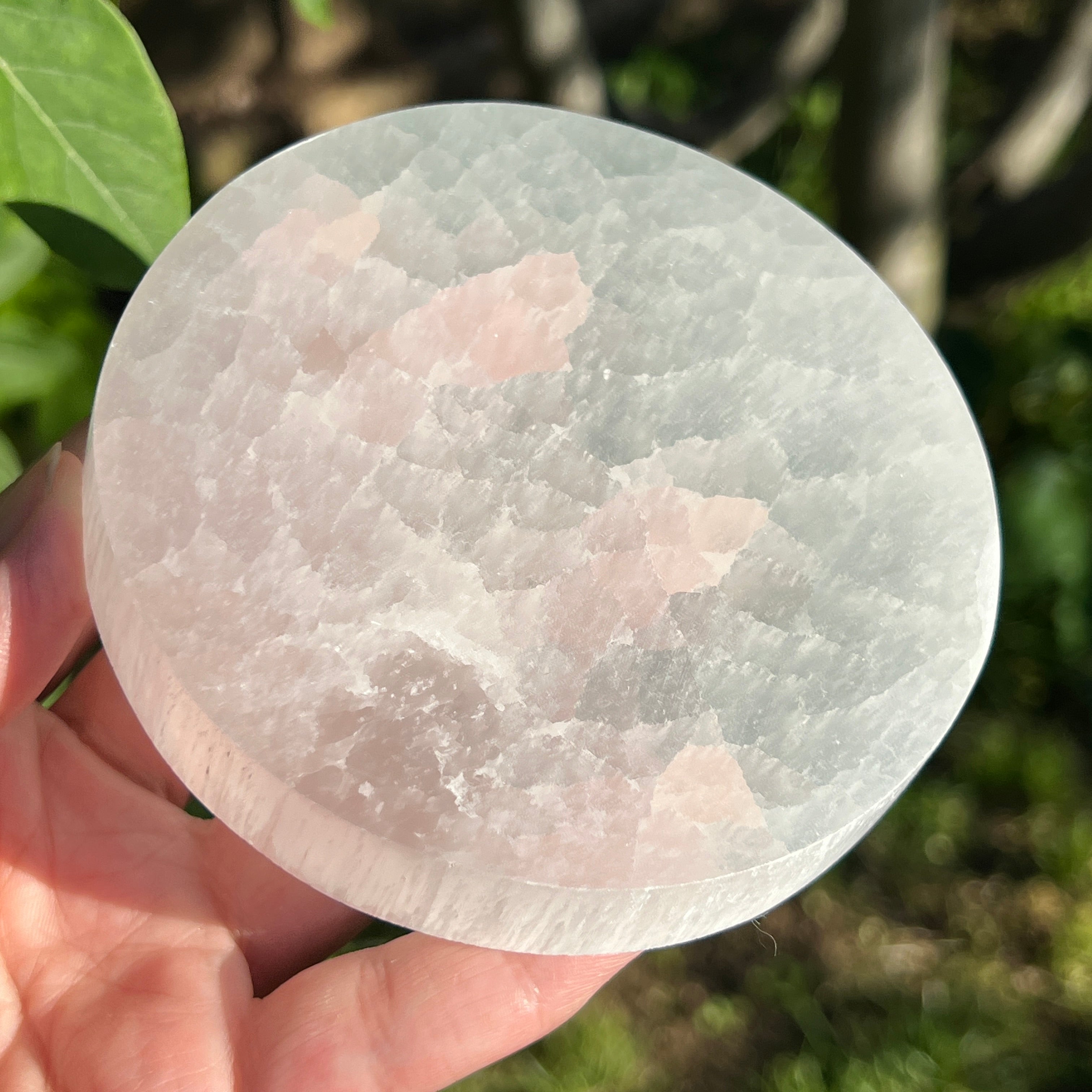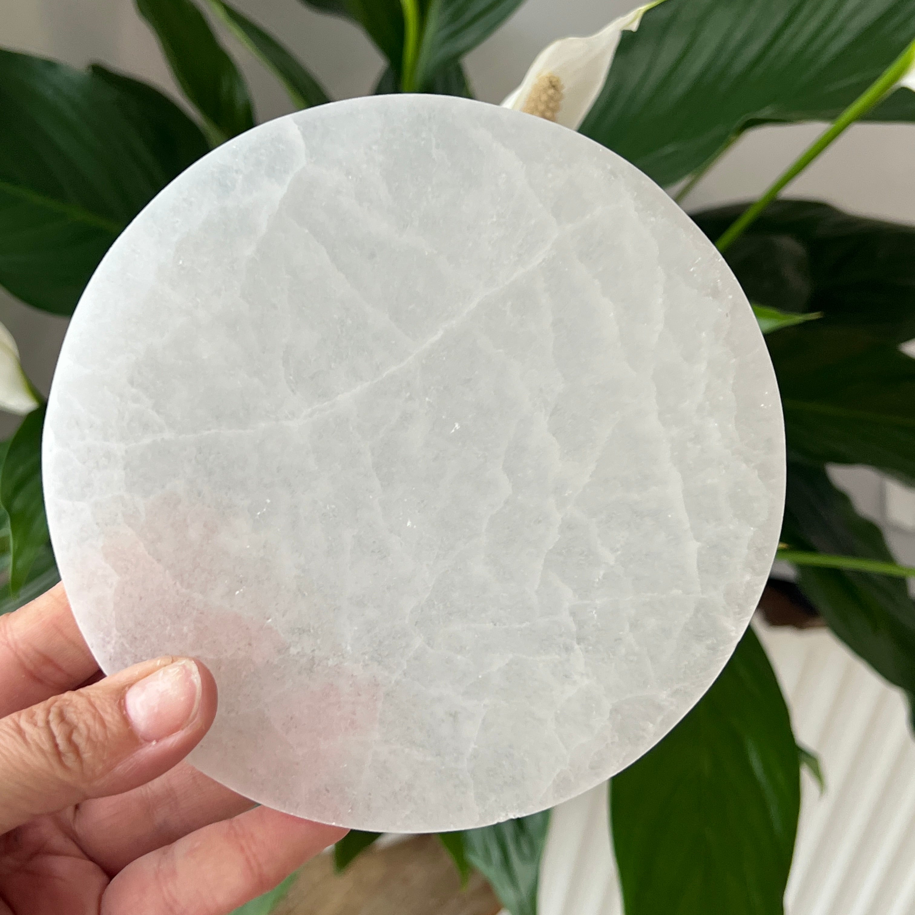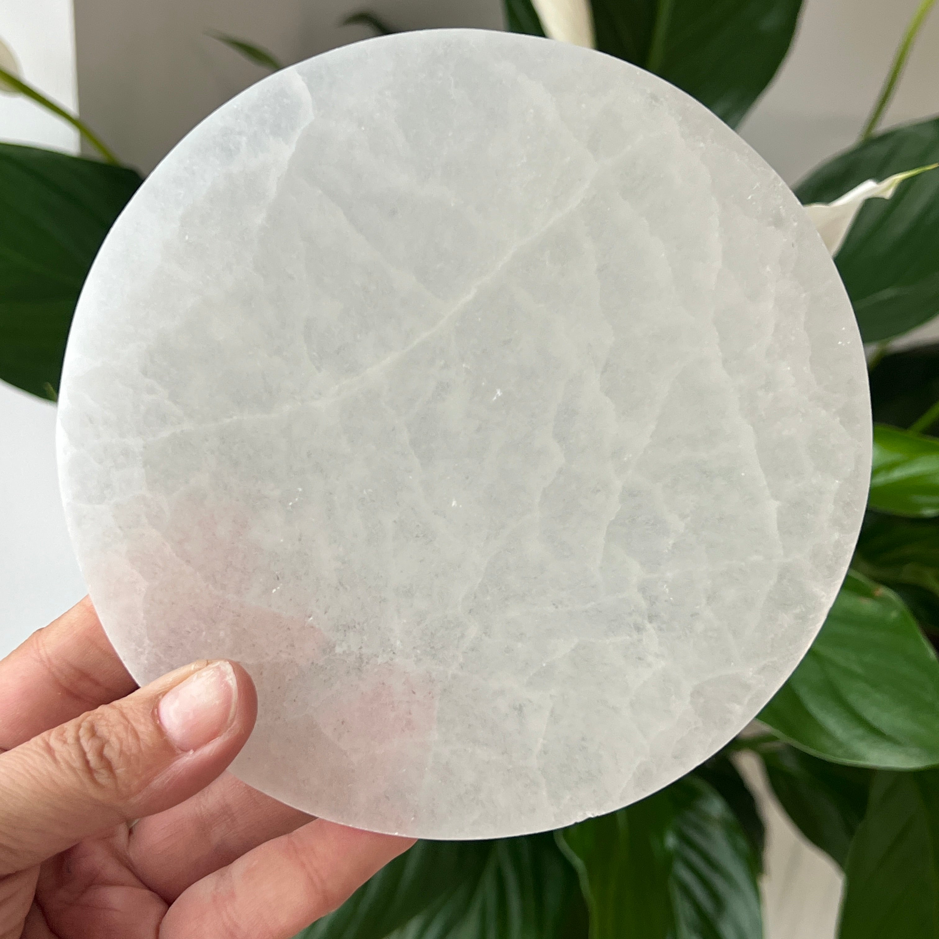 Tento marocký selenitový disk je kúskom anjelskej čistoty — mliečne biela zrkadlová plocha, ktorá odráža svetlo mesiaca v každom vlákne.
