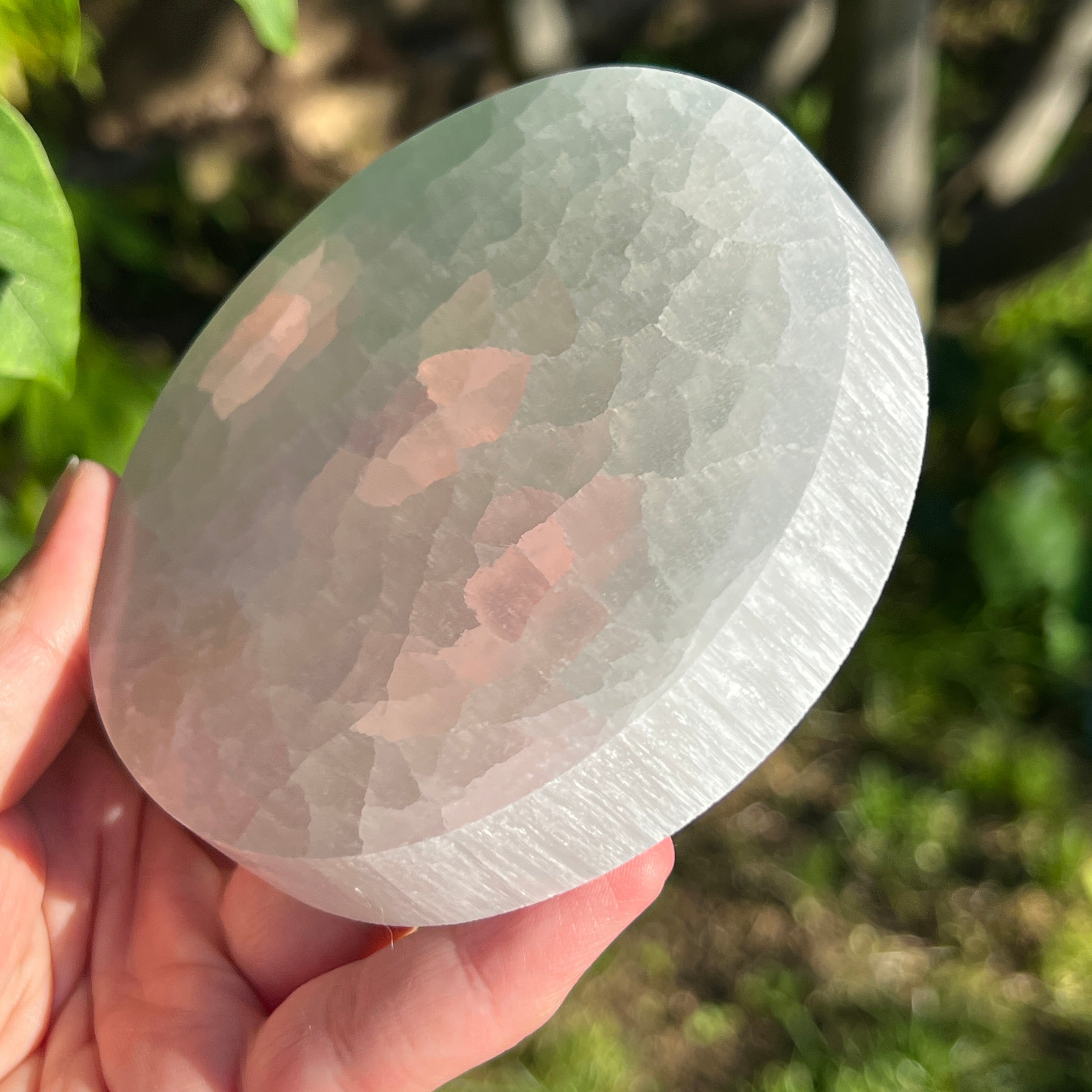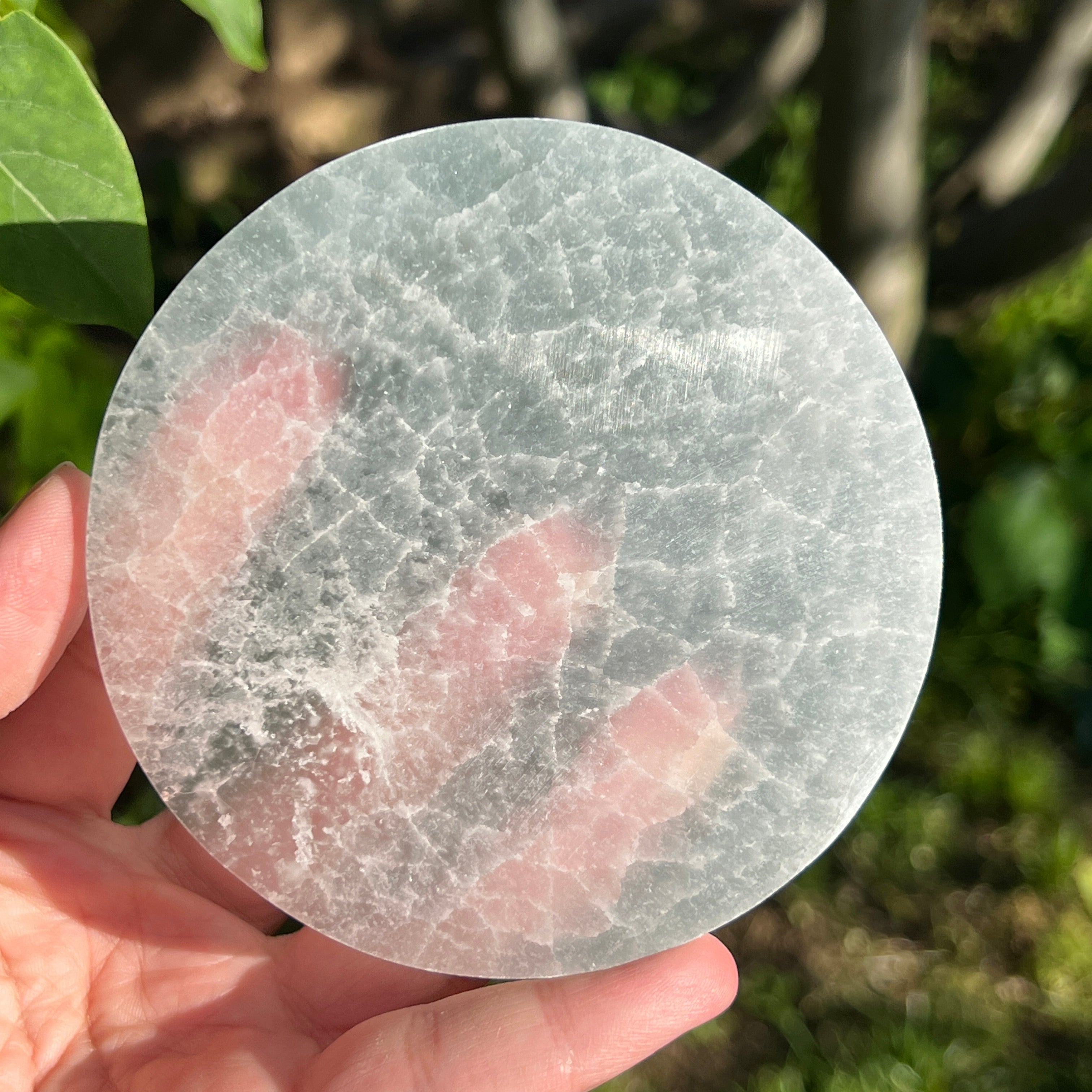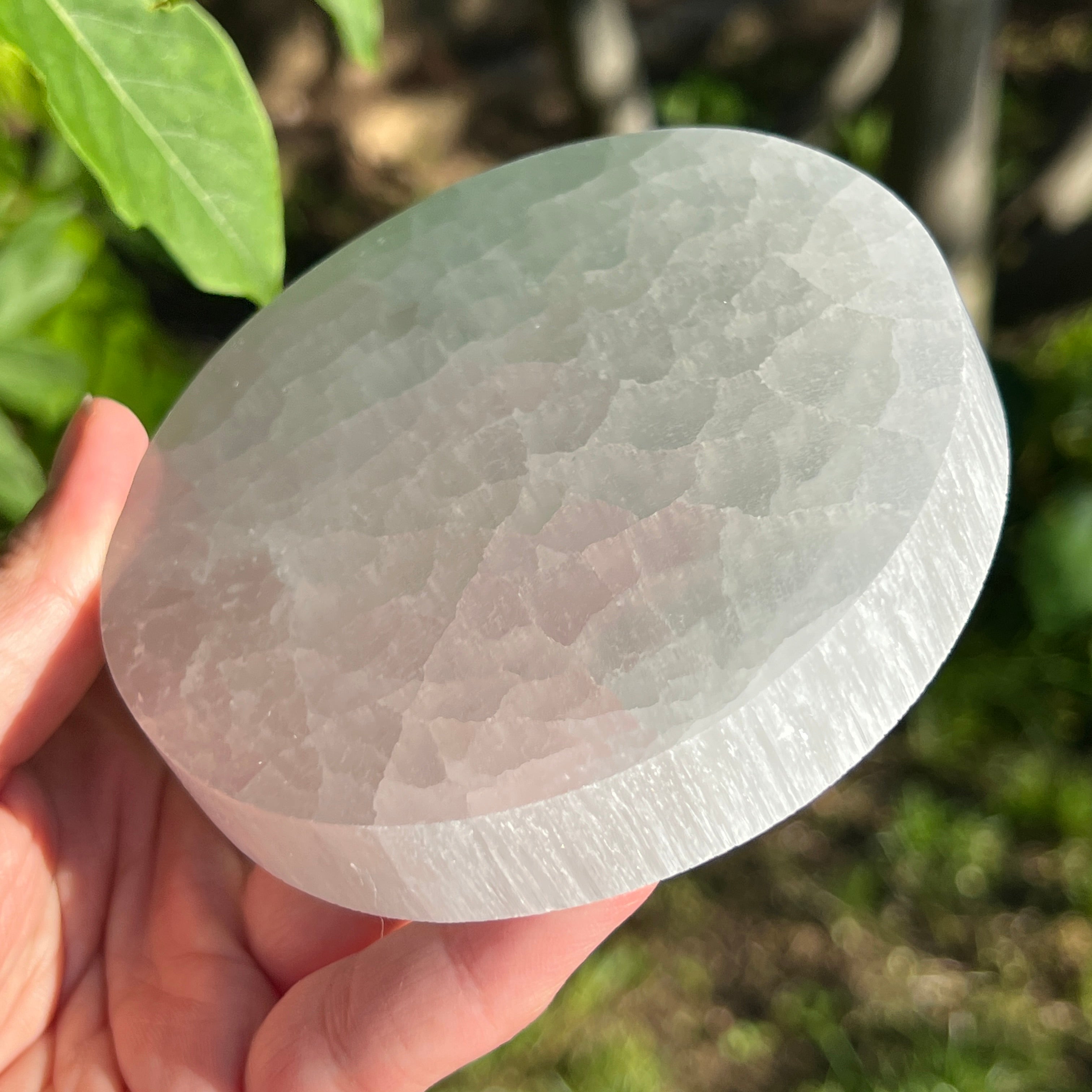 Tento marocký selenitový disk je kúskom anjelskej čistoty — mliečne biela zrkadlová plocha, ktorá odráža svetlo mesiaca v každom vlákne.