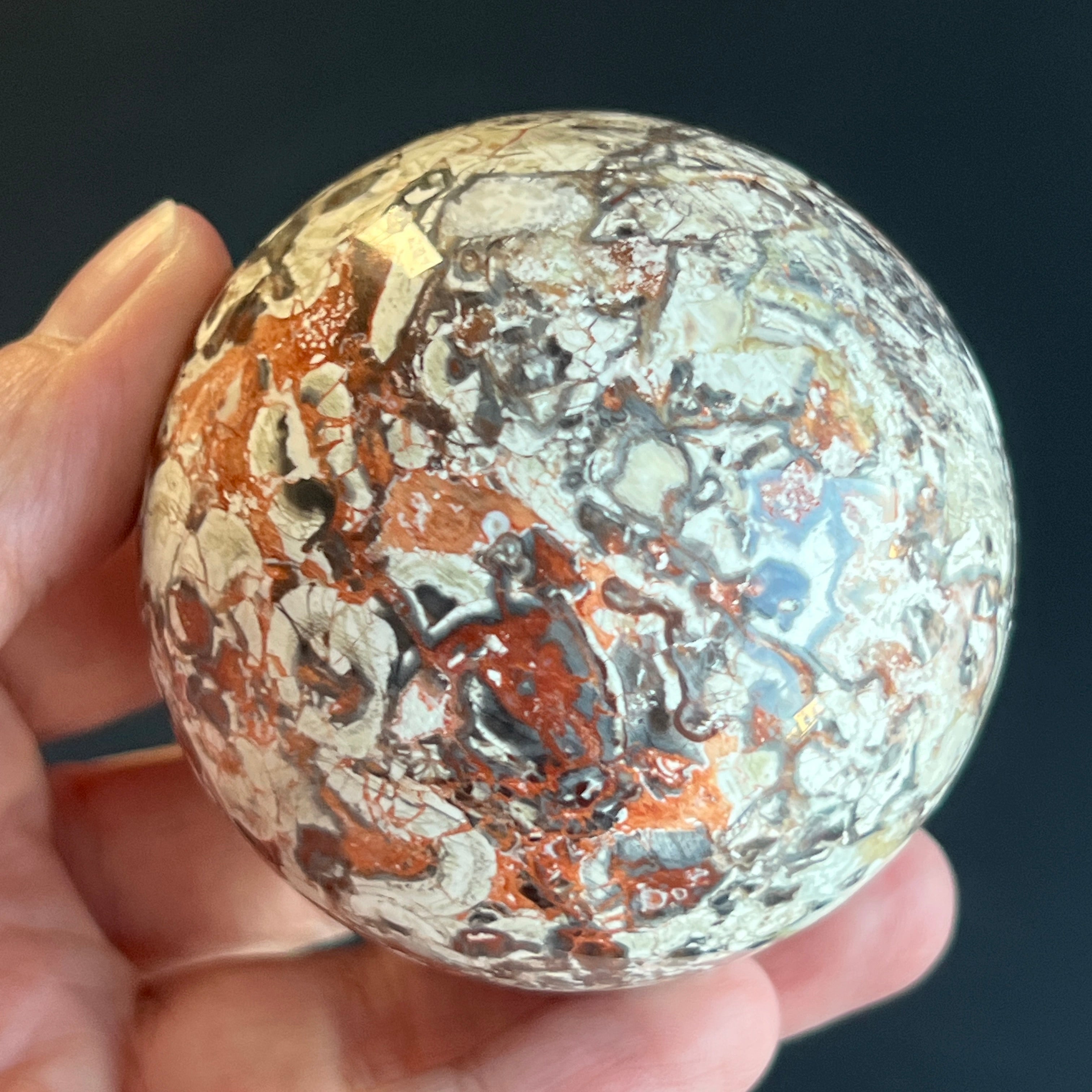 • Kameň: prírodný červený jaspis Breccia – celkom brúsená guľa